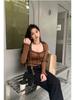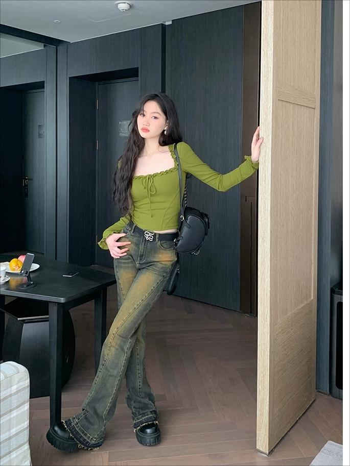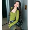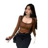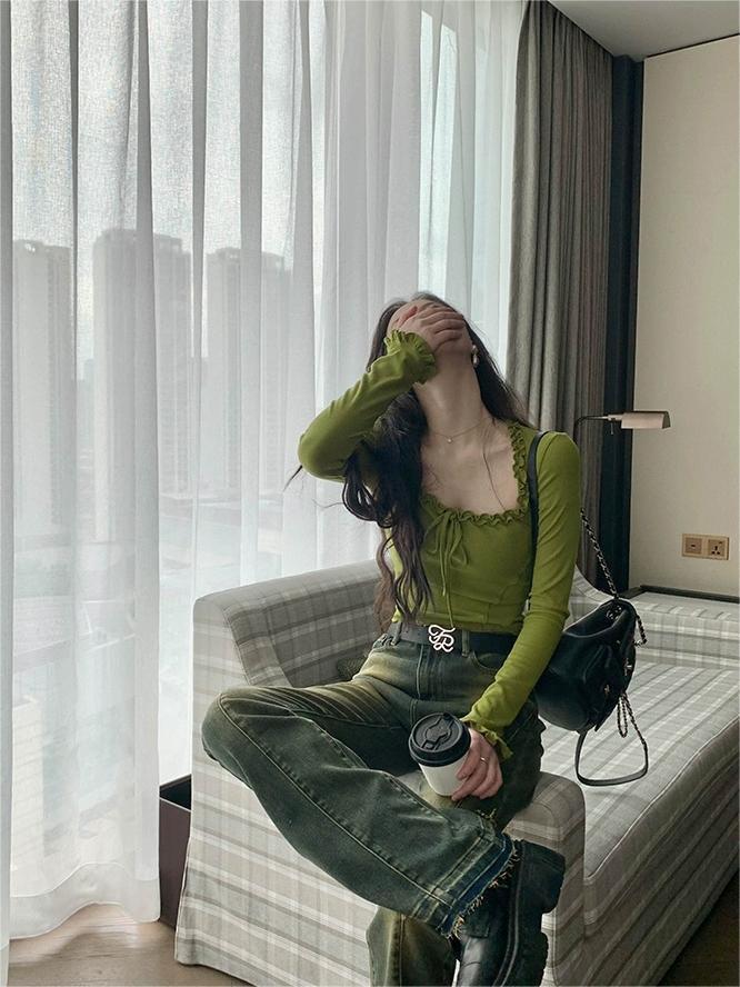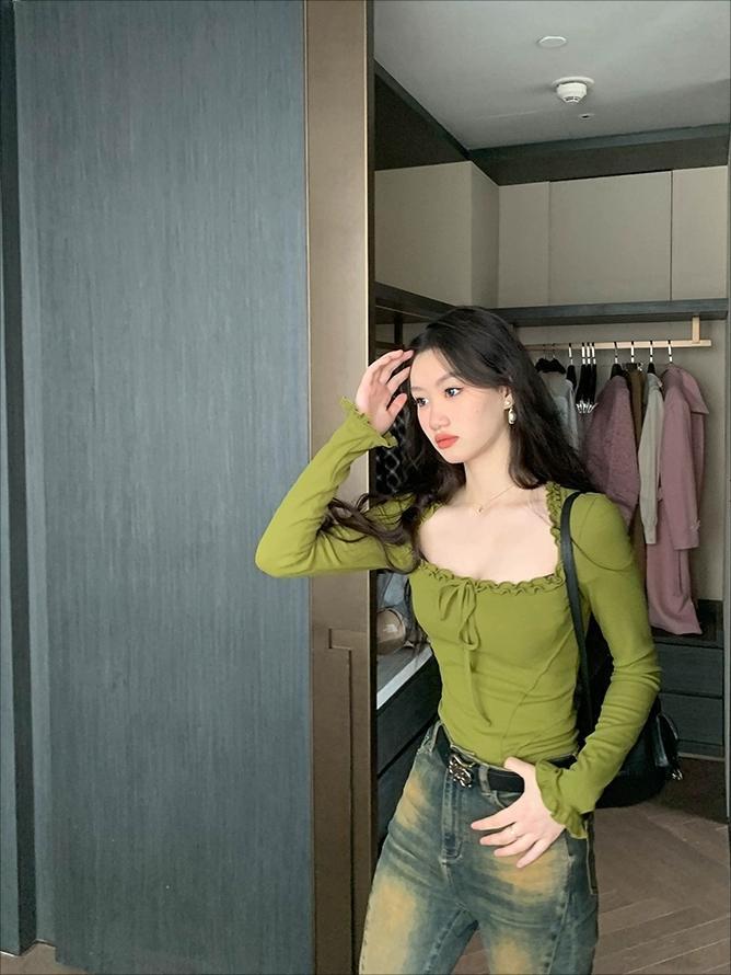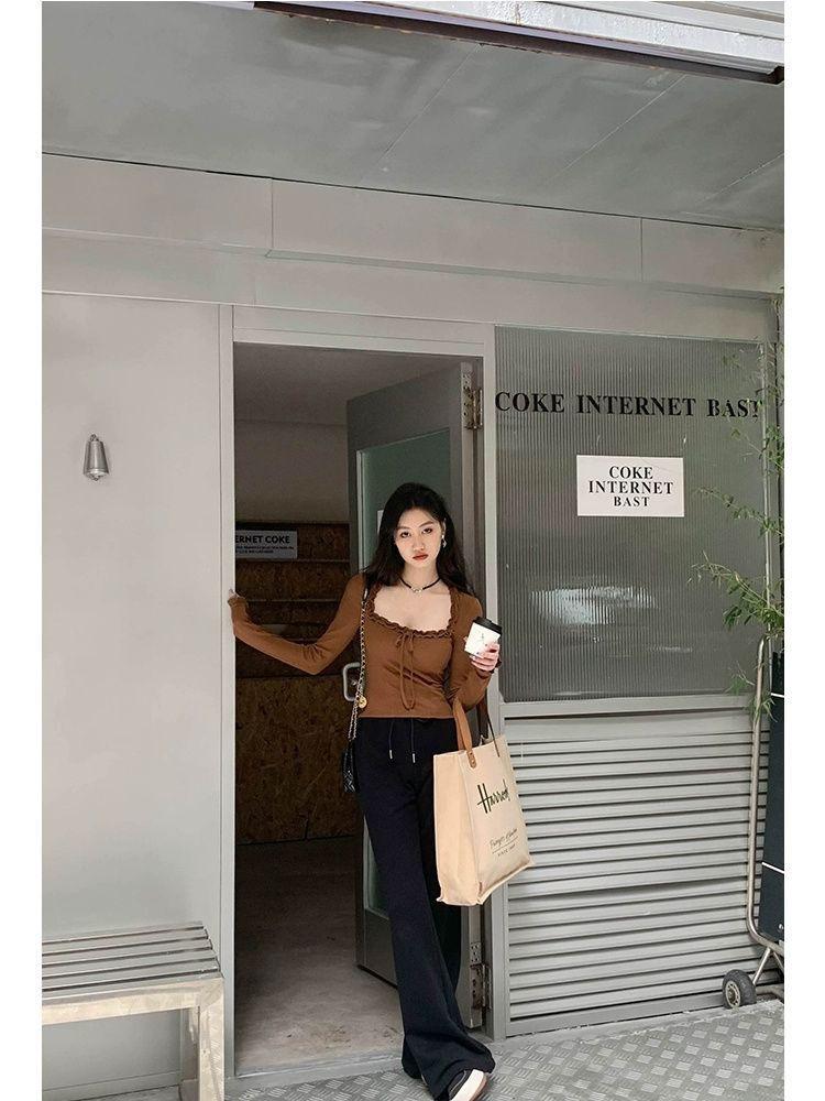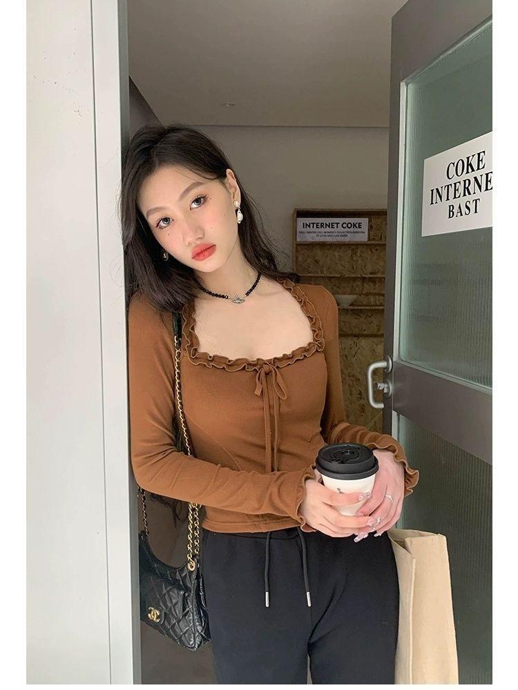 Sexy Nicho Encaje de Borde de Oreja Cuello Cuadrado Camiseta de Manga Larga Otoño Cintura Ajustada Ajustado Adelgazante Deseo Puro Top de Chica Caliente