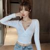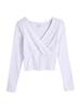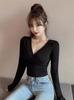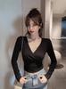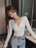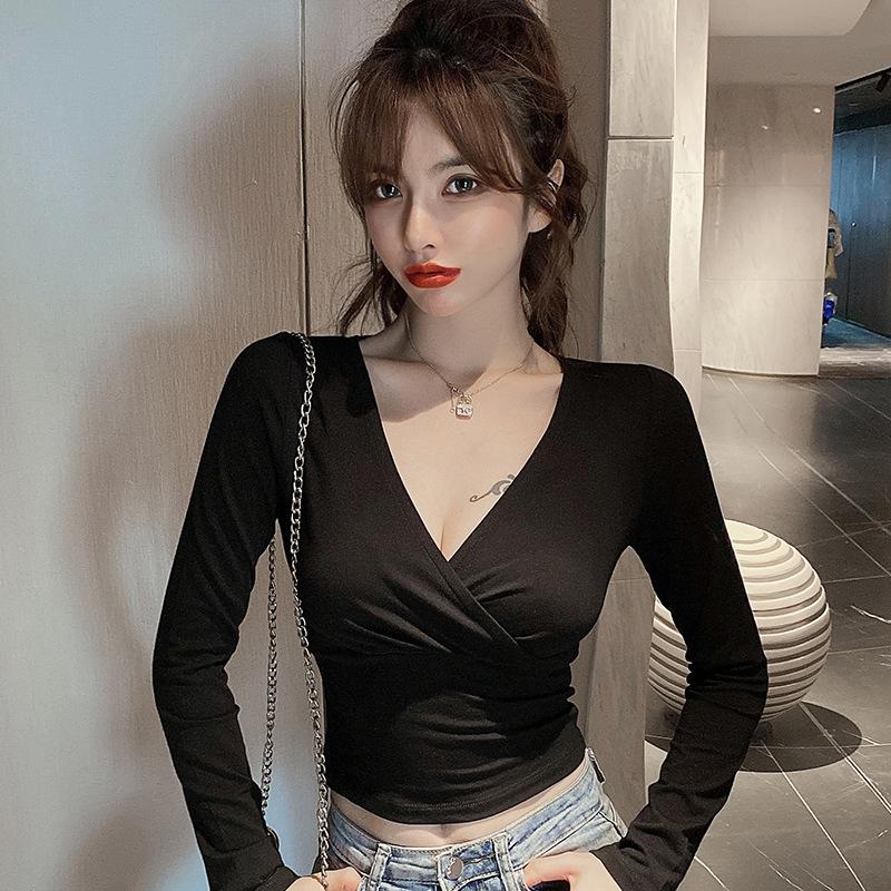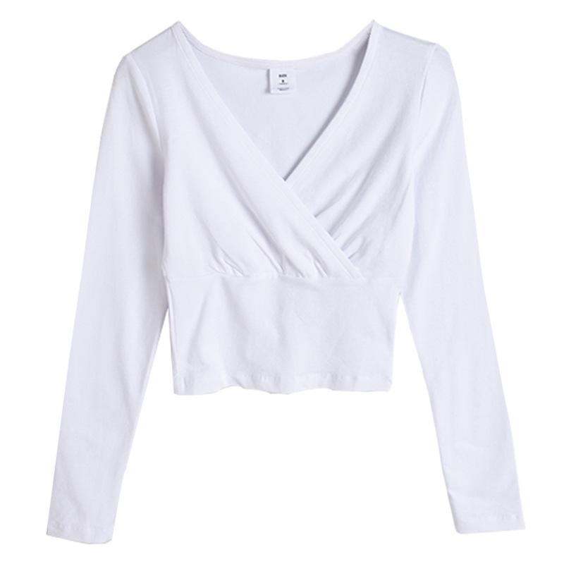 Camiseta de manga larga ajustada con cuello en V cruzado y diseño otoñal para chicas sexys, corta y con el ombligo al descubierto.