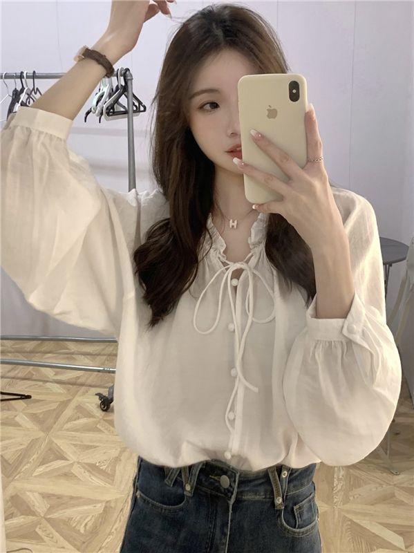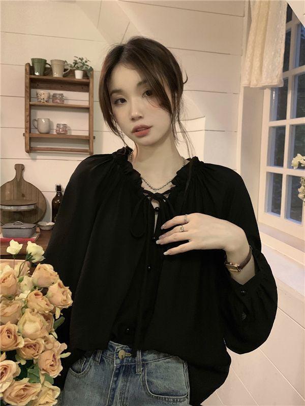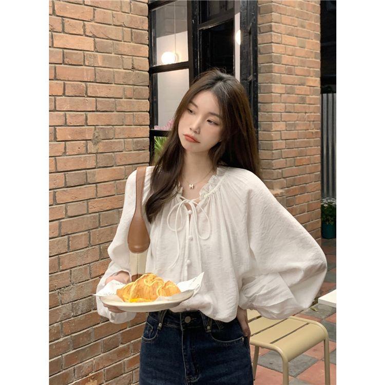 Nicho Slim Estilo Francés con Cordones Moda Camiseta de Manga Larga para Mujer Otoño Manga Linterna Diseño Sweet Spice Girl Top
