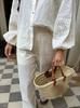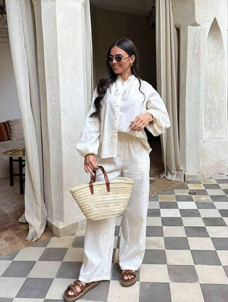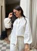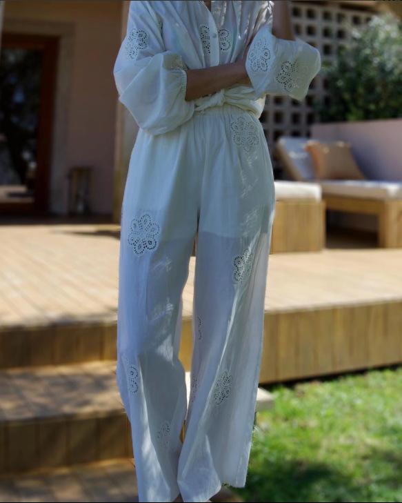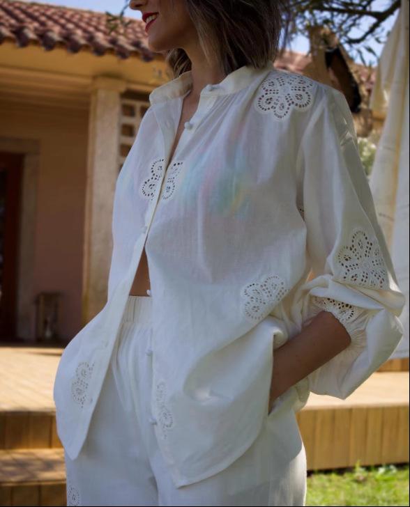 Primavera 2025 Nueva Venta al por Mayor Transfronteriza Camisa de Encaje Blanco Calado para Mujer Estilo Europeo y Americano Conjunto de Dos Piezas Elástico de Cintura Alta