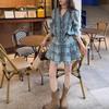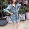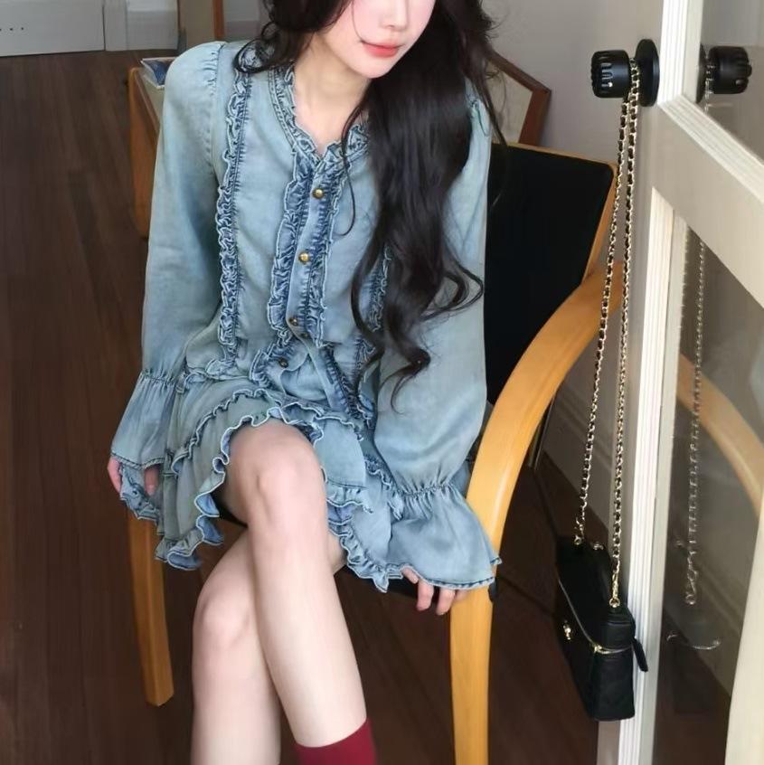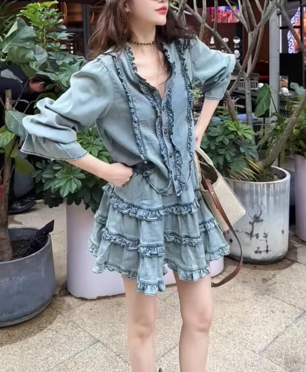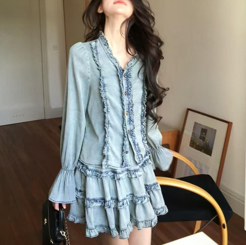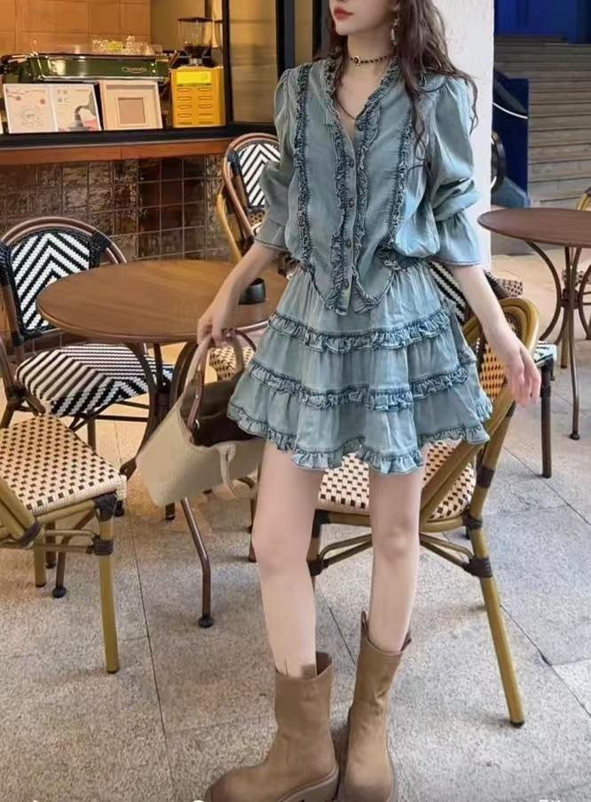 Traje de dos piezas con camisa vaquera y falda plisada y escote en V para mujer, primavera 2025, diseño retro dulce