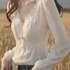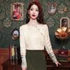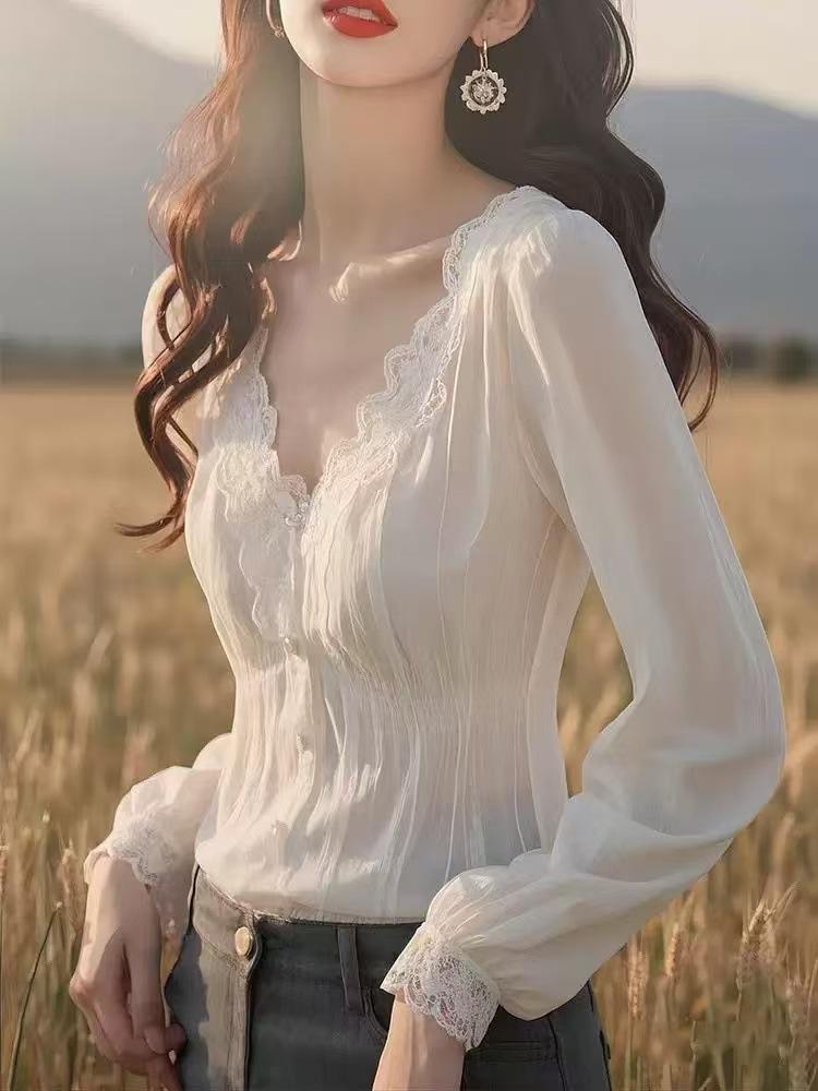 Camisa de cuello en V de encaje blanco, estilo francés, elegante, estilo occidental, de lujo, para primavera.