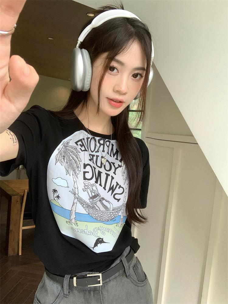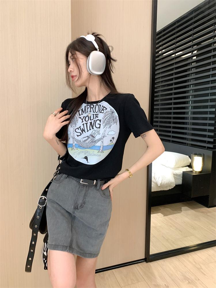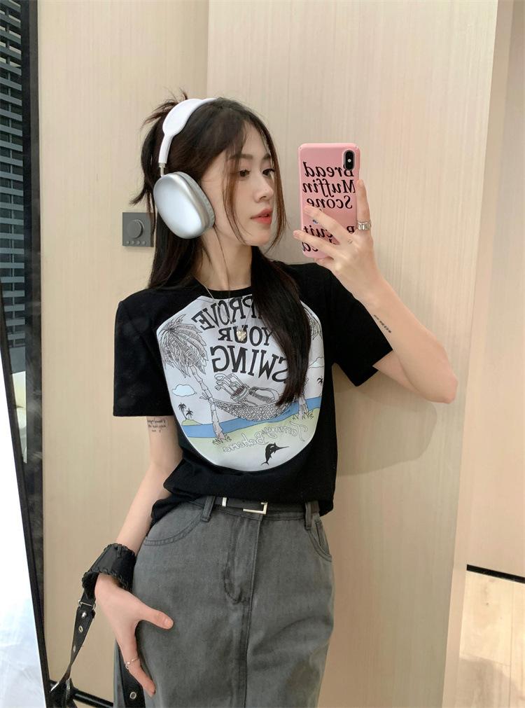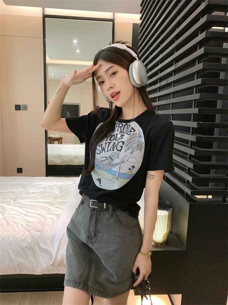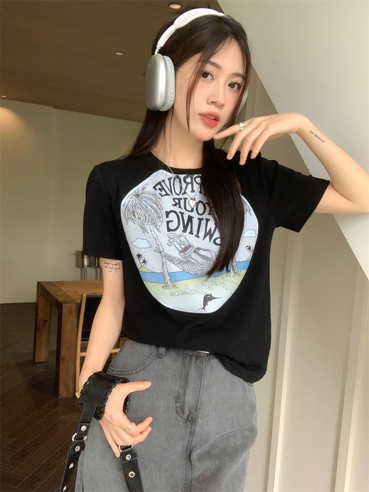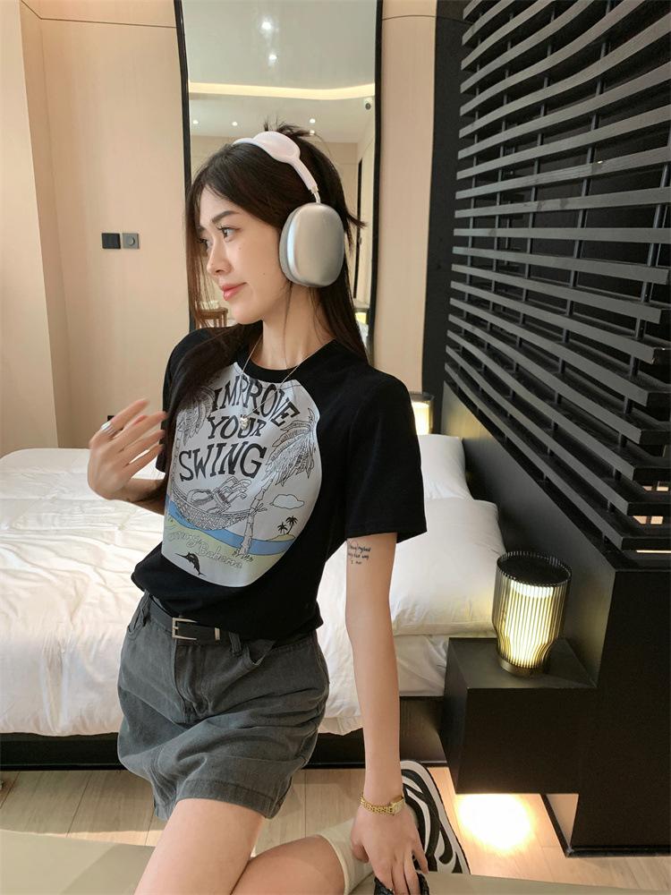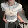 Camiseta Top de Manga Corta con Cuello Redondo y Corte Ajustado Estilo Retro Chic Coreano, Algodón Puro Estilo Americano con Hombro Regular para Mujer