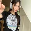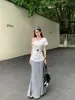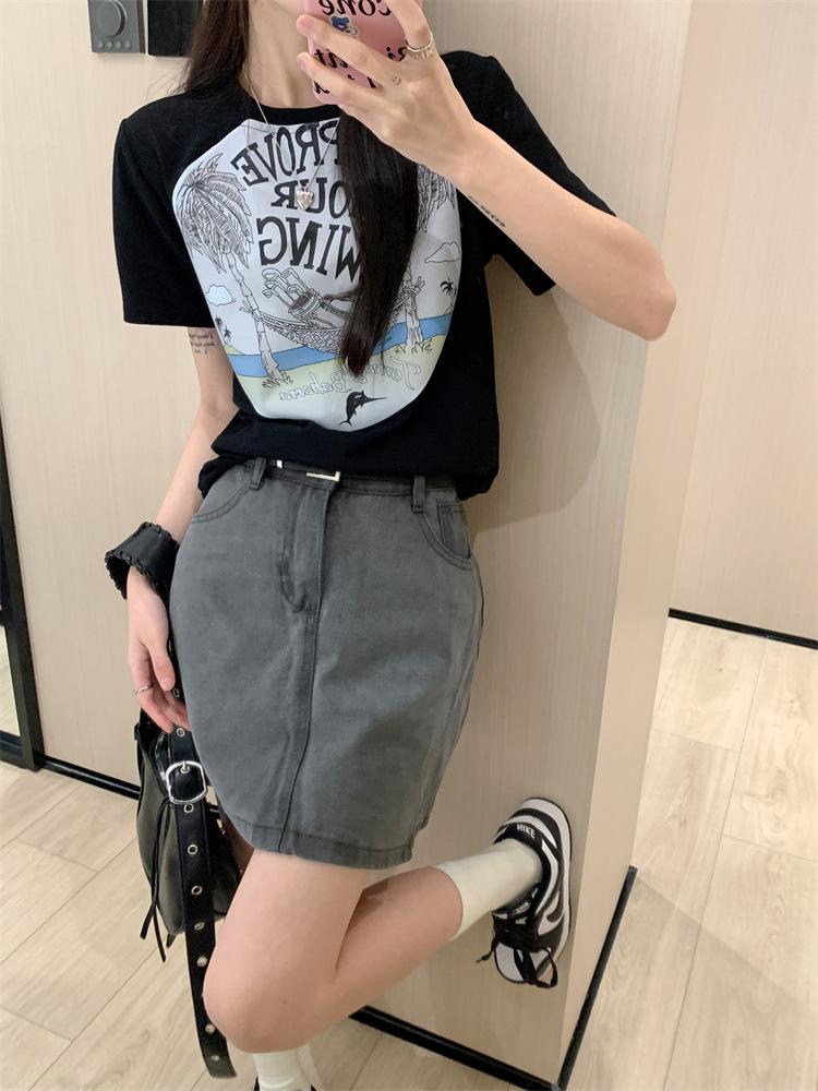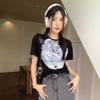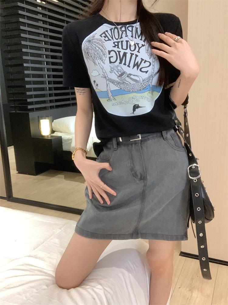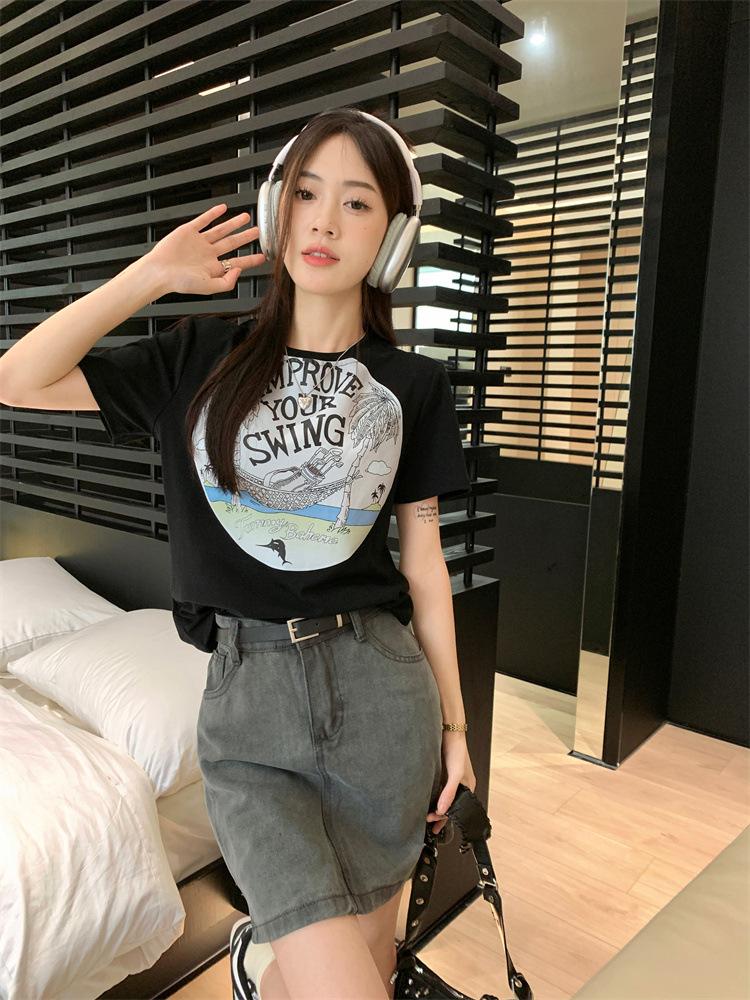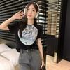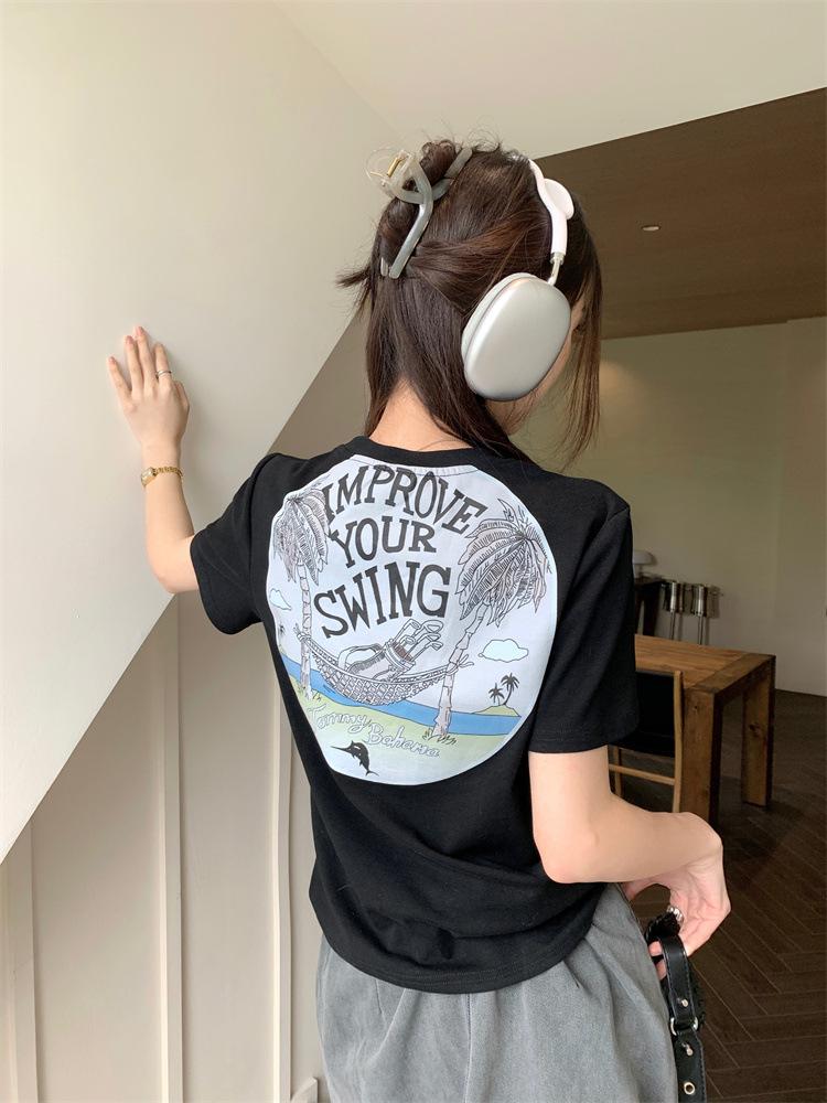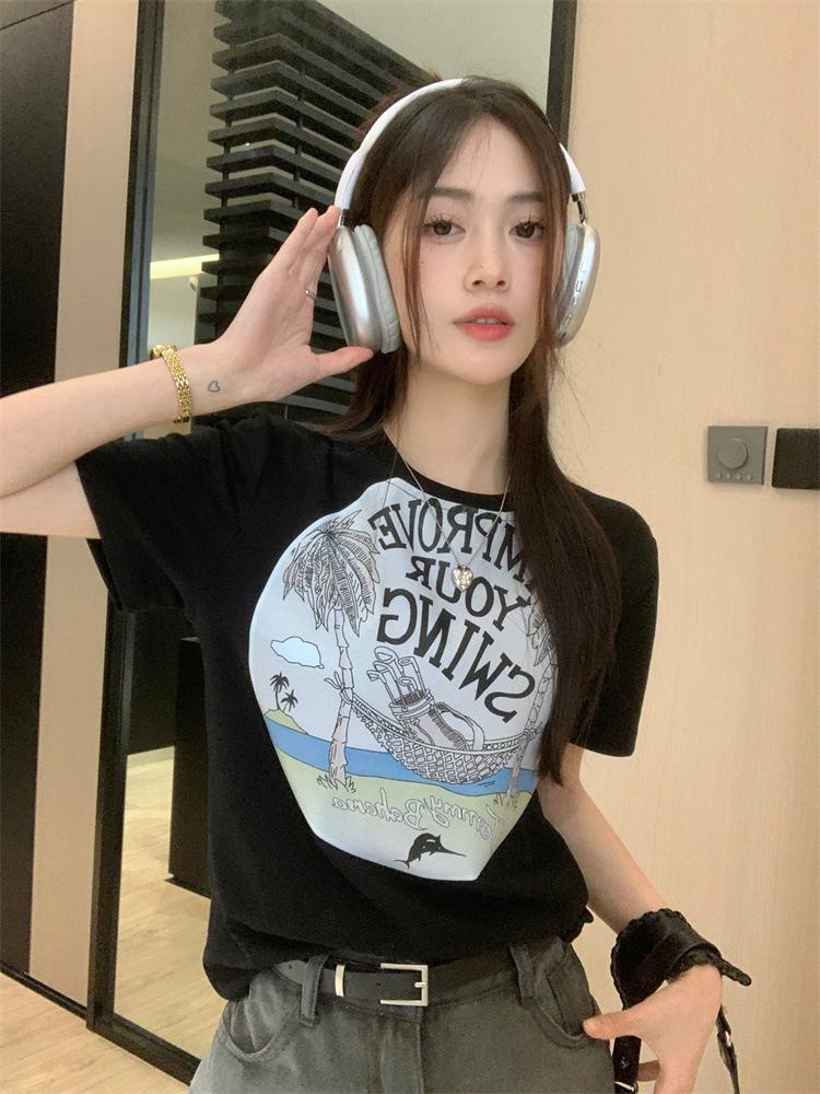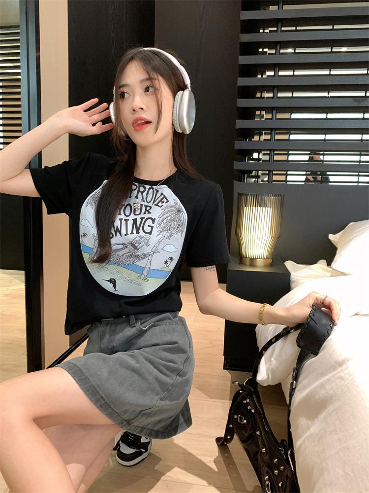 Camiseta Top de Manga Corta con Cuello Redondo y Corte Ajustado Estilo Retro Chic Coreano, Algodón Puro Estilo Americano con Hombro Regular para Mujer