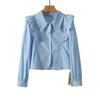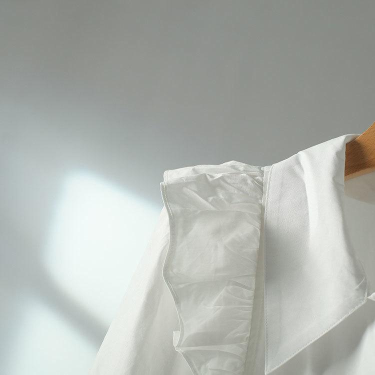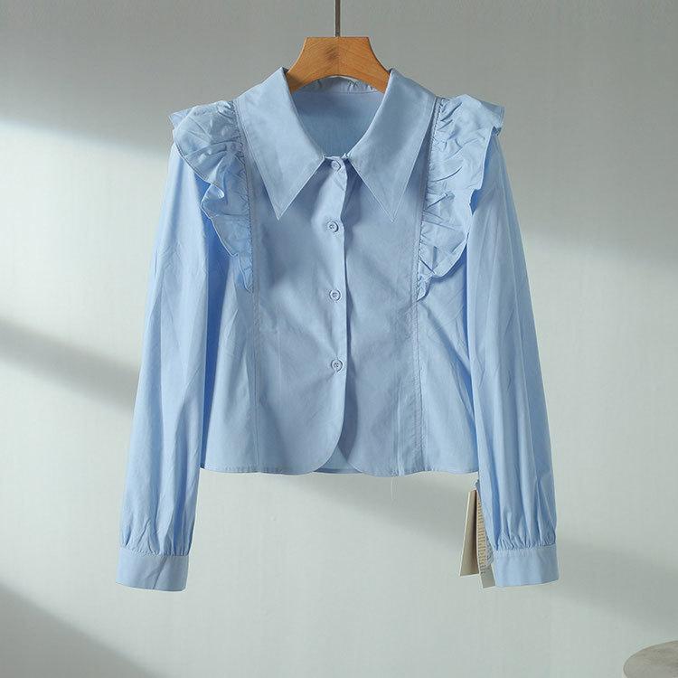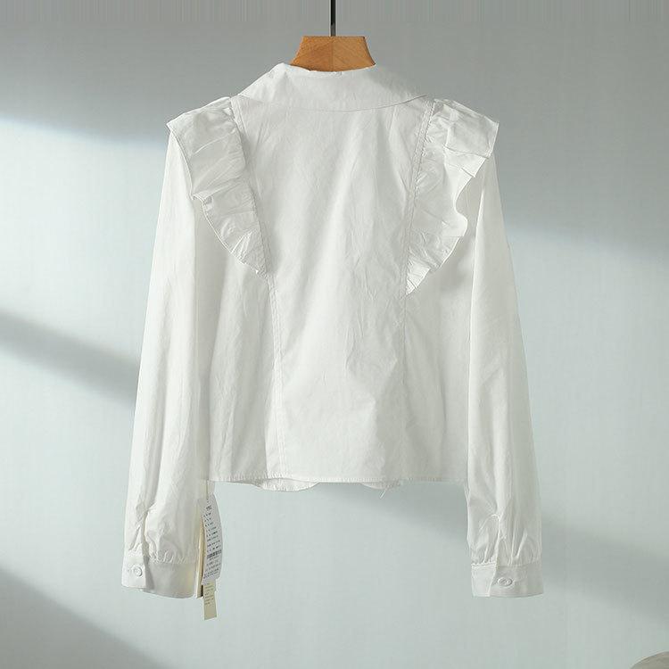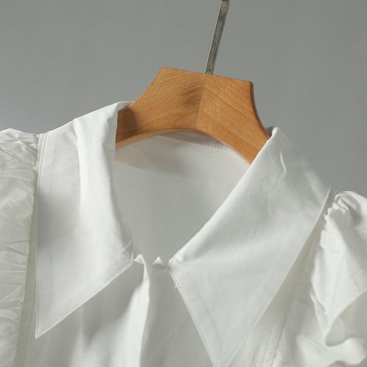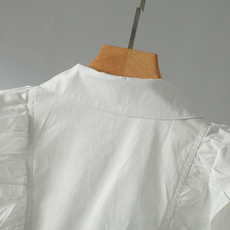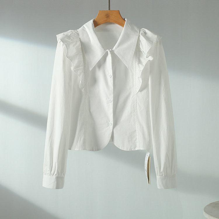 Camisa retro con volantes de algodón puro estilo francés para mujer, elegante, combinable con todo, corte entallado, mangas abullonadas, primavera 2024