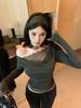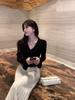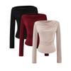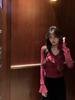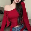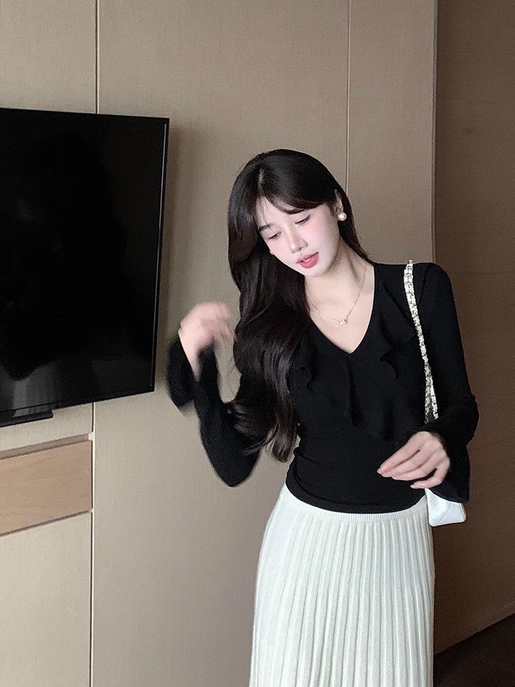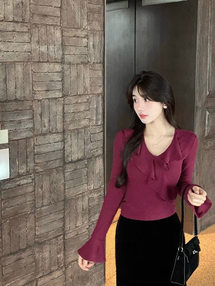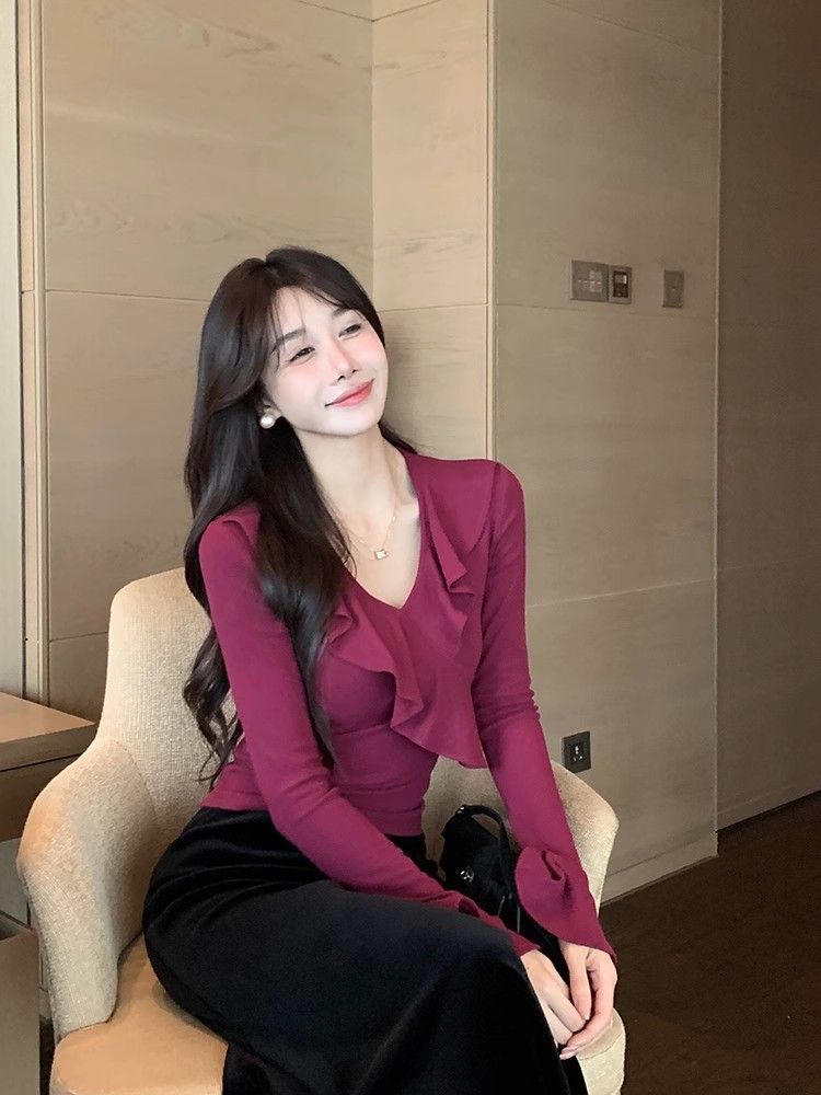 Nueva Camiseta Elegante Irregular de Moda Spice Girl Adelgazante de Corte Slim Otoño Estilo Deseo Puro con Volantes Cuello en V Manga Larga