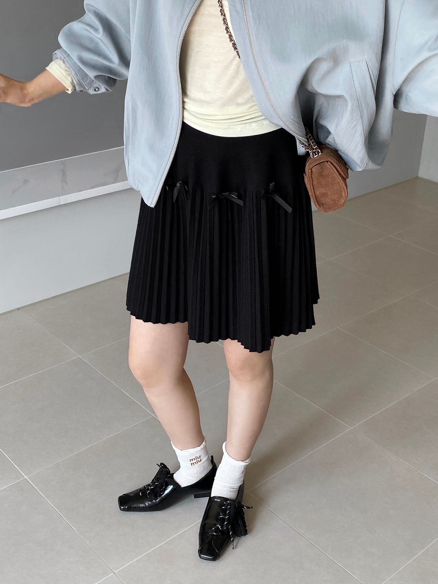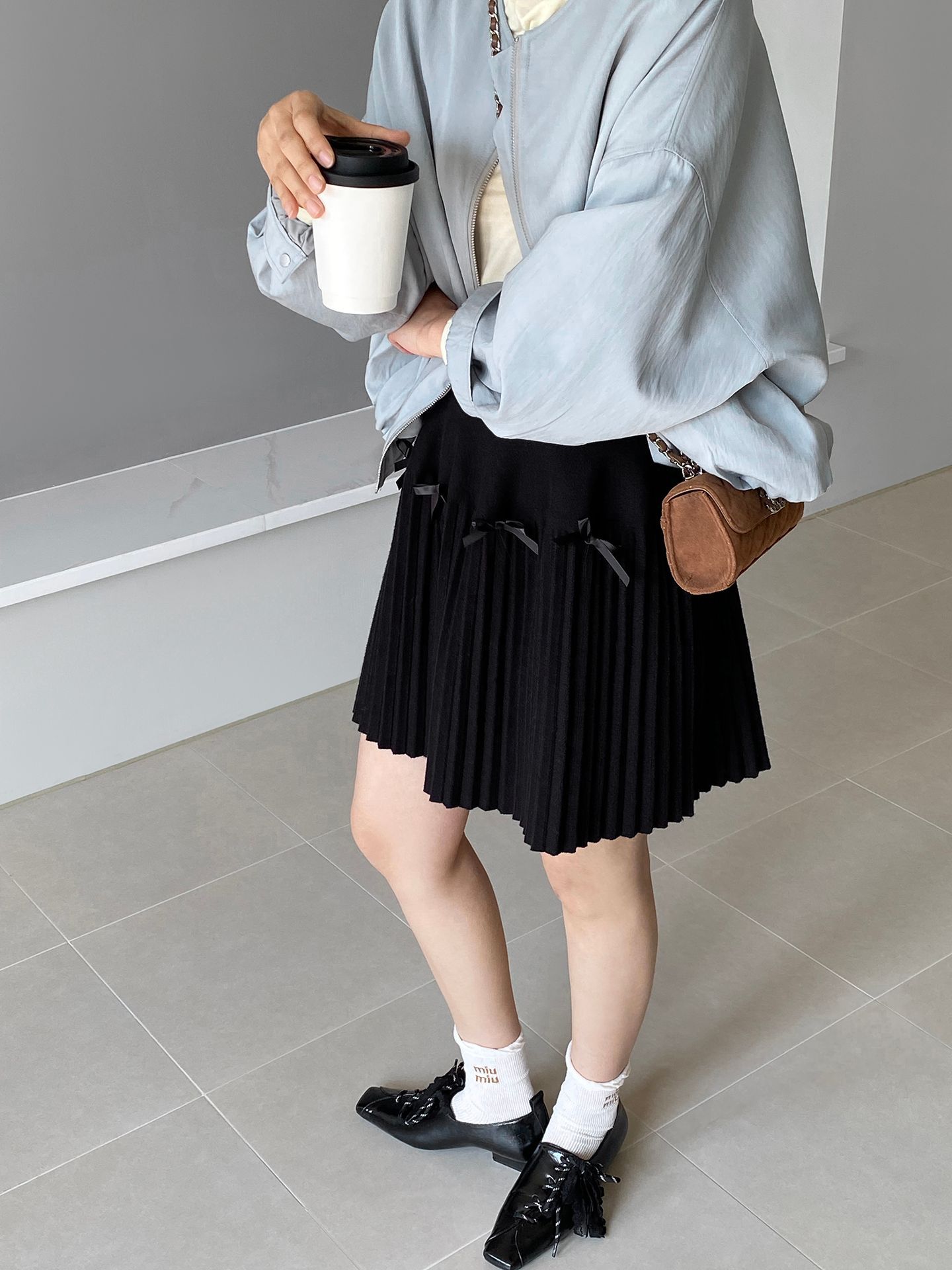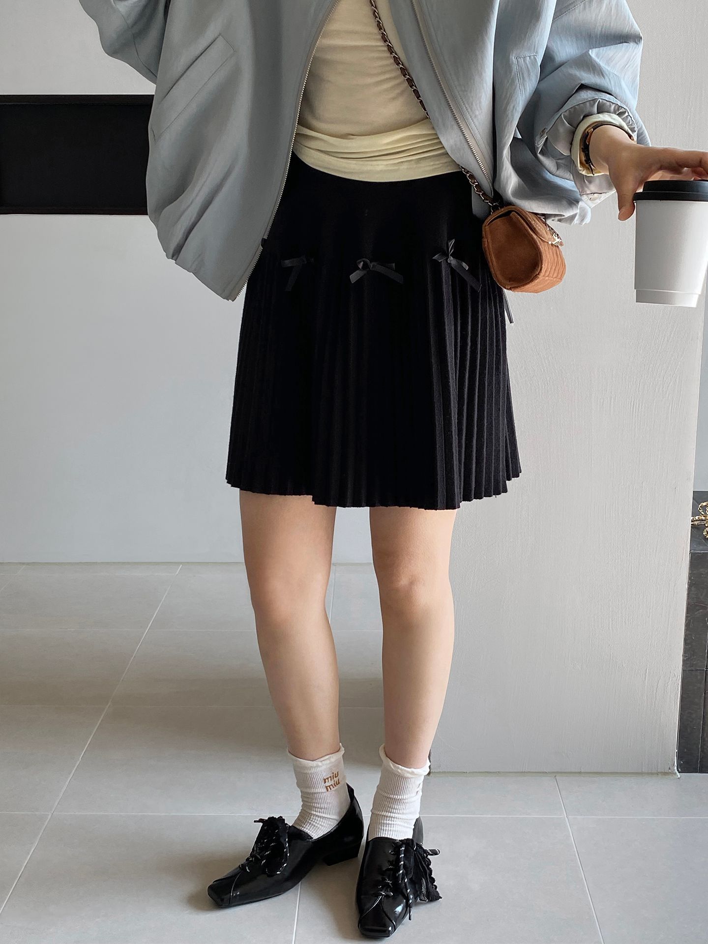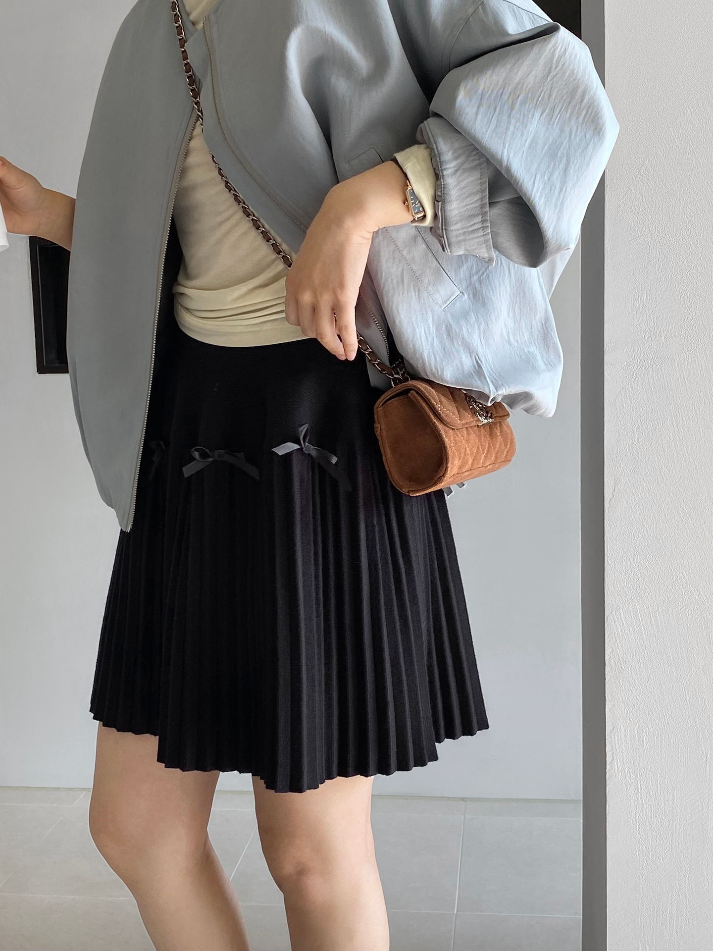 Falda plisada Jiangzuo Miu estilo universitario, cintura alta, lazo, para mujer, de punto, primavera y verano, 9016