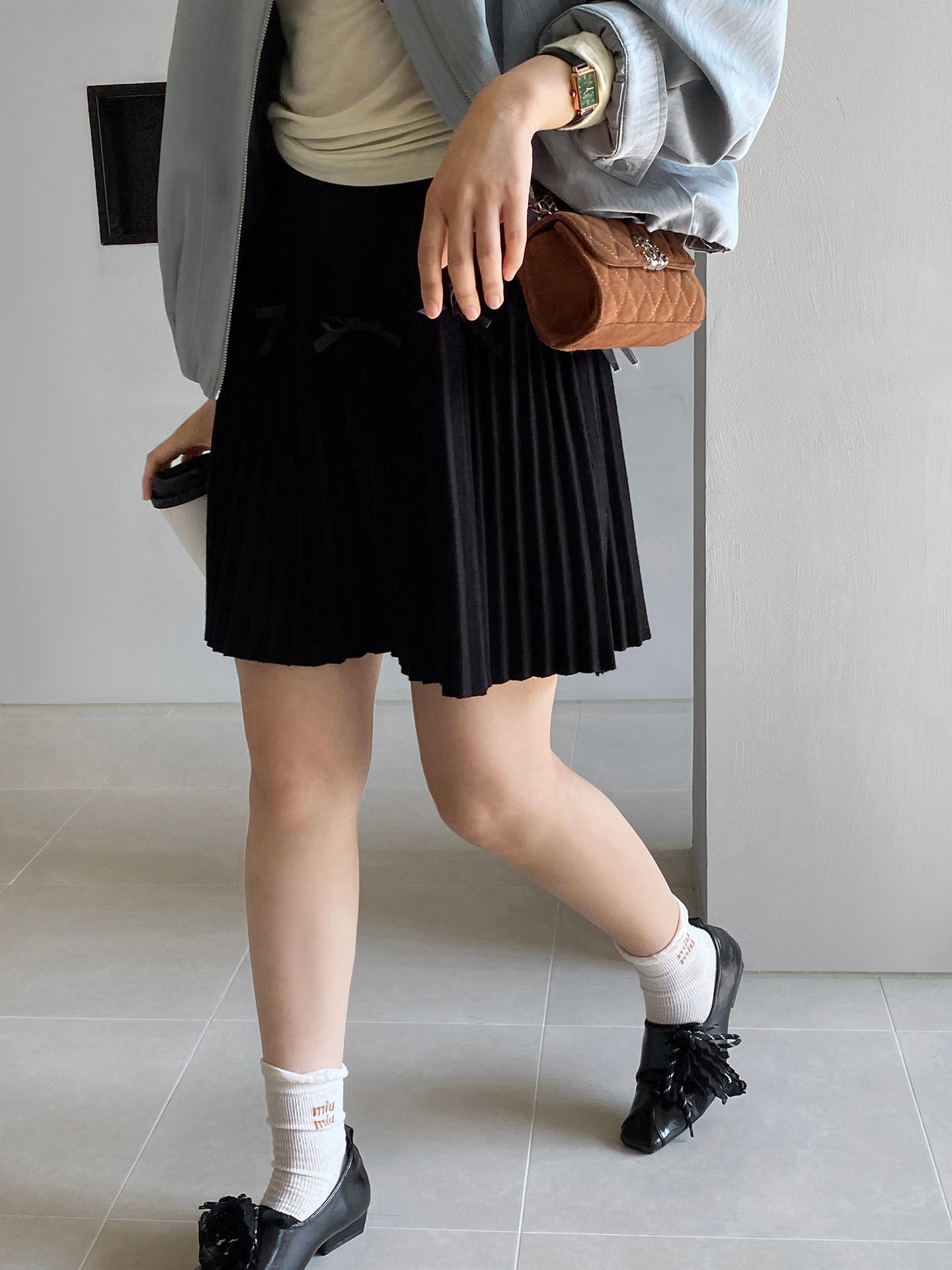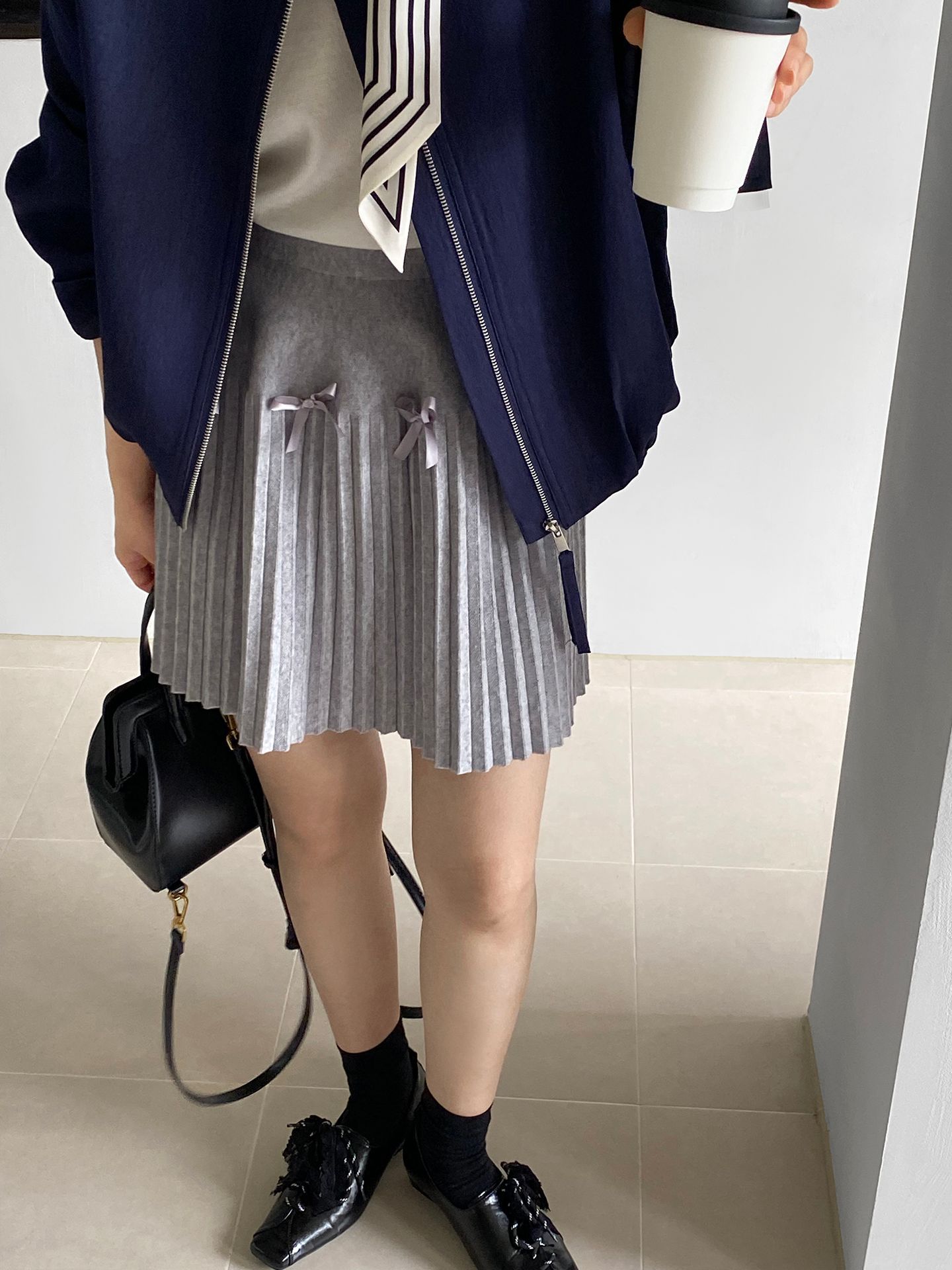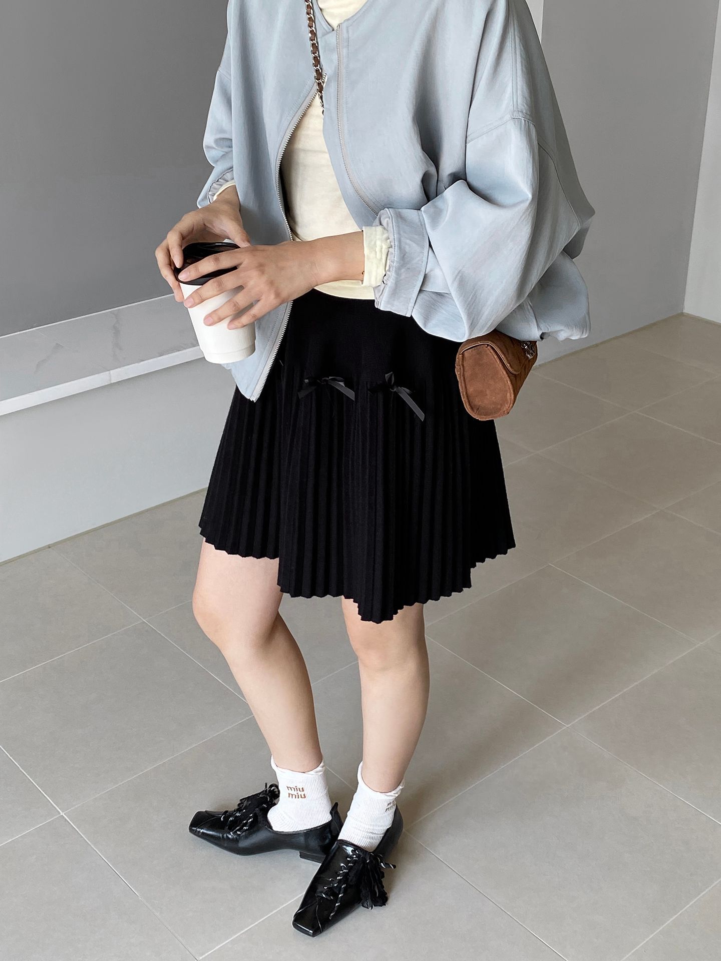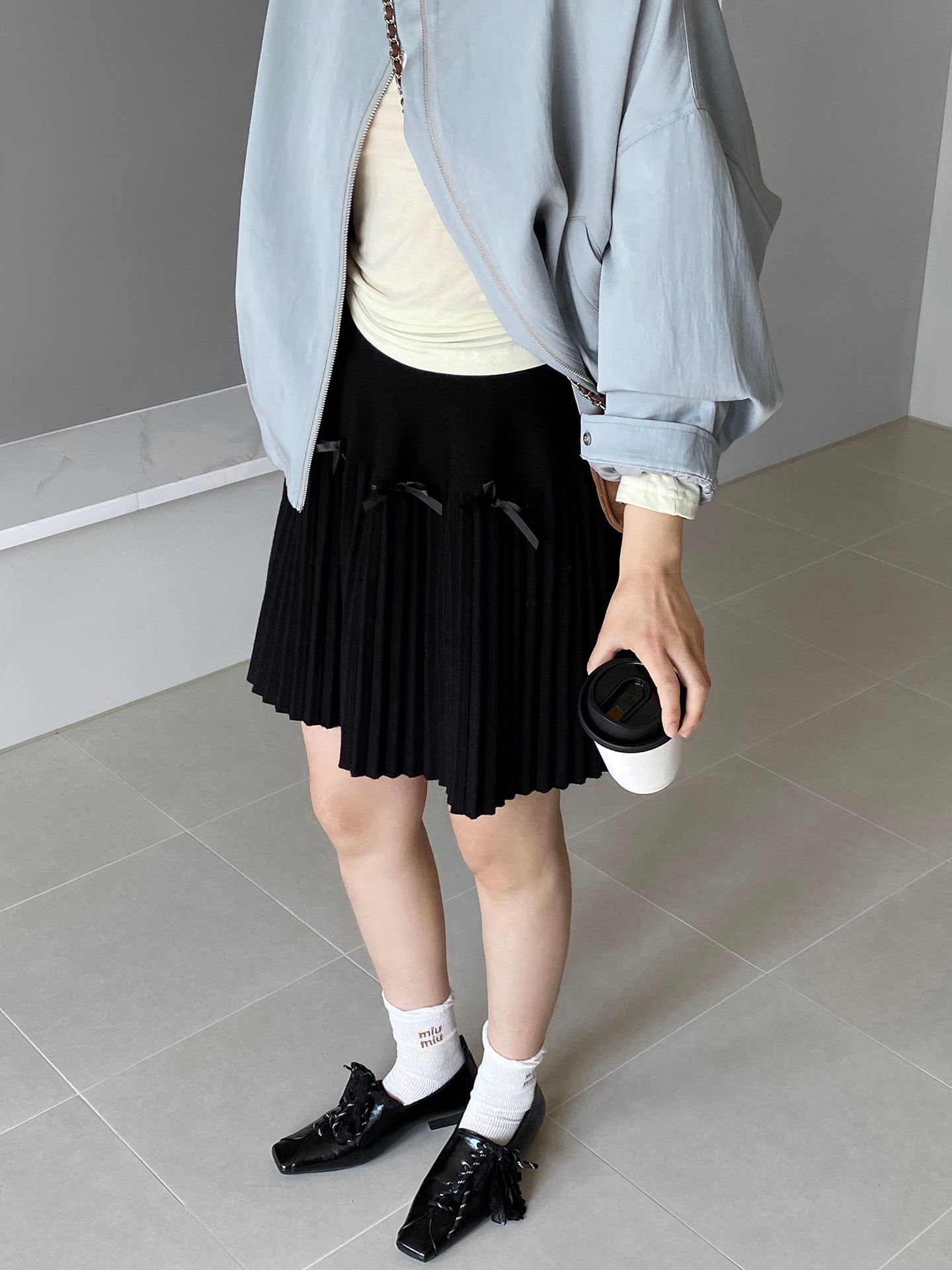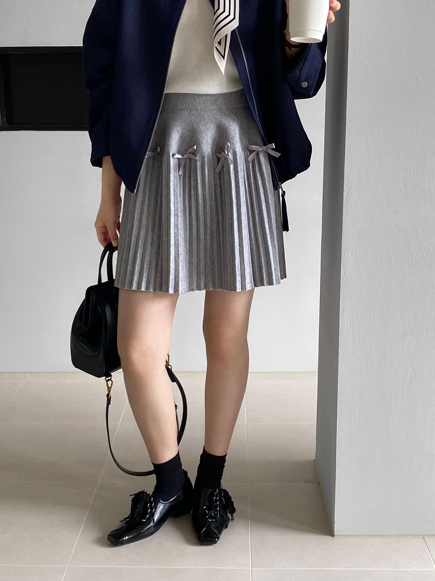 Falda plisada Jiangzuo Miu estilo universitario, cintura alta, lazo, para mujer, de punto, primavera y verano, 9016