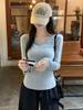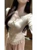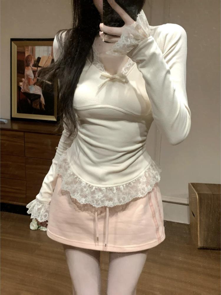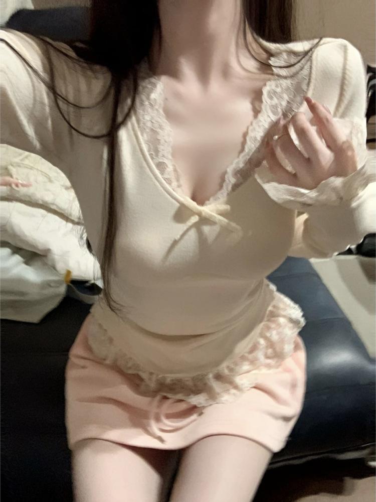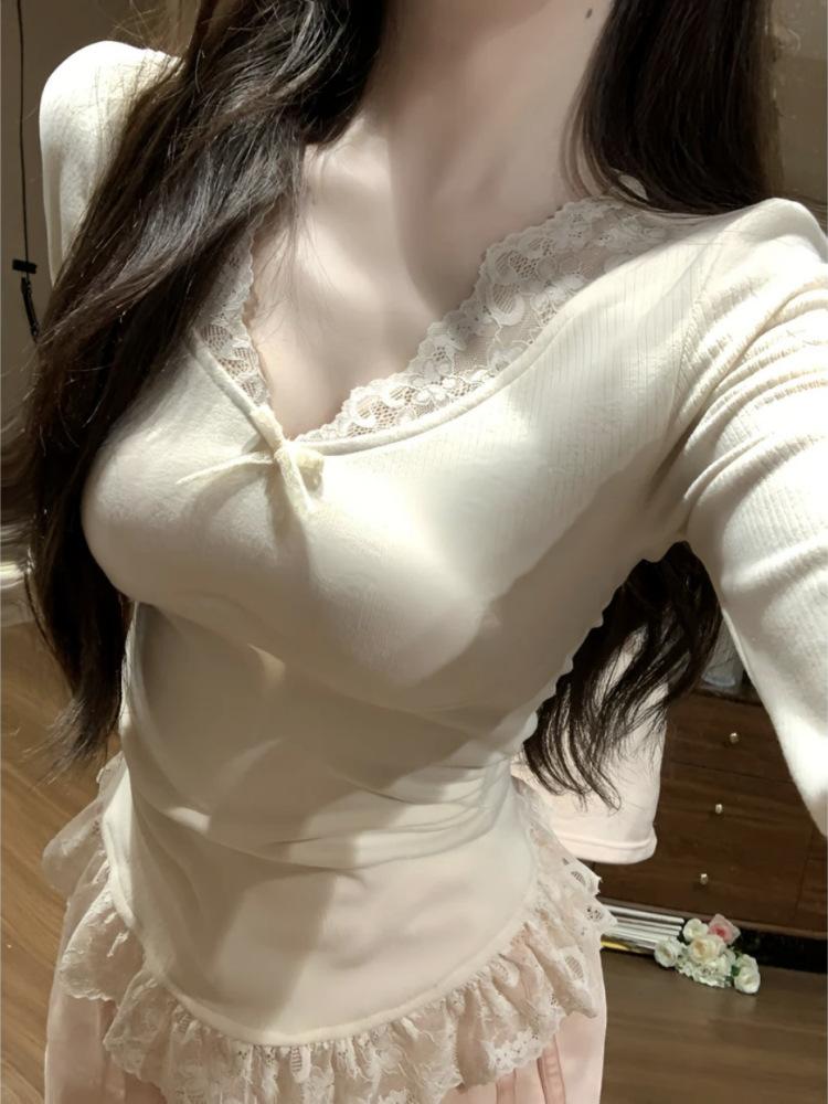 Camiseta de manga larga con escote en V y lazo con costuras de encaje adelgazantes de estilo Spice Girls. Top de moda sexy de nicho.