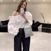 Camisa estilo jersey de color liso con cuello de una sola línea, plisada, con cordones y mangas abullonadas para mujer.
