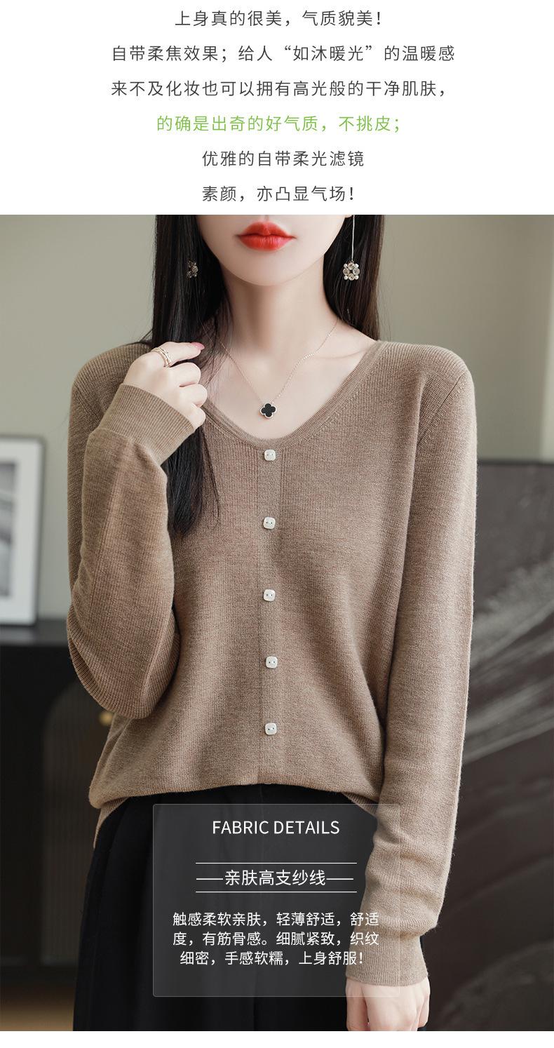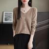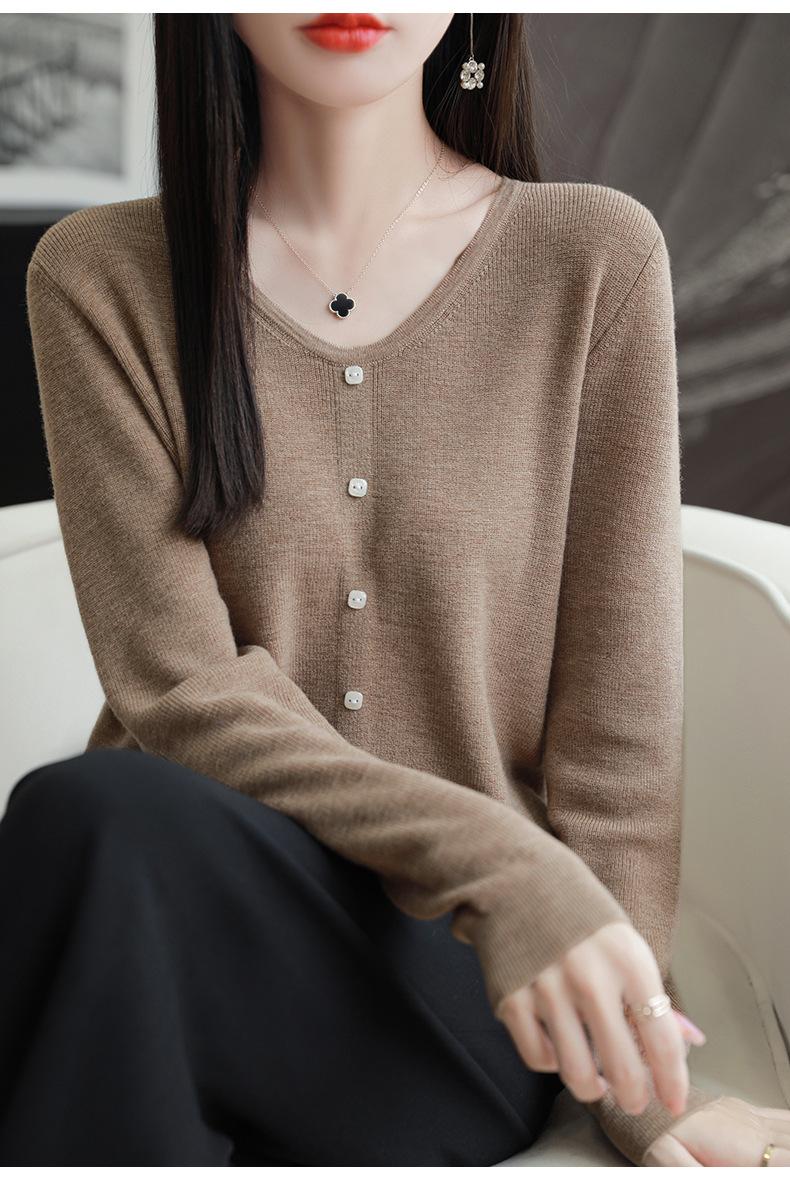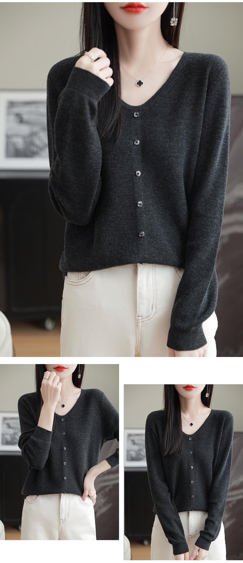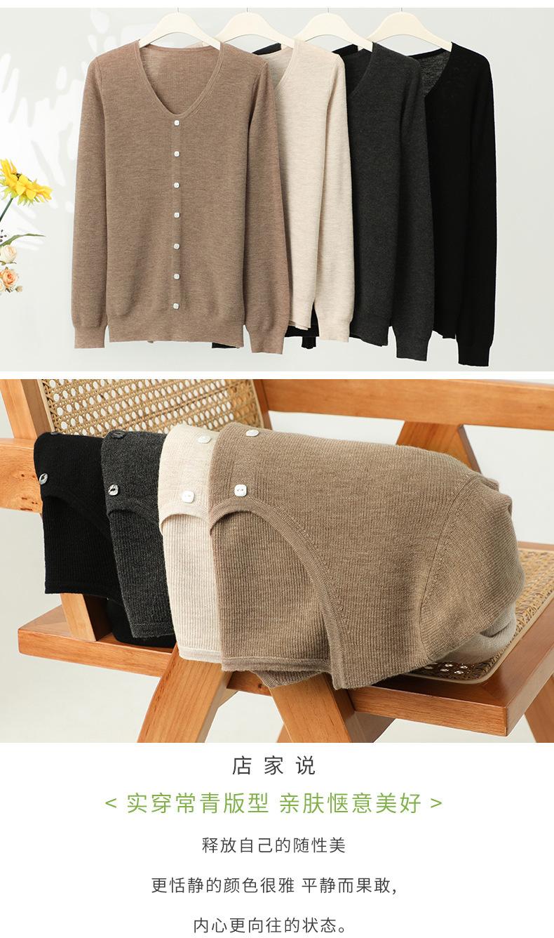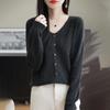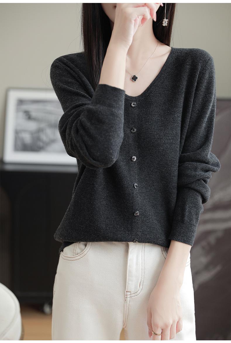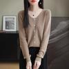 Elegante cárdigan de lana 100% peinada con cuello en V para mujer, color liso, holgado, informal, sencillo, de un solo pecho