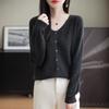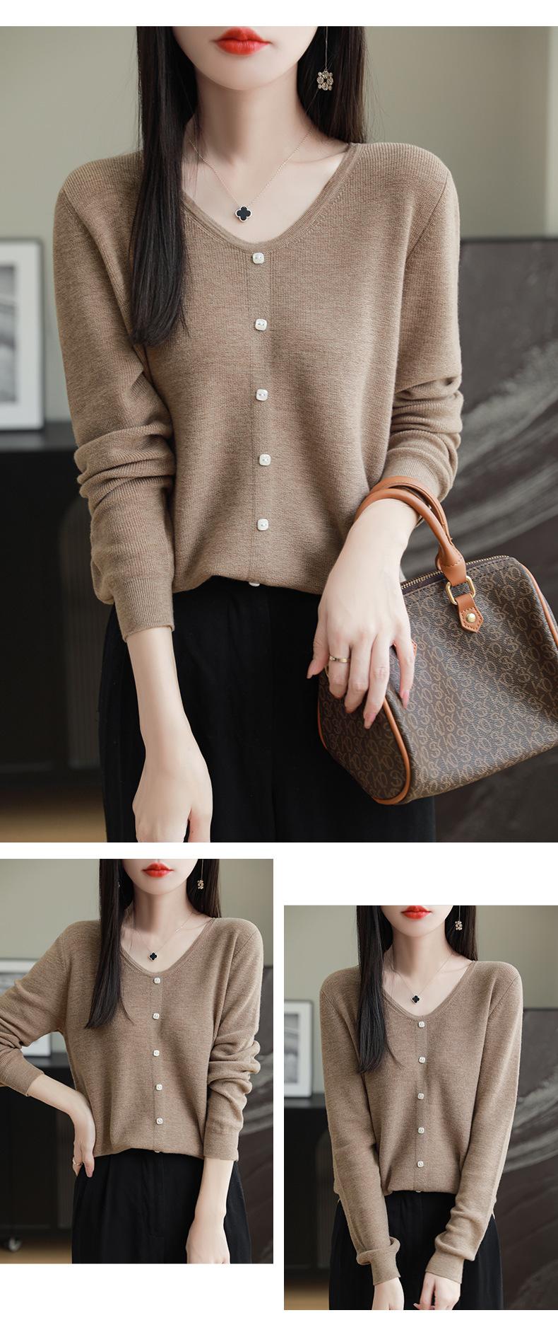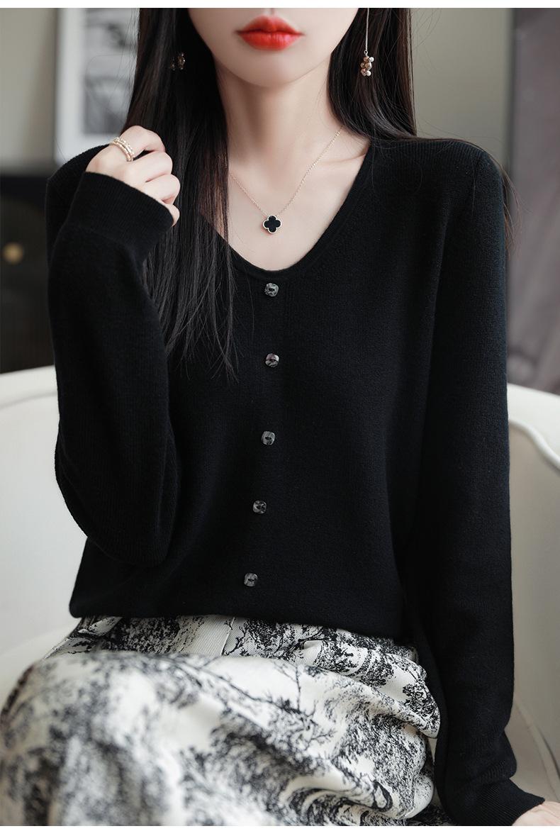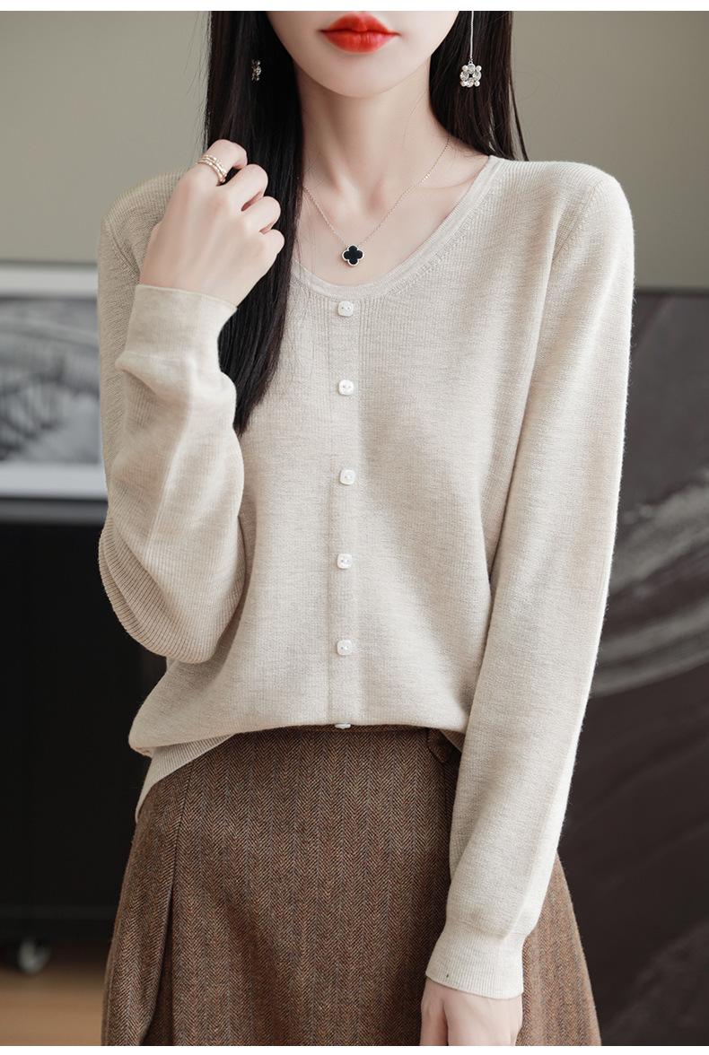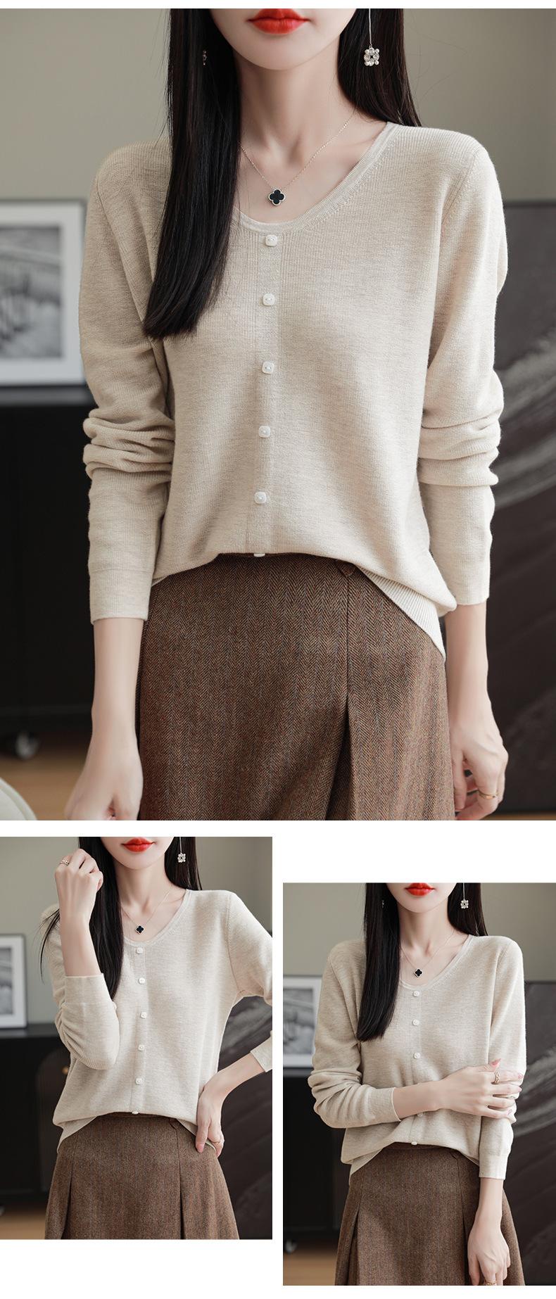 Elegante cárdigan de lana 100% peinada con cuello en V para mujer, color liso, holgado, informal, sencillo, de un solo pecho