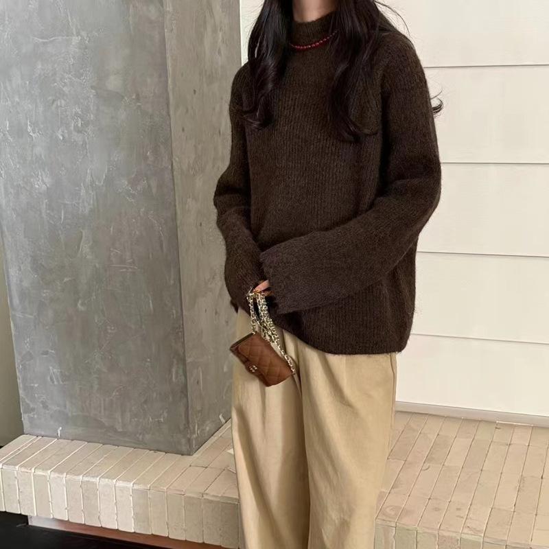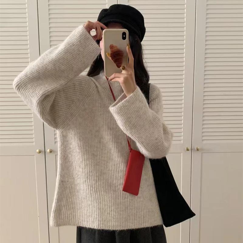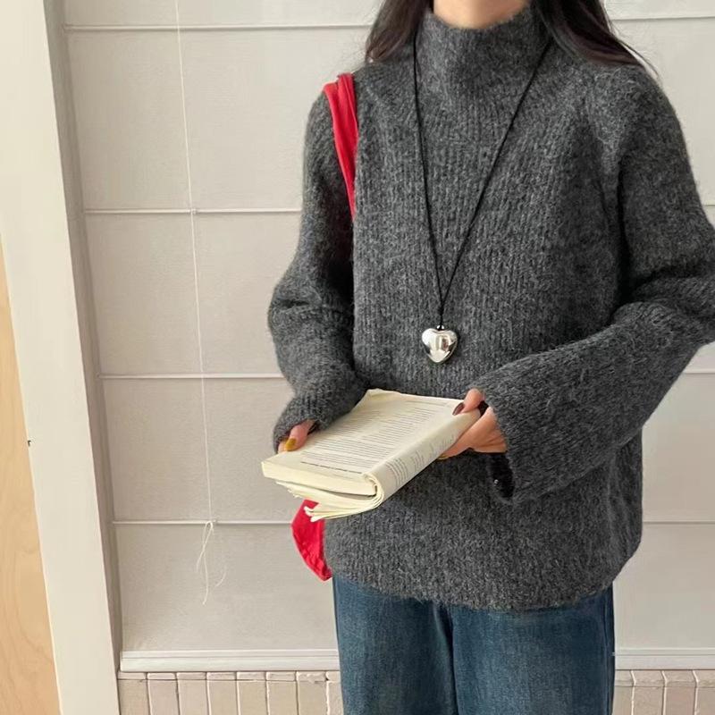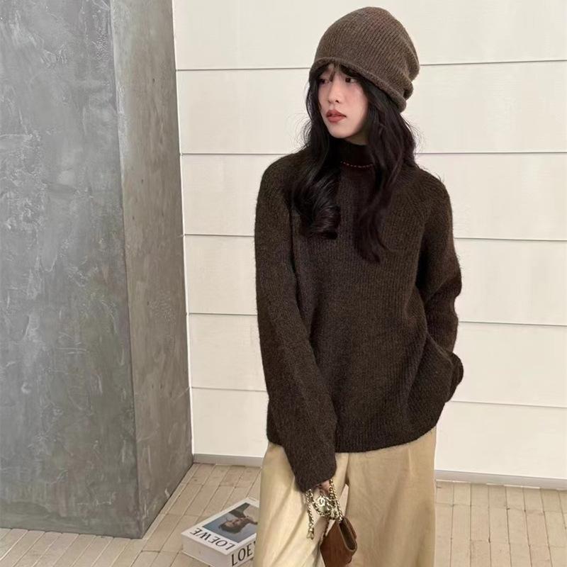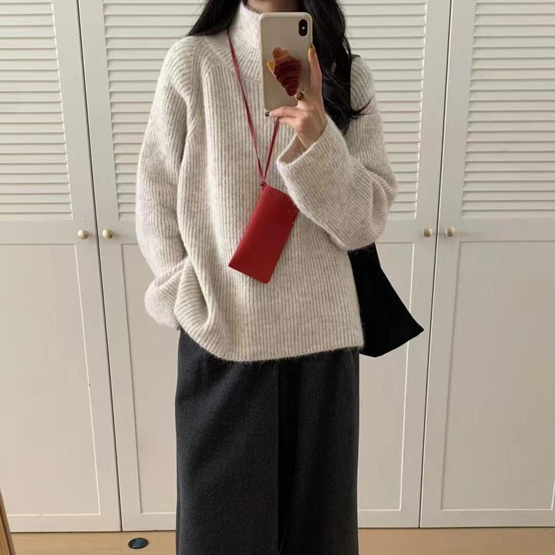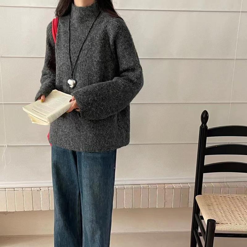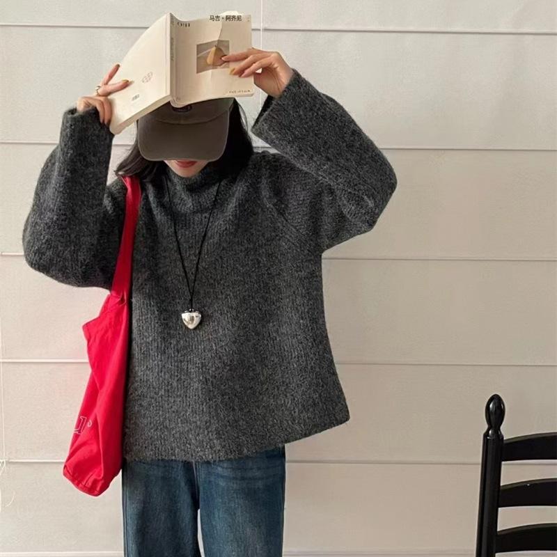 Suéter de Punto Largo de Alpaca de Cuello Alto para Mujer Otoño e Invierno Nuevo Estilo Coreano Estilo Lazy Moderno Color Sólido Top