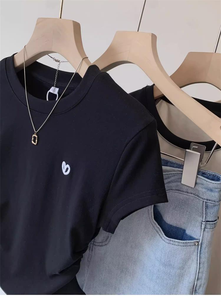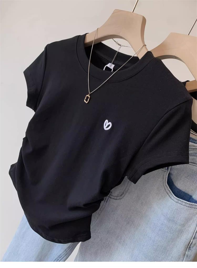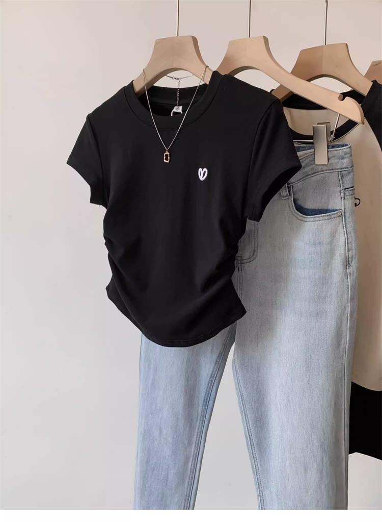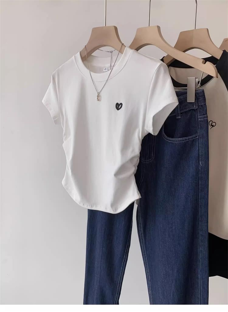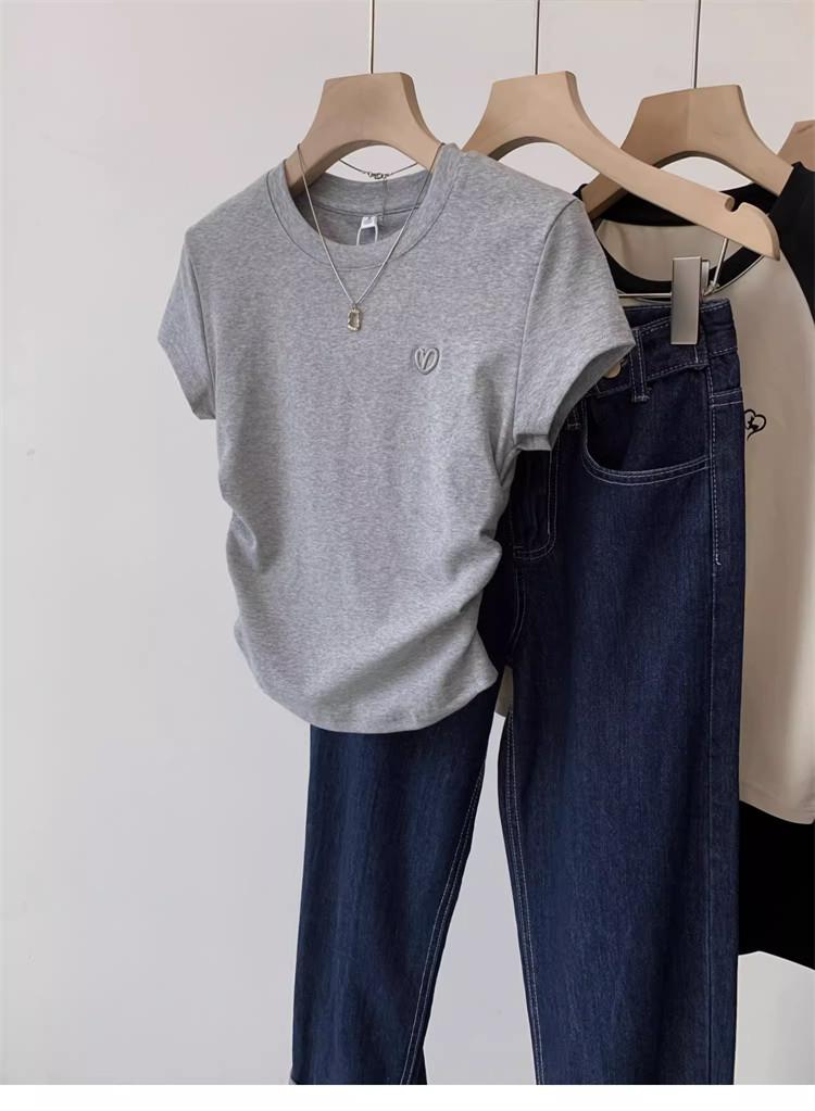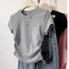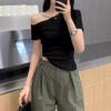 Playera de Cuello Redondo, Hombro Derecho, Entallada de Manga Corta 2025 Verano Nuevo para Mujer con Pliegues para un Look Adelgazante, Top Corto Sexy