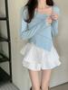 Otoño Nuevo Estilo Coreano Spice Girls Sexy Irregular Cuello Cuadrado Manga Larga Camiseta Diseño Puro Deseo Sentido del Diseño Slim Top Básico