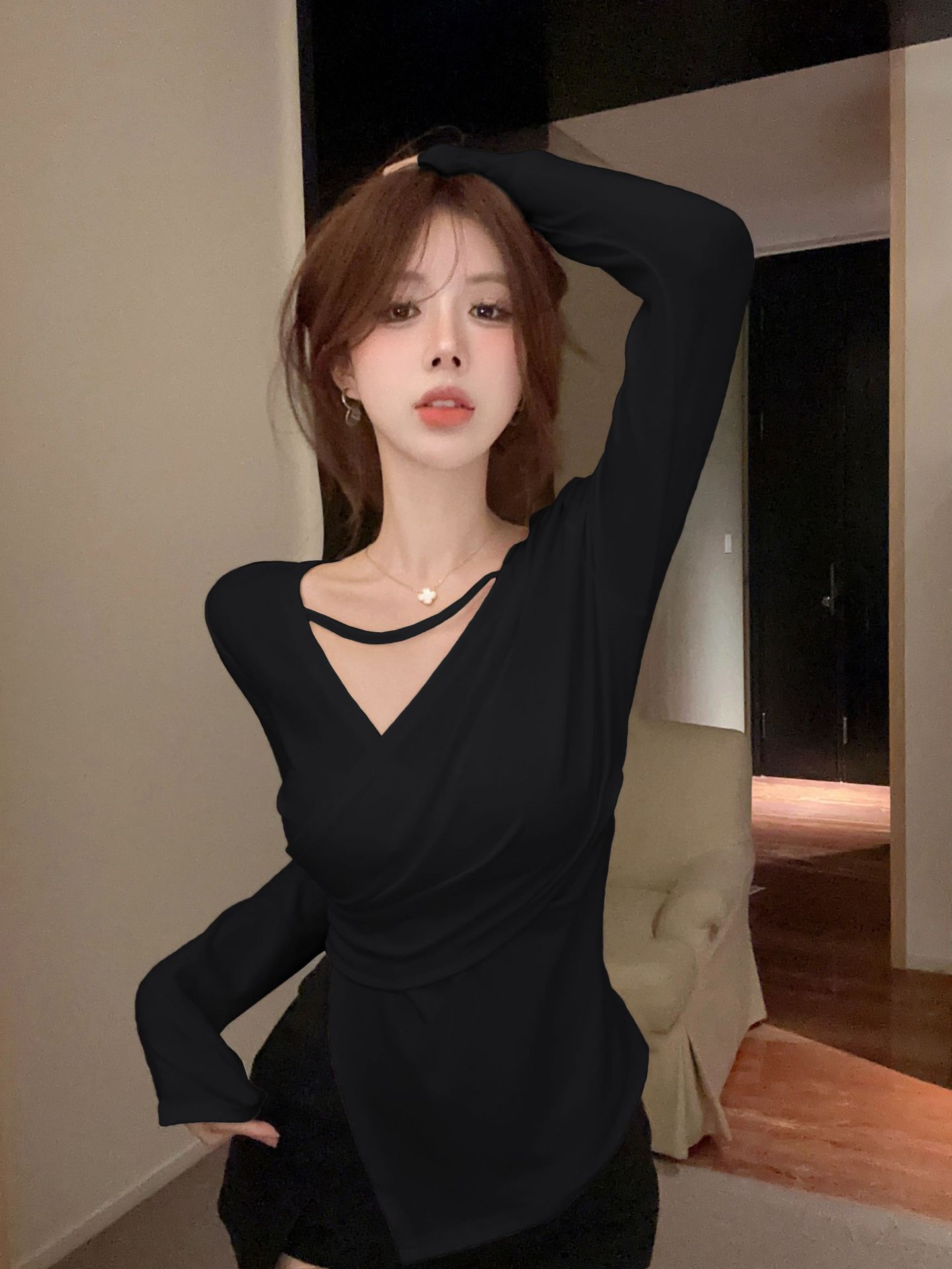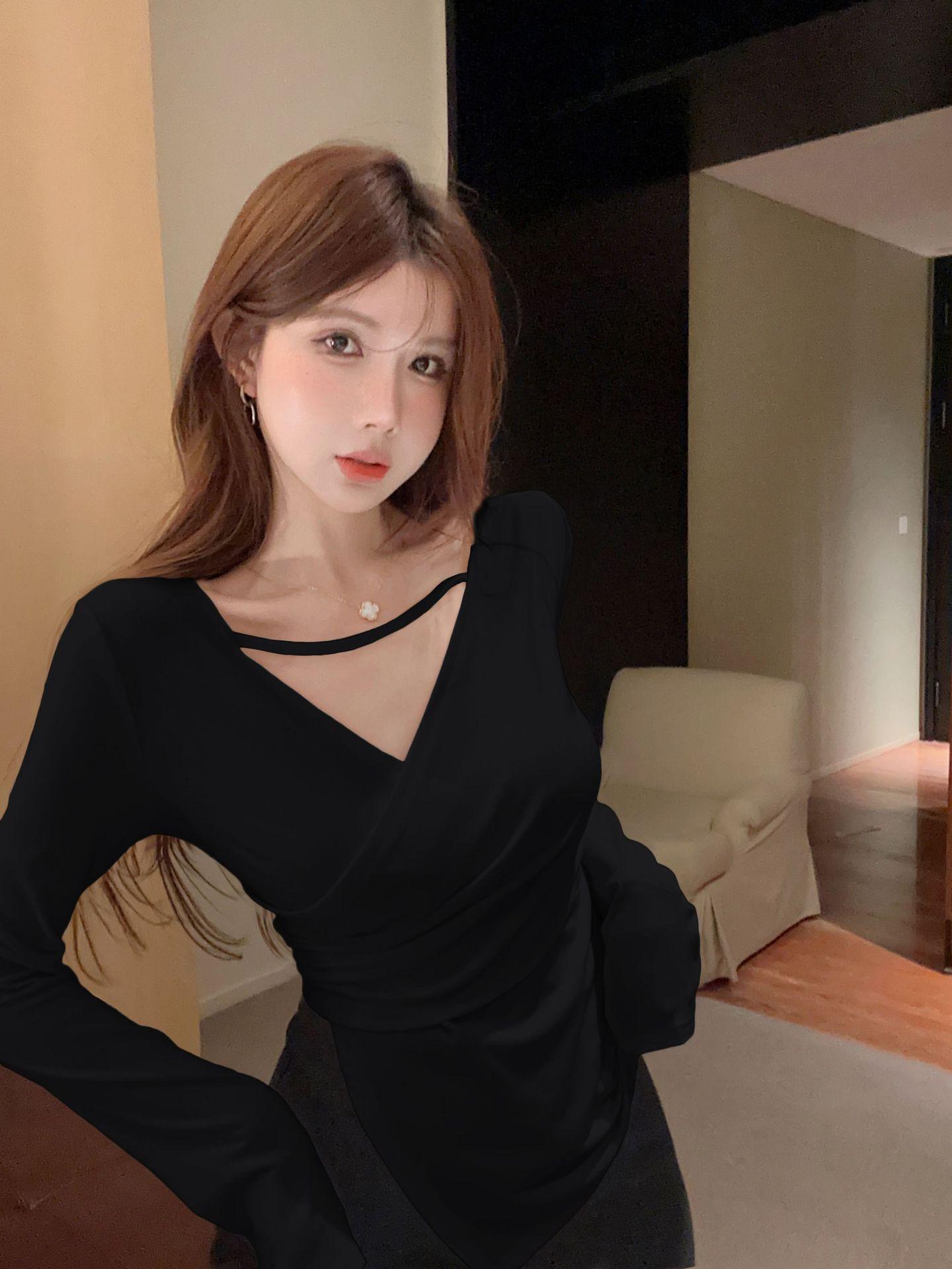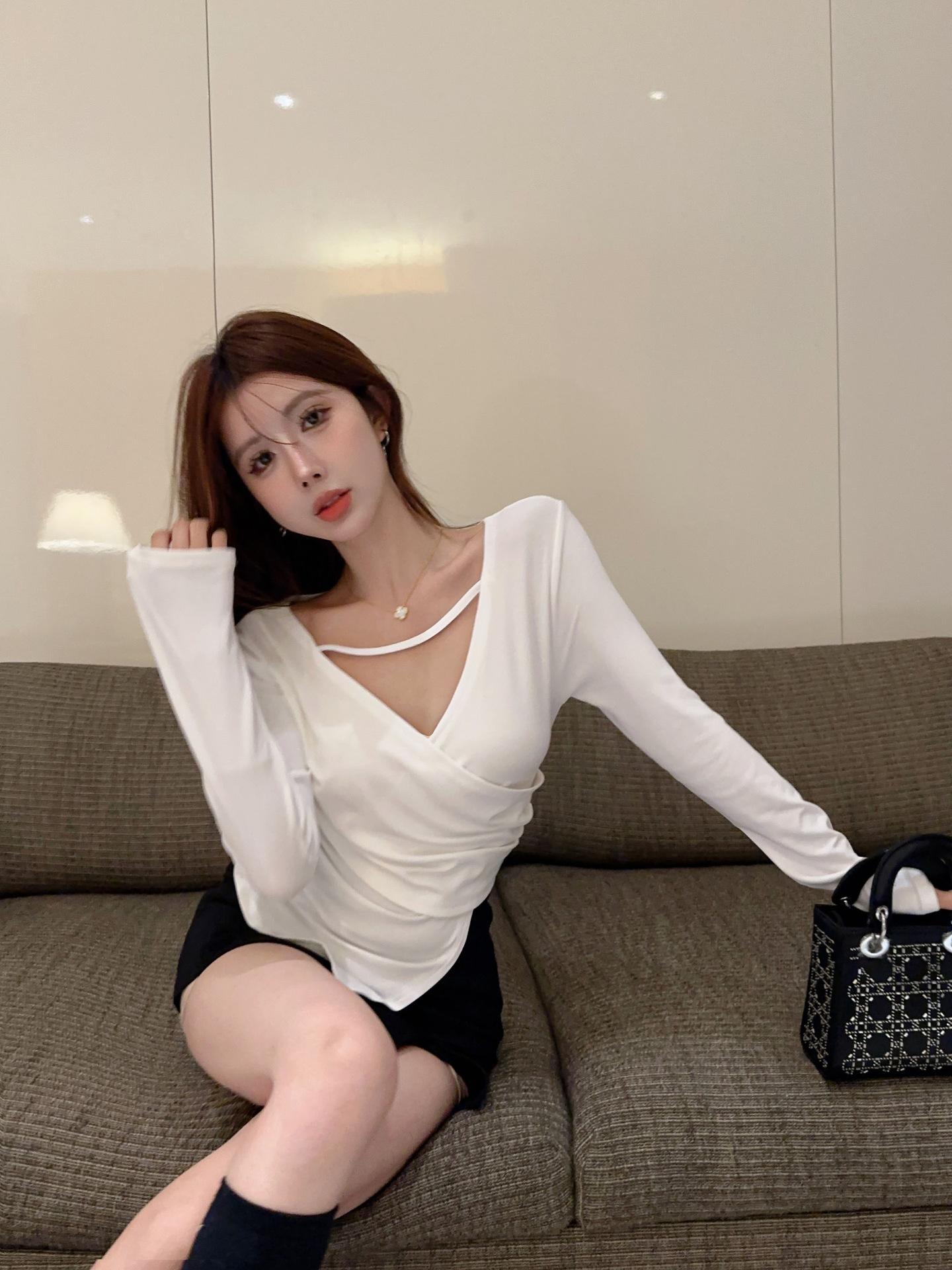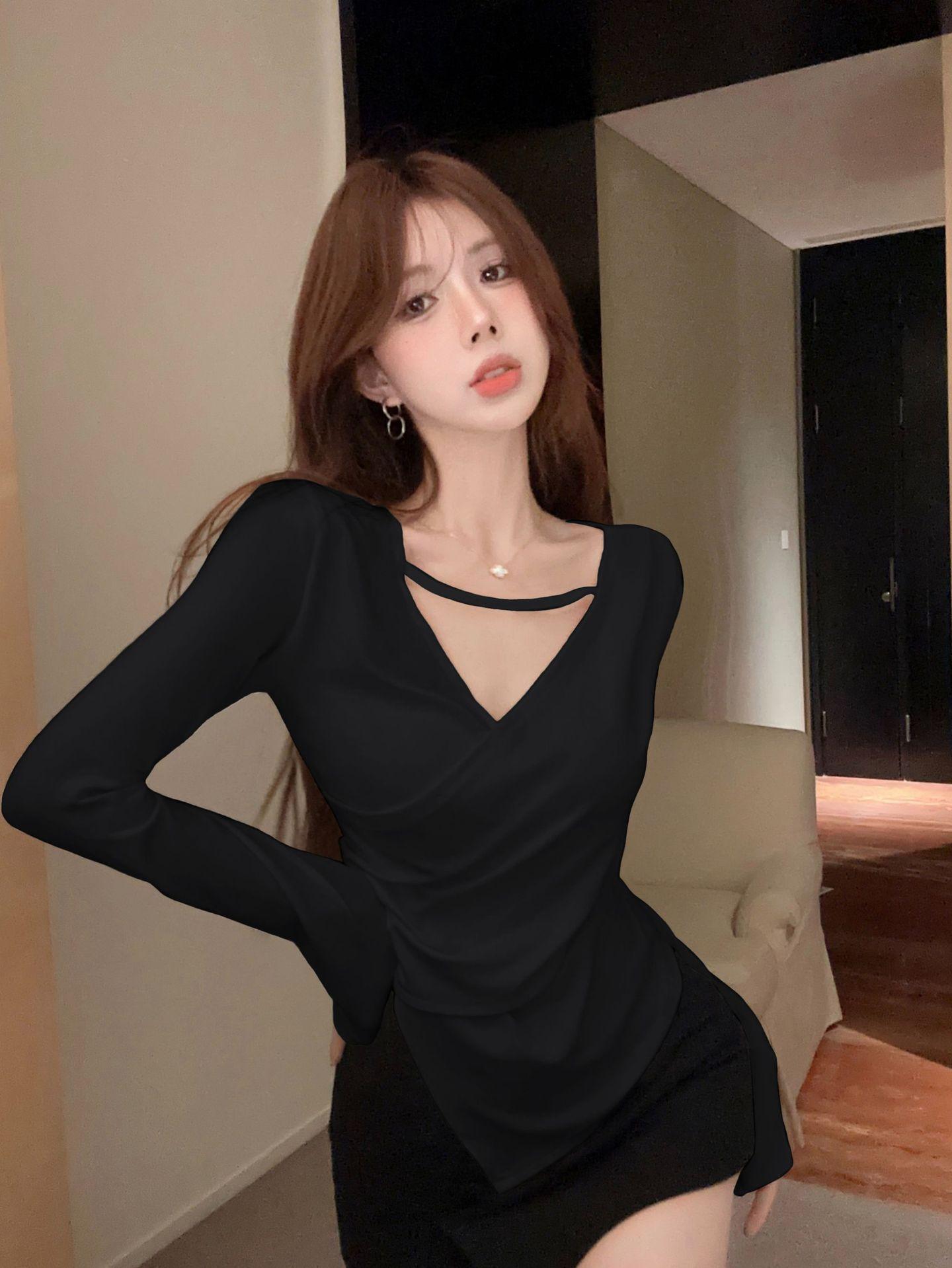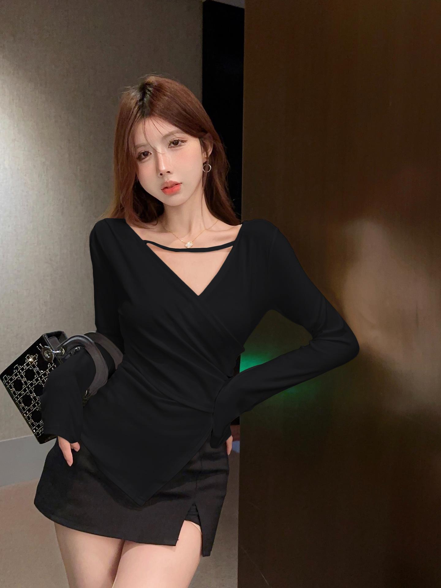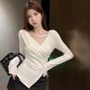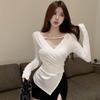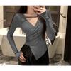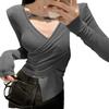 Camiseta de manga larga ajustada con cuello en V cruzado estilo coreano de otoño de 2024, top sexy de Spice Girls de estilo irregular a la moda