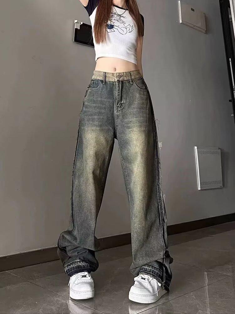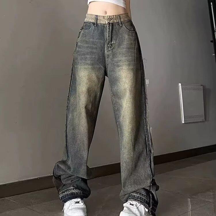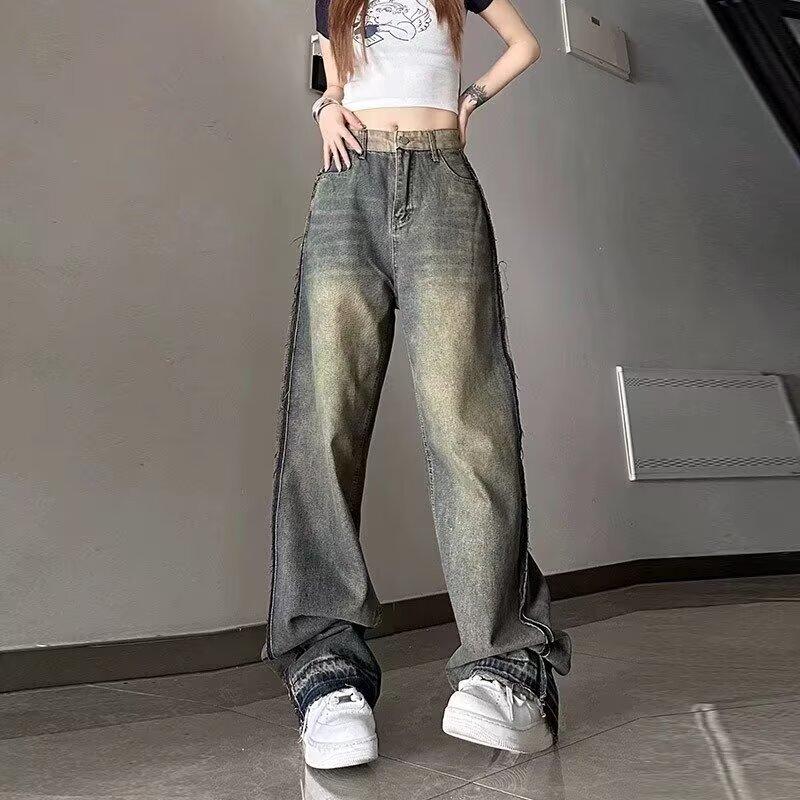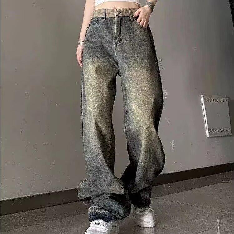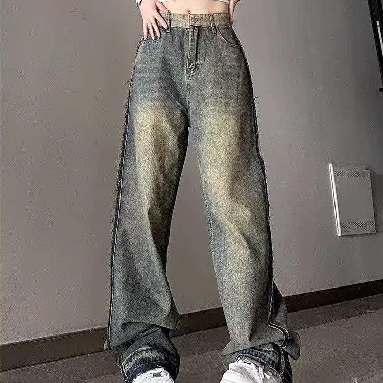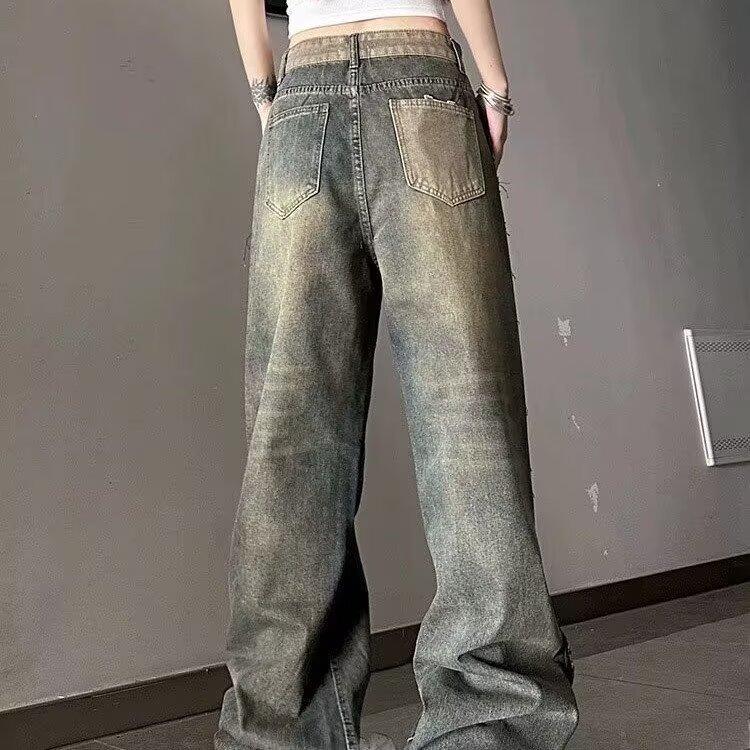 Pantalones vaqueros desgastados vintage para mujer, primavera y otoño 2024, nuevo diseño, cintura alta, adelgazantes, sueltos, rectos, de pierna ancha