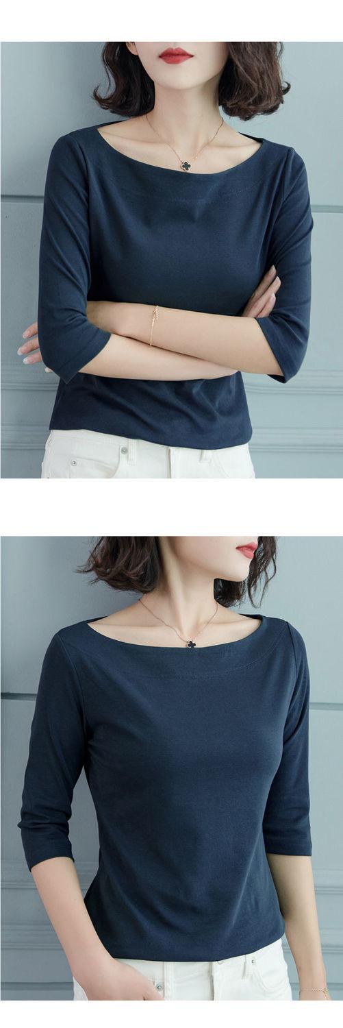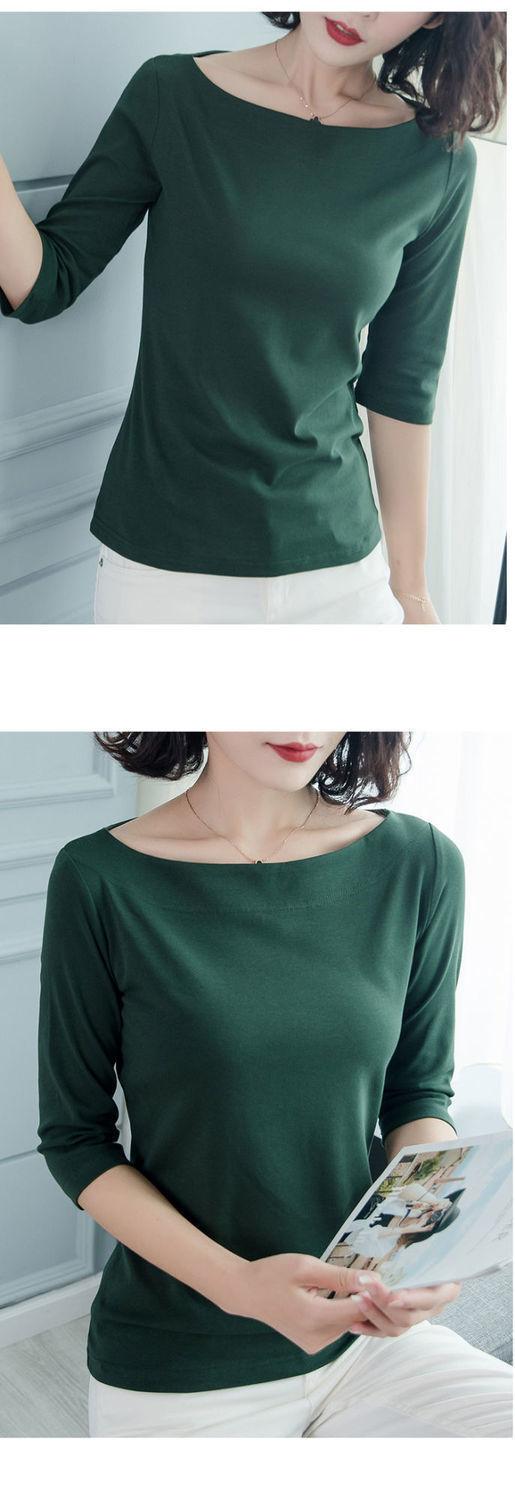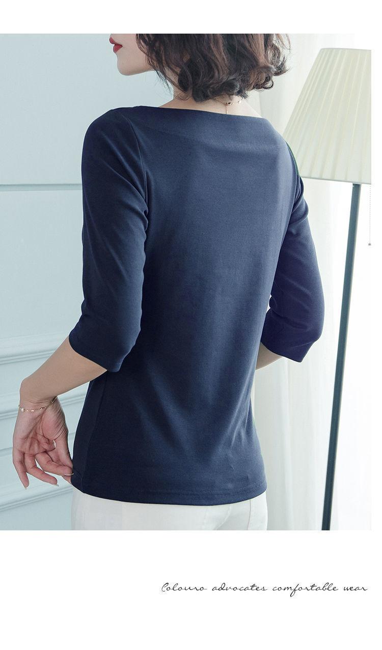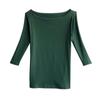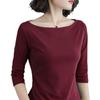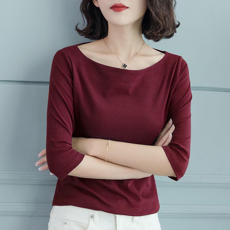 [Algodón puro] Camiseta de otoño con hombros descubiertos, color liso, ajustada, para mujer, de siete mangas