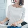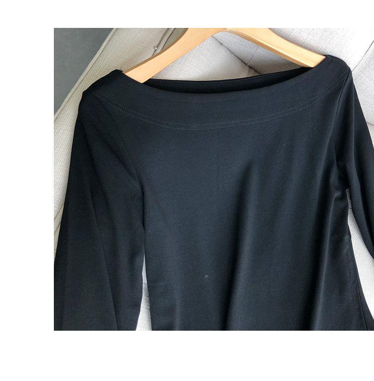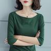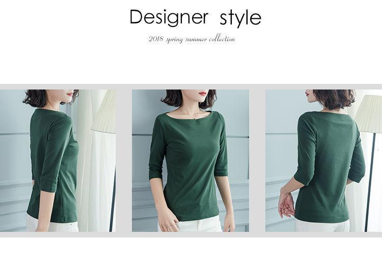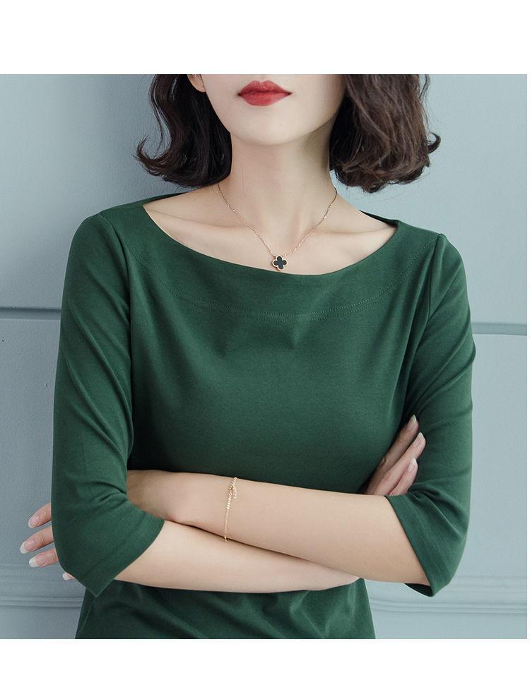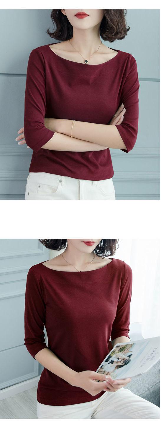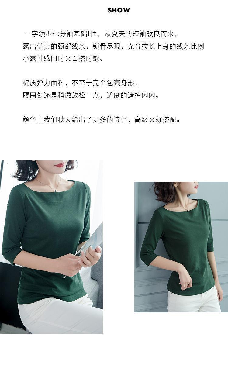 [Algodón puro] Camiseta de otoño con hombros descubiertos, color liso, ajustada, para mujer, de siete mangas