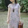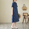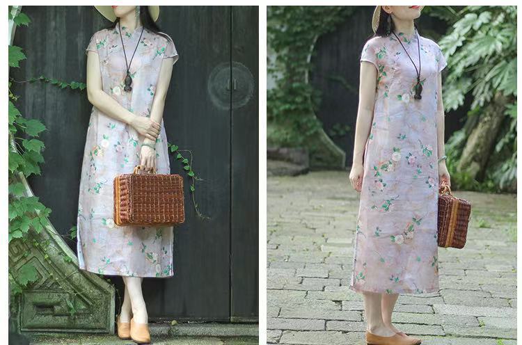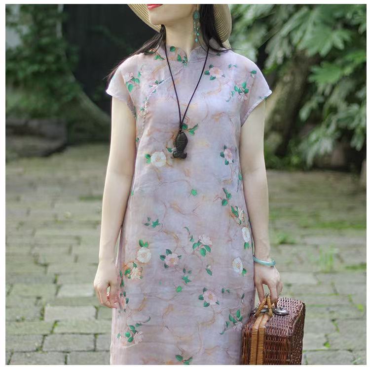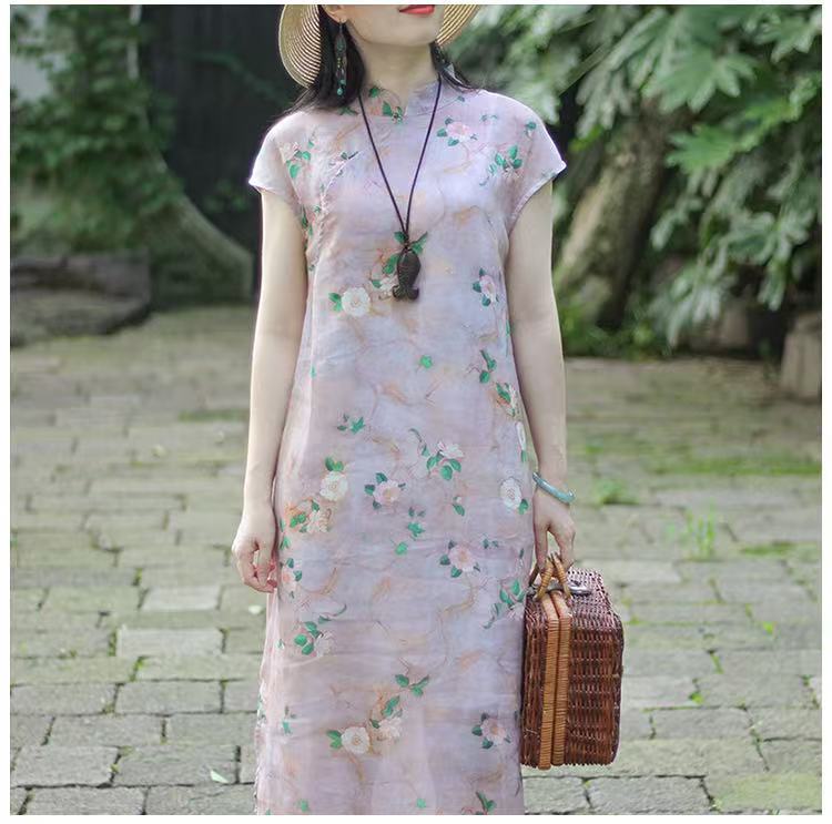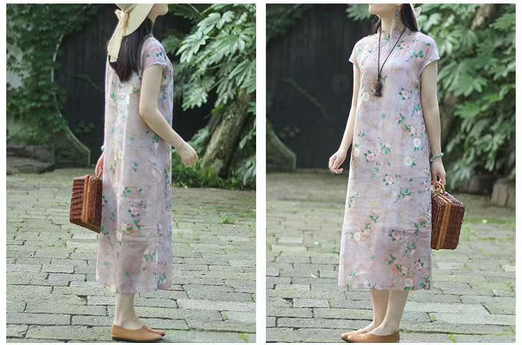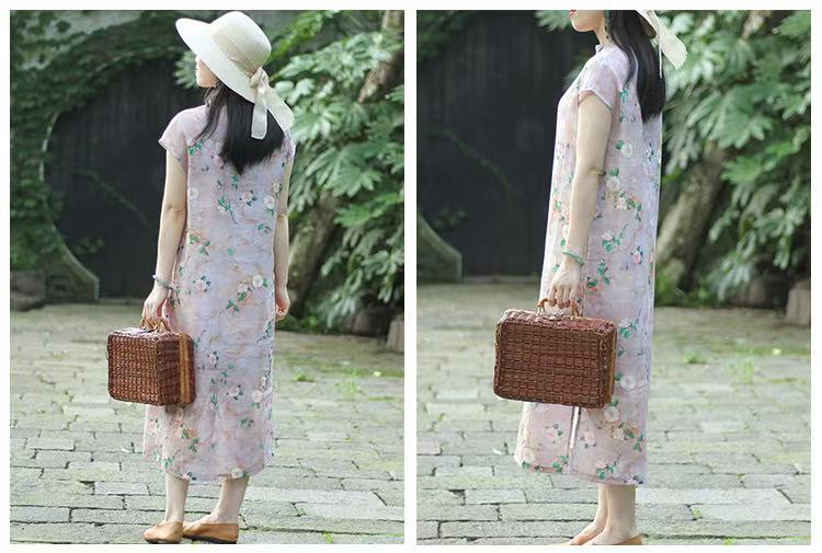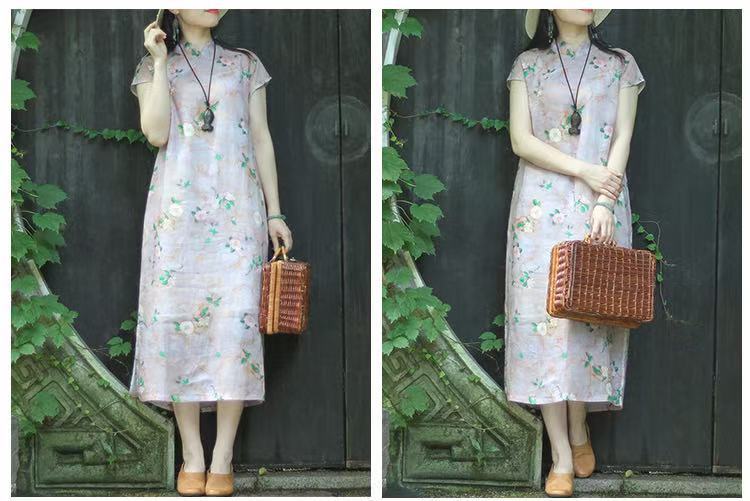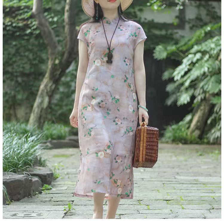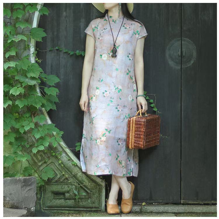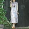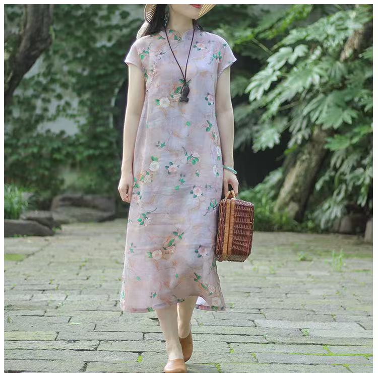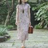 Primavera y verano 2025 Nuevo estilo chino Cheongsam de cuello vertical Vestido modificado Falda de algodón y lino artística vintage estampada