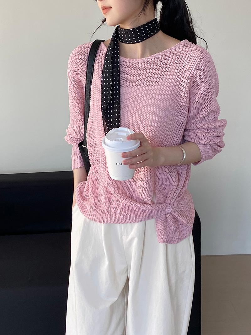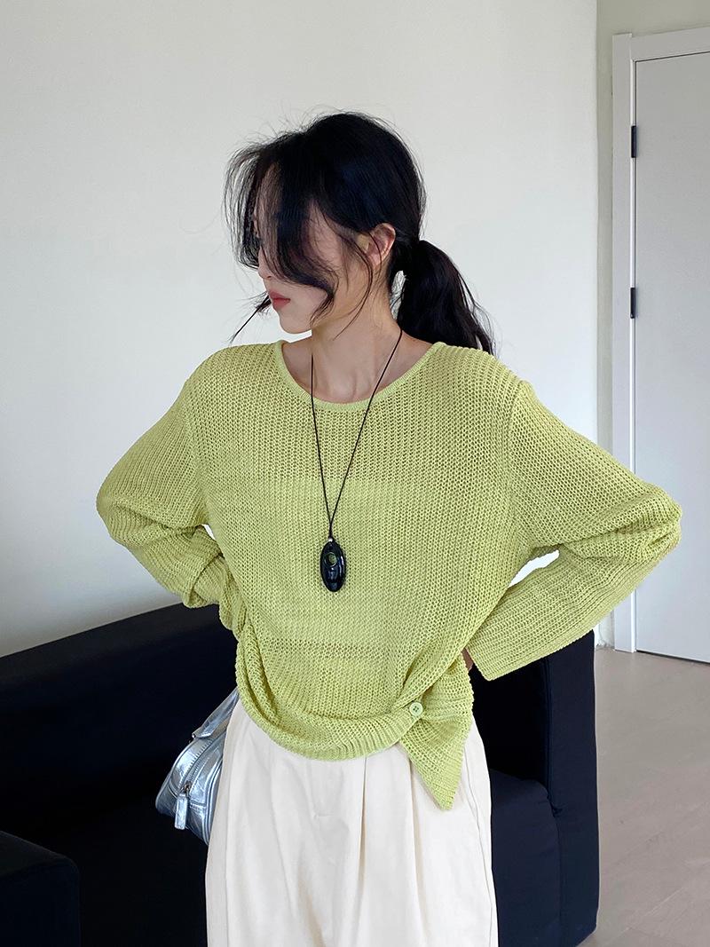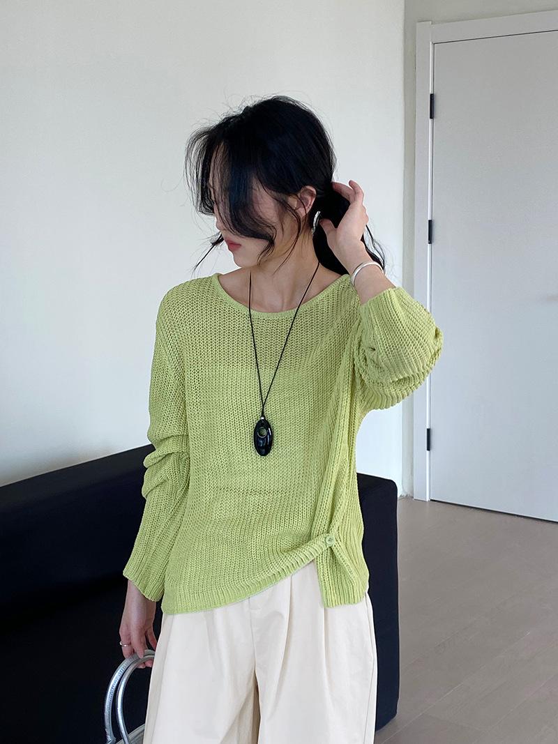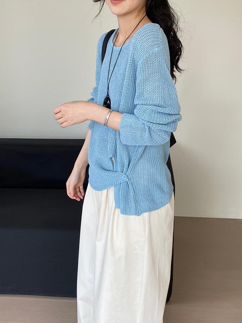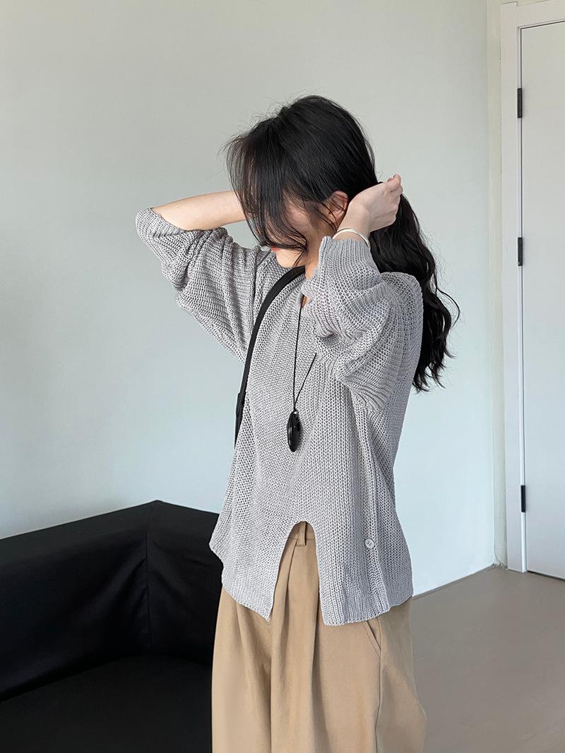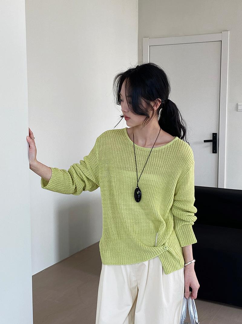 [Modelo de Bienestar, No Reembolsable] Nomo Estilo Coreano Abertura Lateral con Botones Cuello Redondo Ligeramente Transparente Blusa de Punto para Mujer D0205