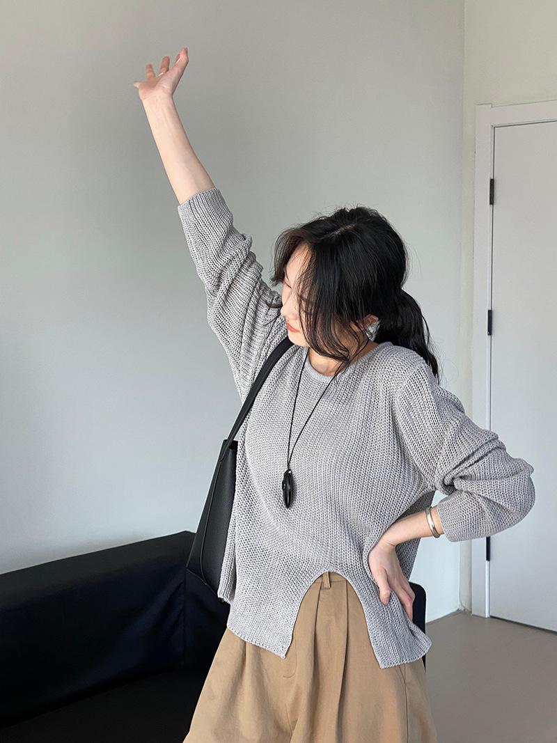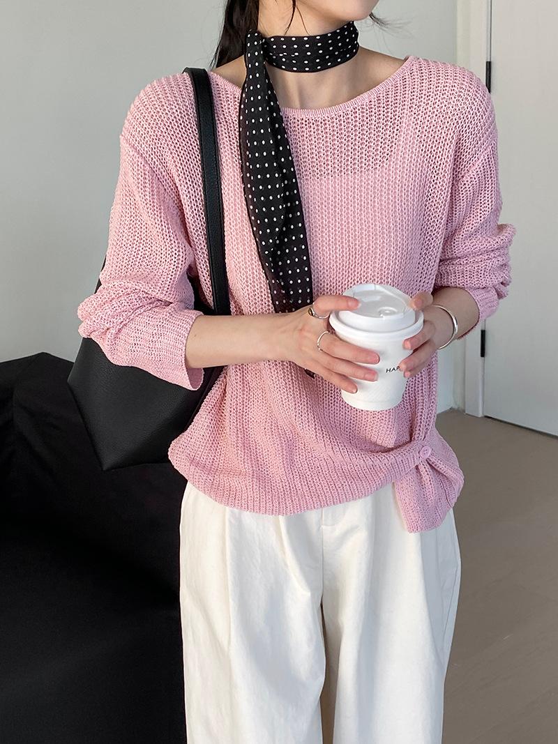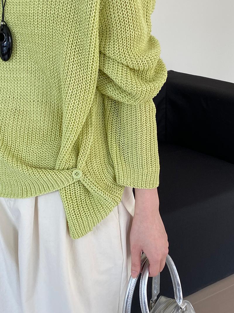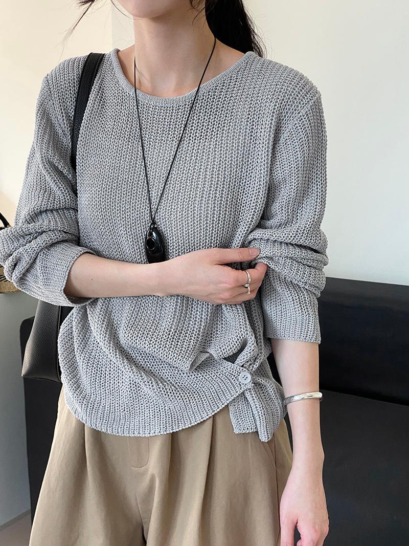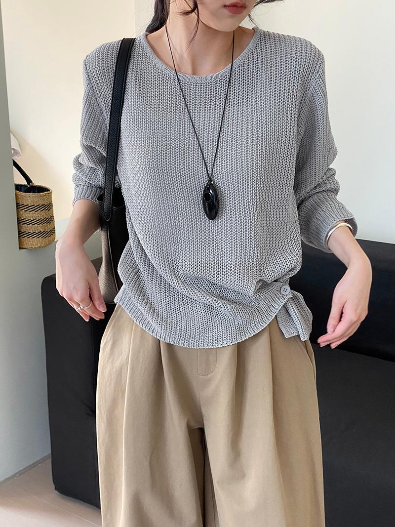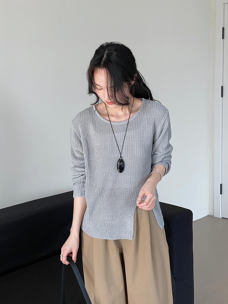 [Modelo de Bienestar, No Reembolsable] Nomo Estilo Coreano Abertura Lateral con Botones Cuello Redondo Ligeramente Transparente Blusa de Punto para Mujer D0205