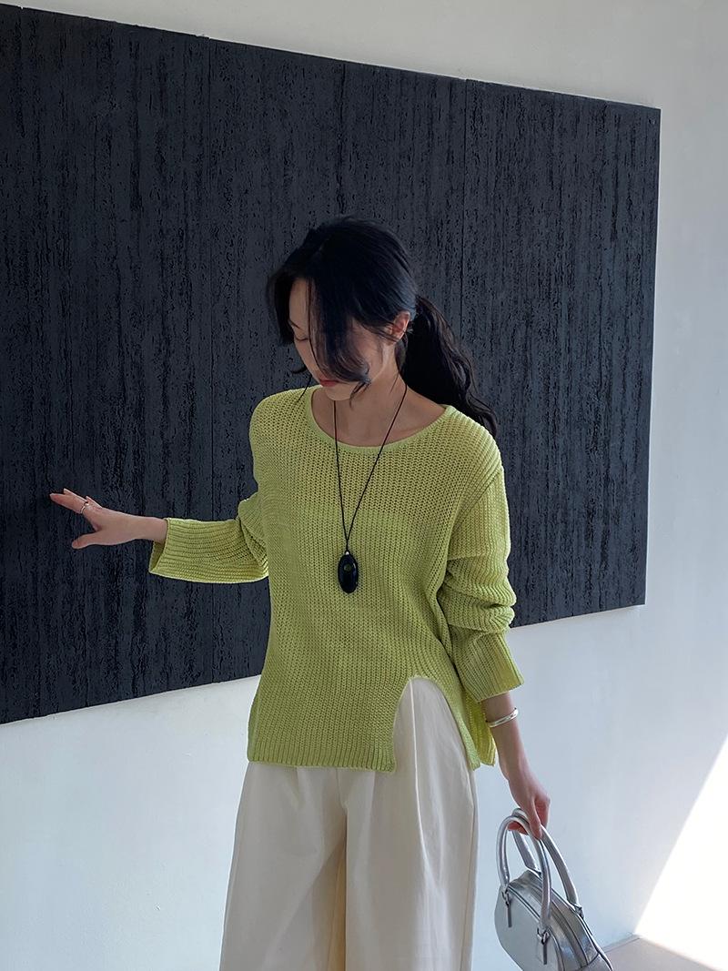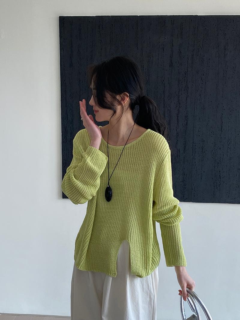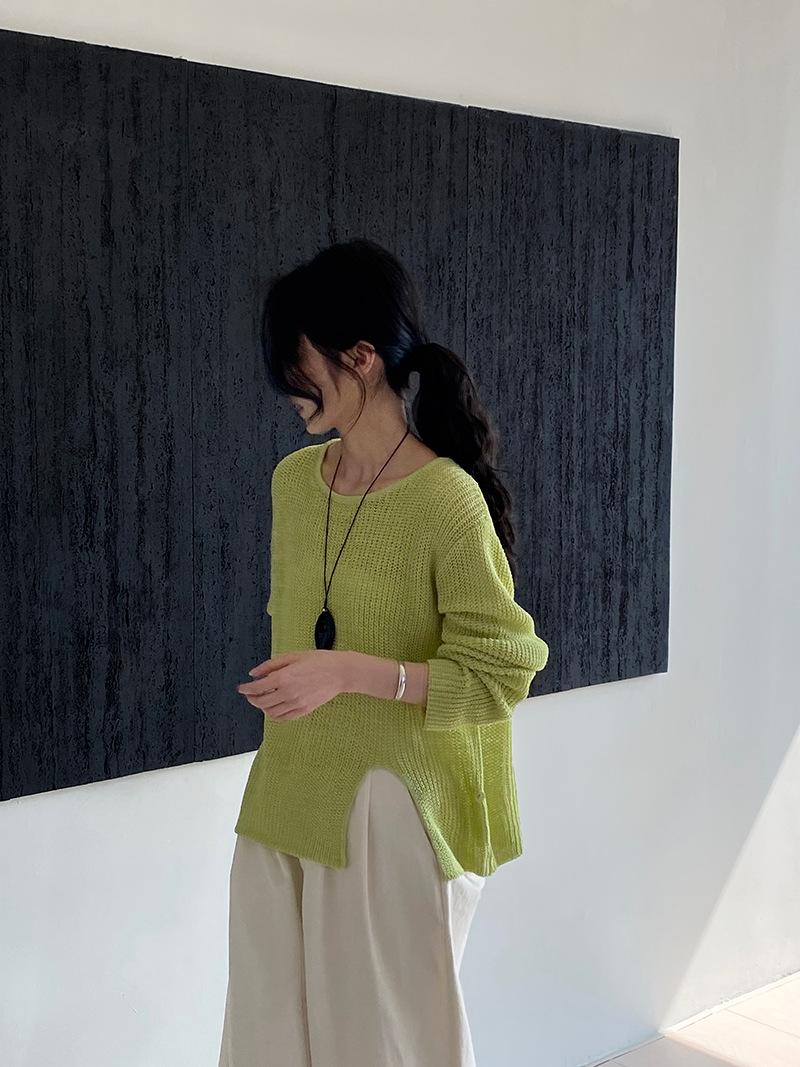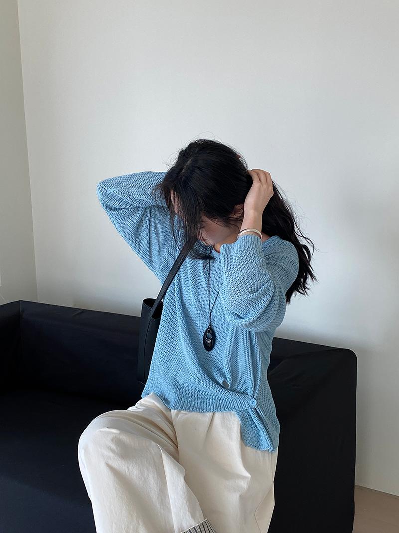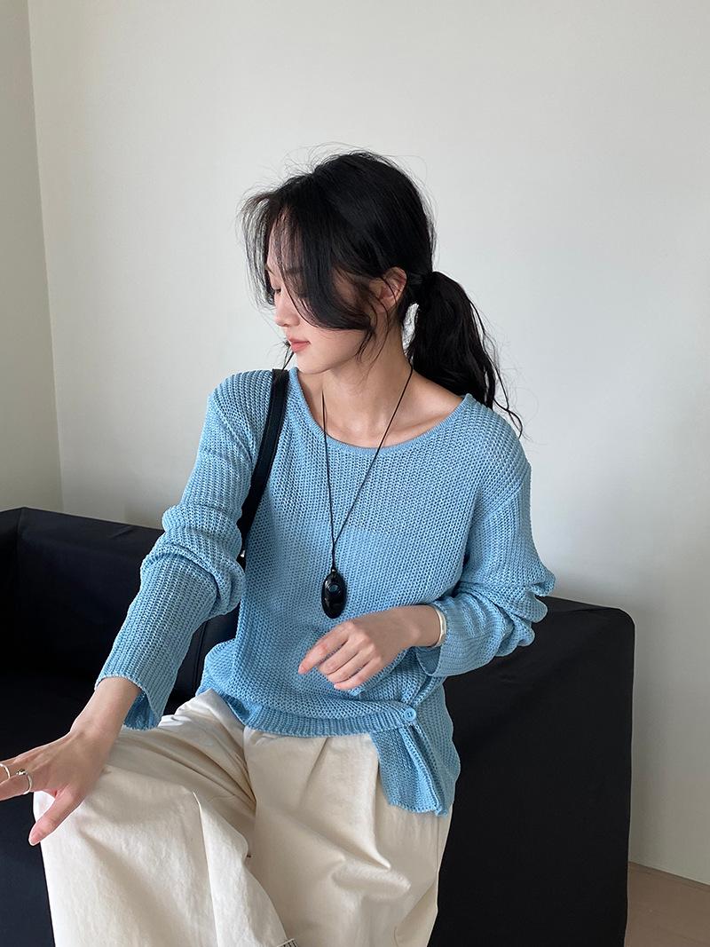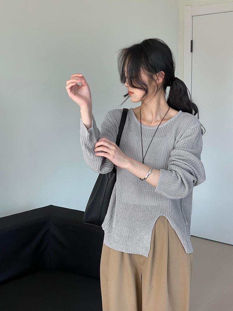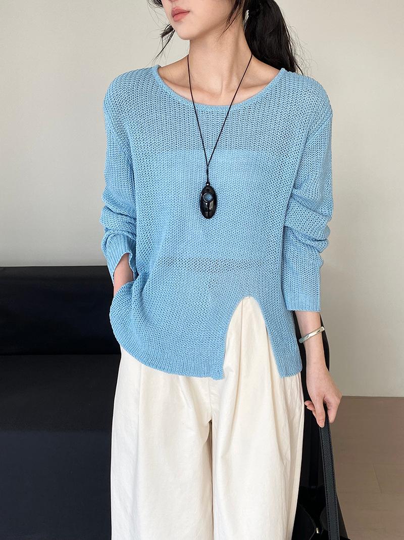 [Modelo de Bienestar, No Reembolsable] Nomo Estilo Coreano Abertura Lateral con Botones Cuello Redondo Ligeramente Transparente Blusa de Punto para Mujer D0205