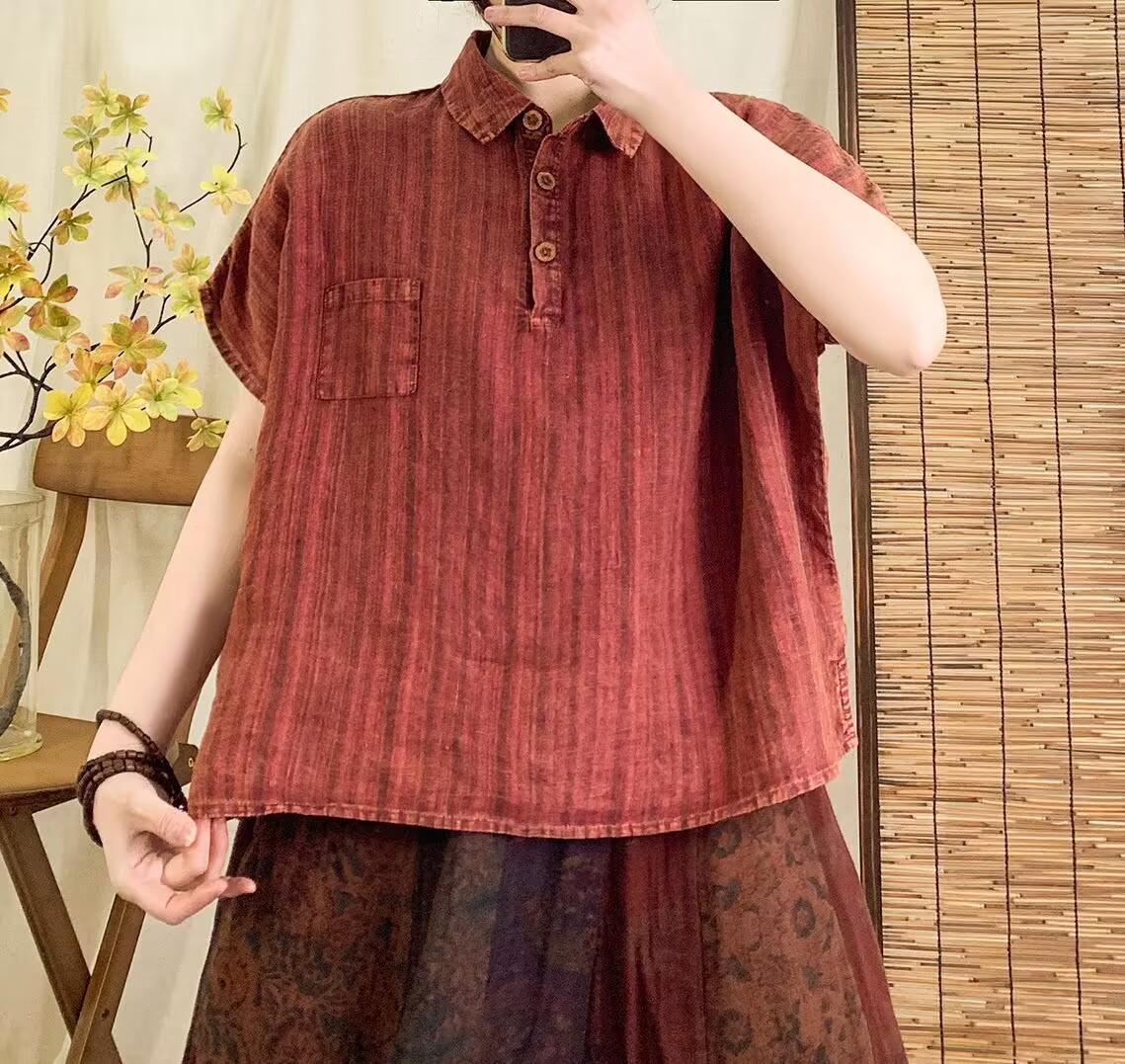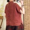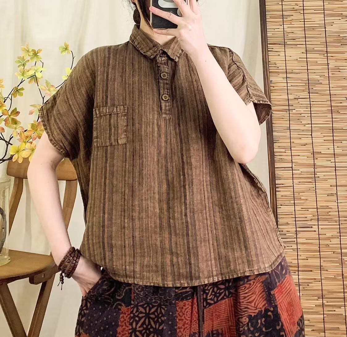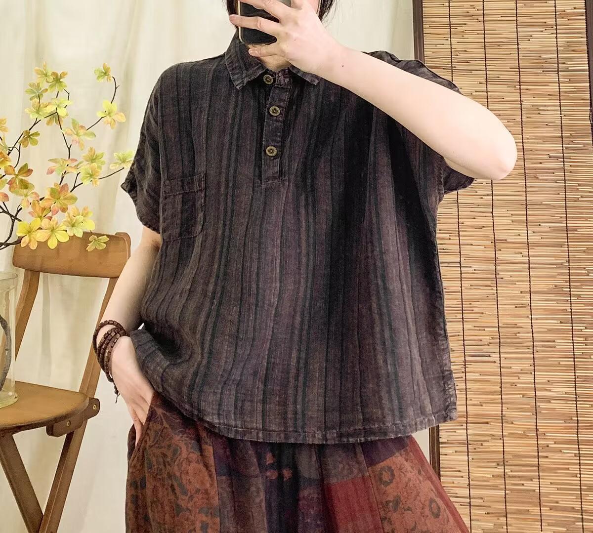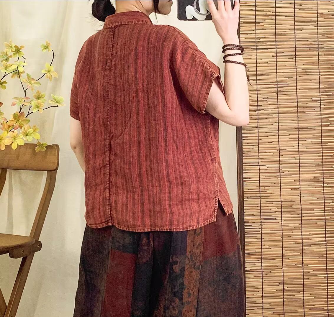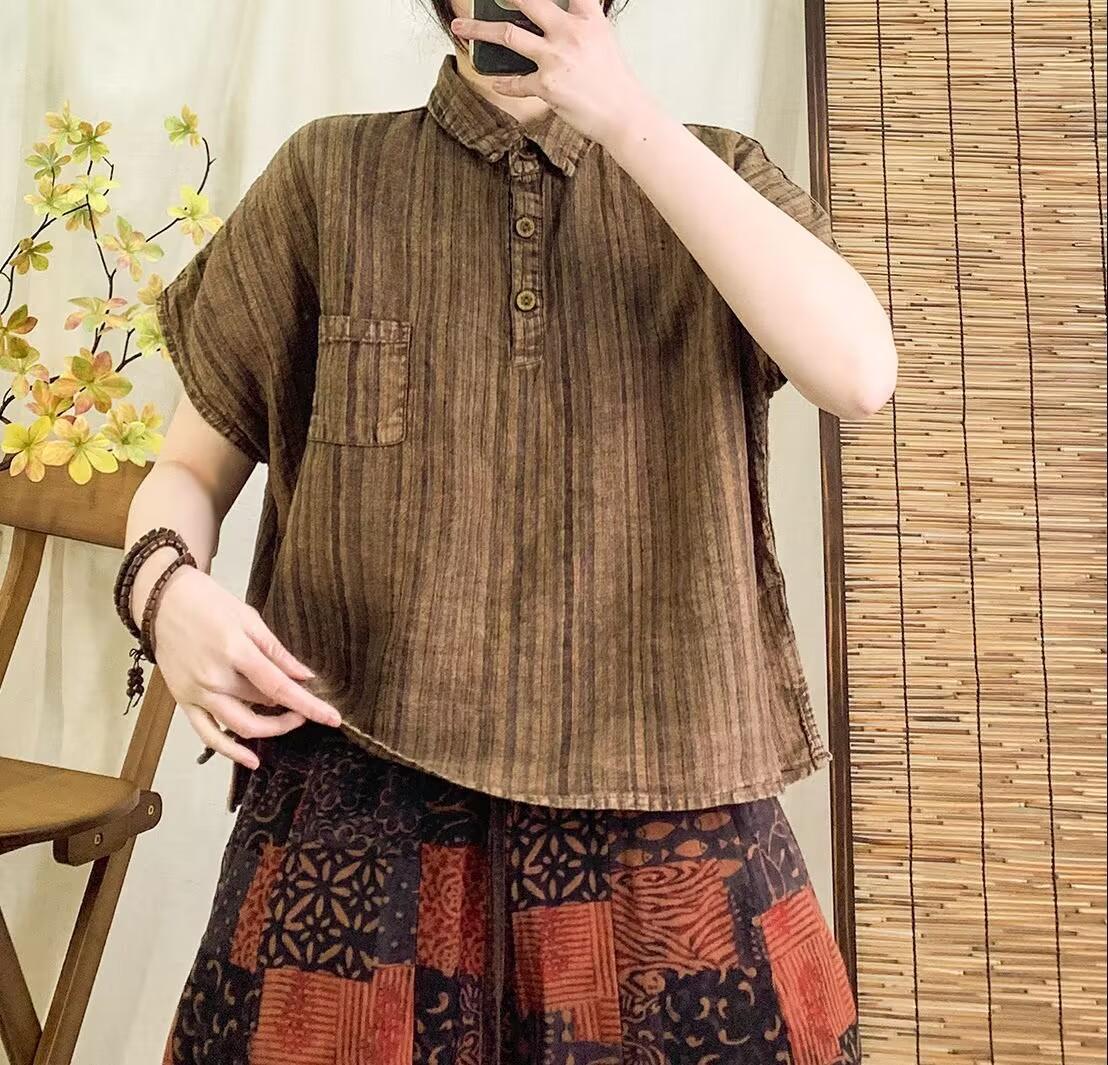 Camiseta de lino de manga corta para mujer, primavera y verano, nueva, estilo retro, artística, holgada, ajustada, con rayas de colores fritos.