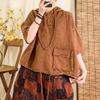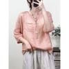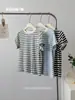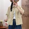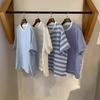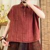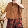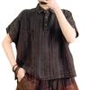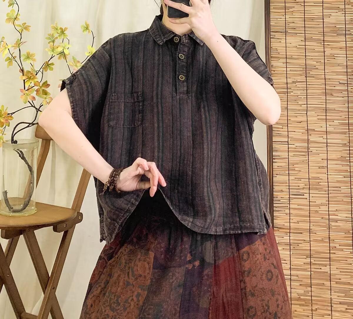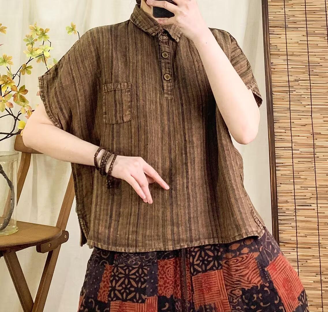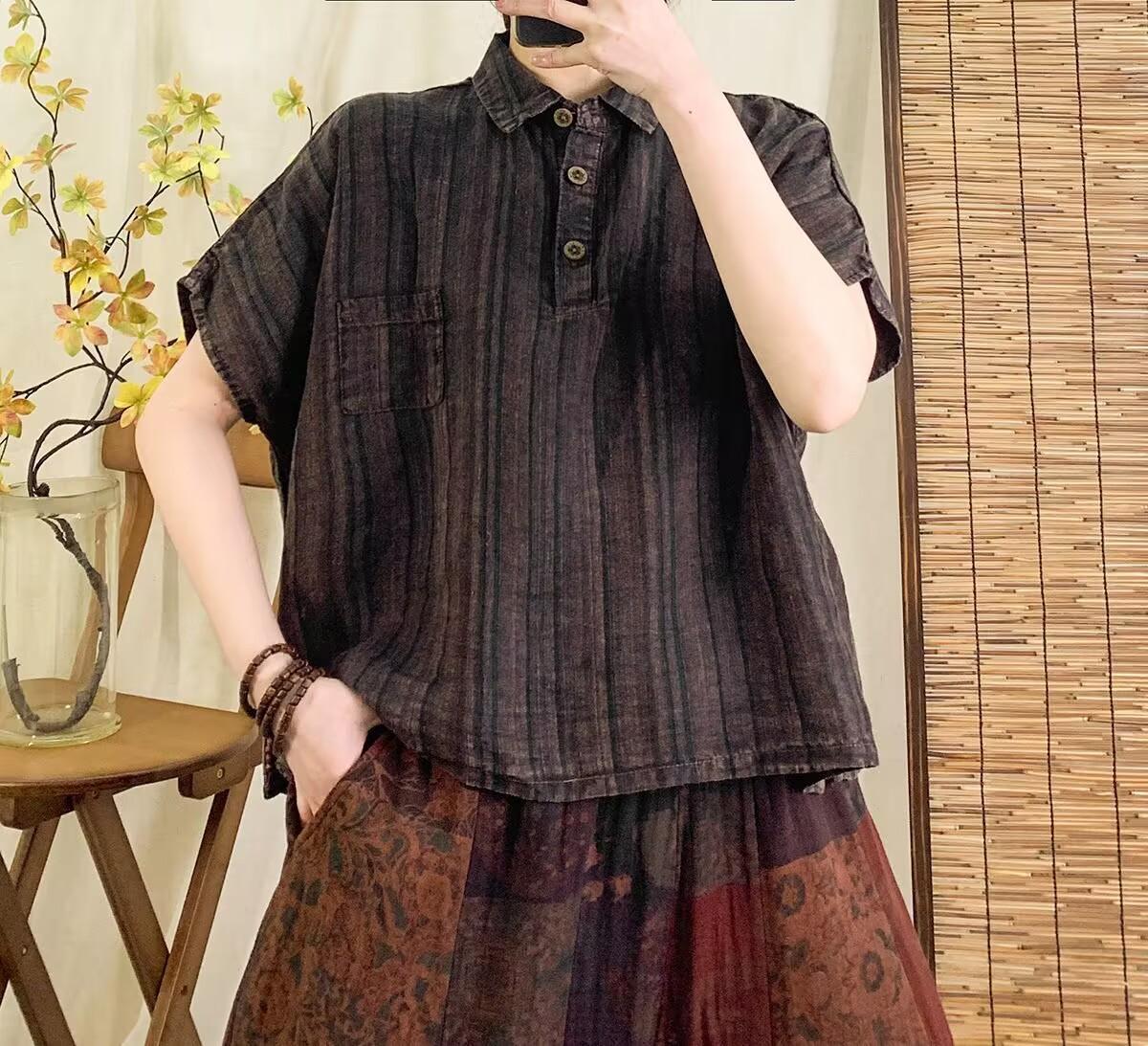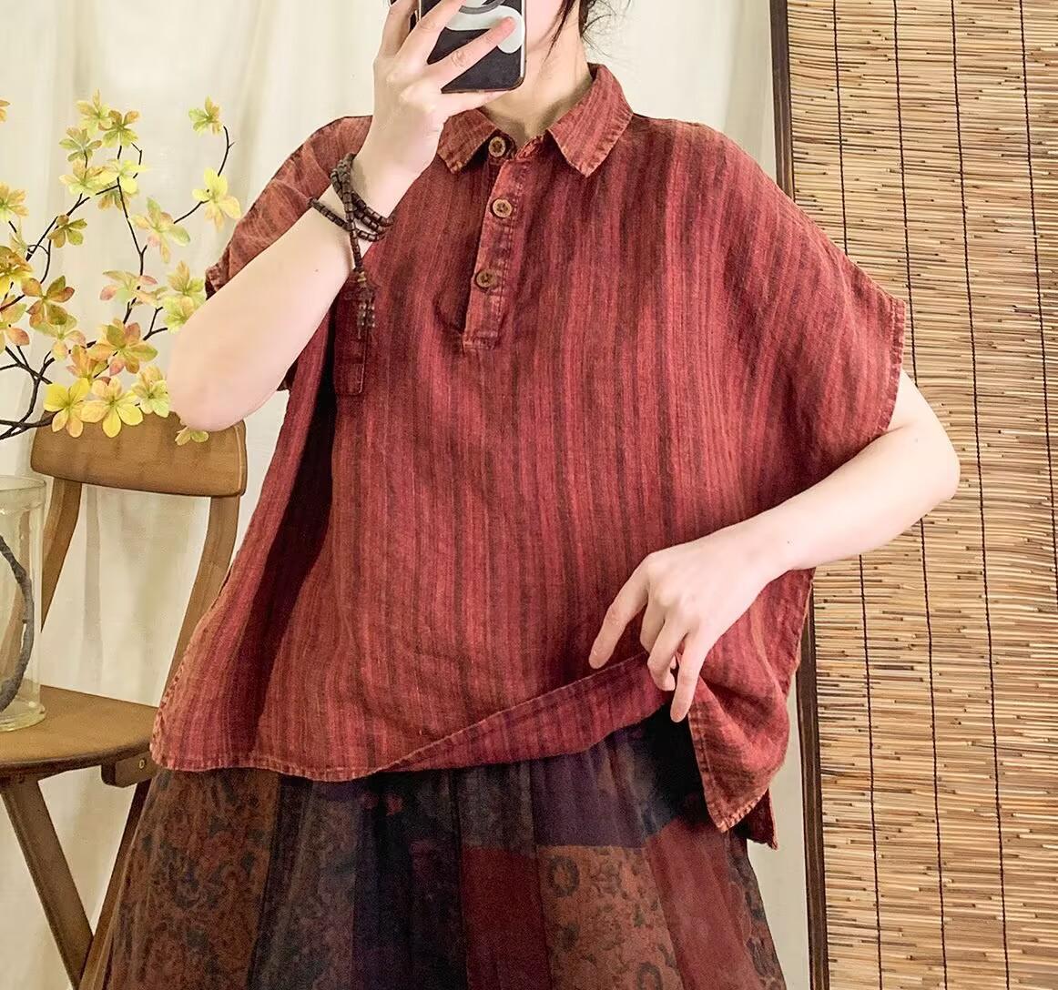 Camiseta de lino de manga corta para mujer, primavera y verano, nueva, estilo retro, artística, holgada, ajustada, con rayas de colores fritos.