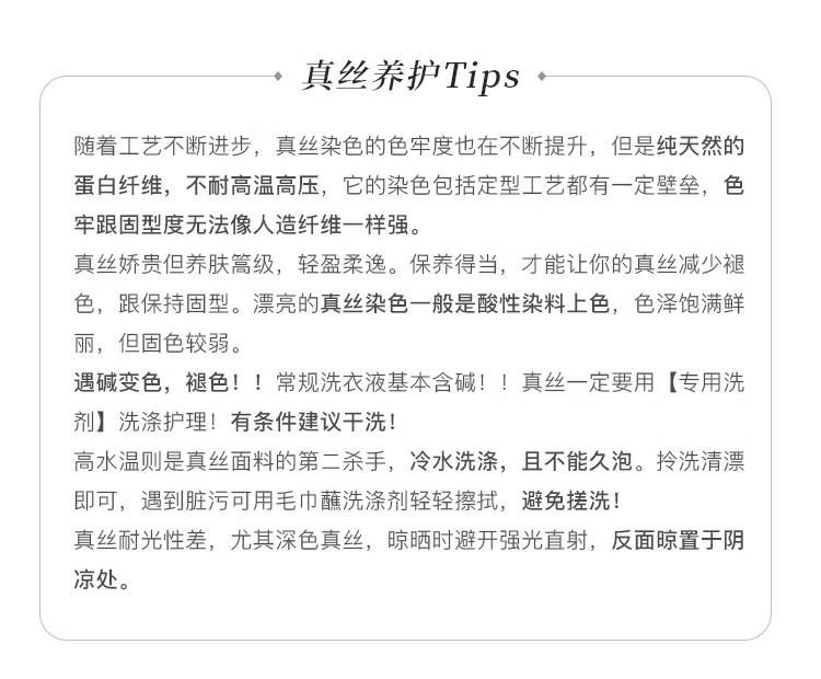 Resumen: Las telas de seda morera son delicadas por naturaleza; se recomienda la limpieza en seco. Es normal que encojan ligeramente después del lavado, por lo que se recomienda elegir una talla un poco más holgada. |
