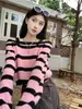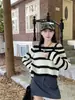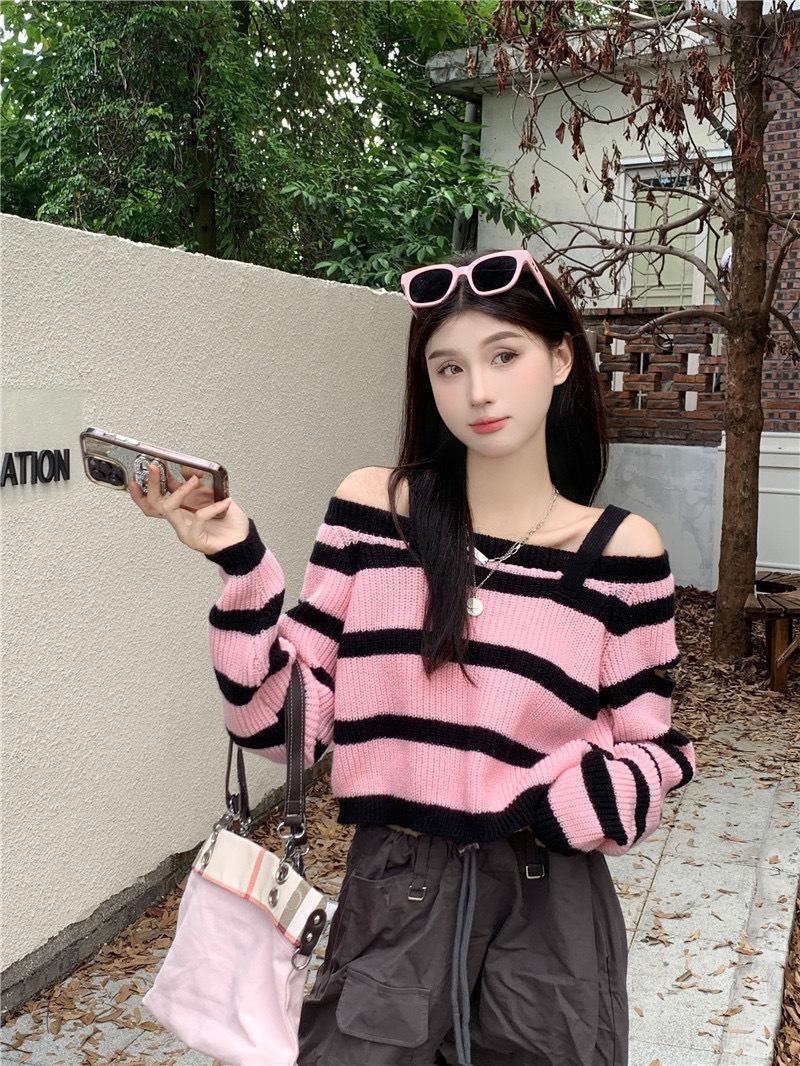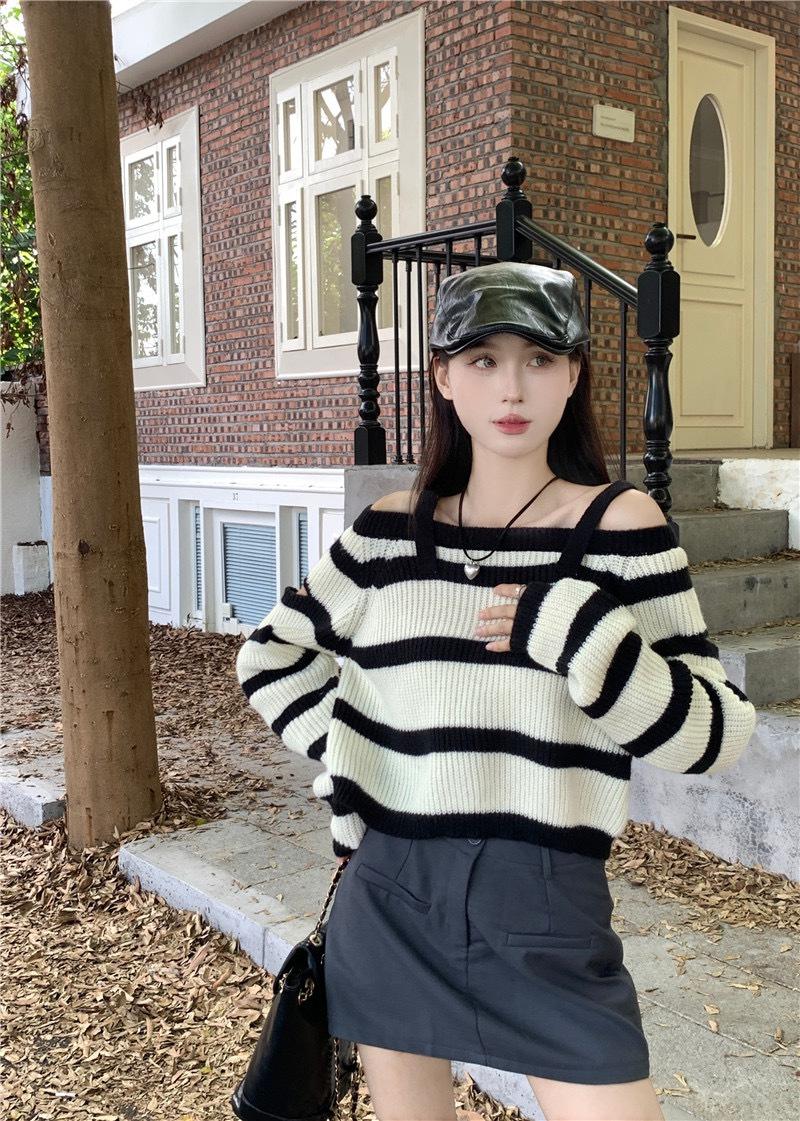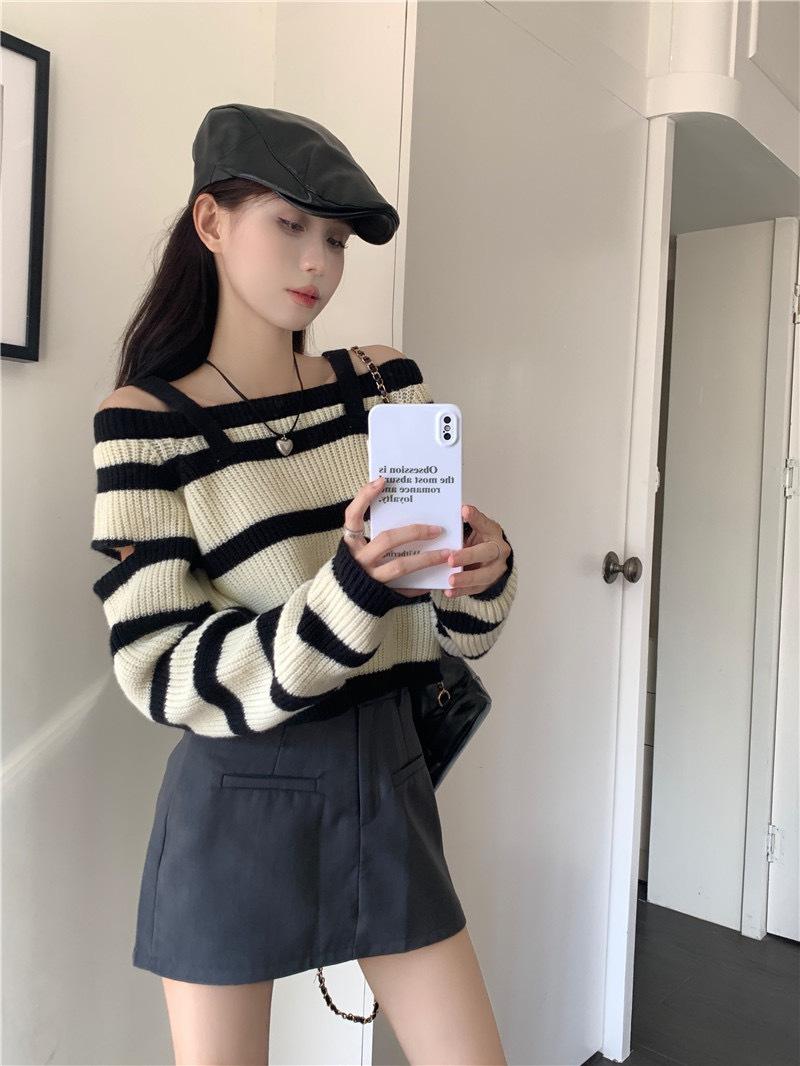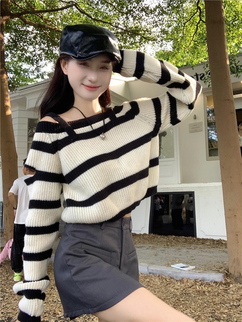 Diseño Sense Nicho Slim-Fit Slim Camiseta de Manga Larga a Rayas de Color Contrastante Otoño Nuevo Elegante Hombro Top Corto Ins