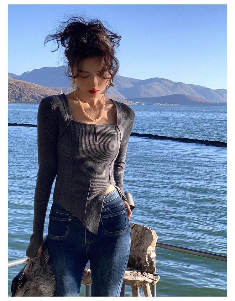 Camiseta francesa retro irregular entallada, adelgazante, de cintura alta, cuello cuadrado y manga larga, top sexy para chica sensual, combinable con todo.