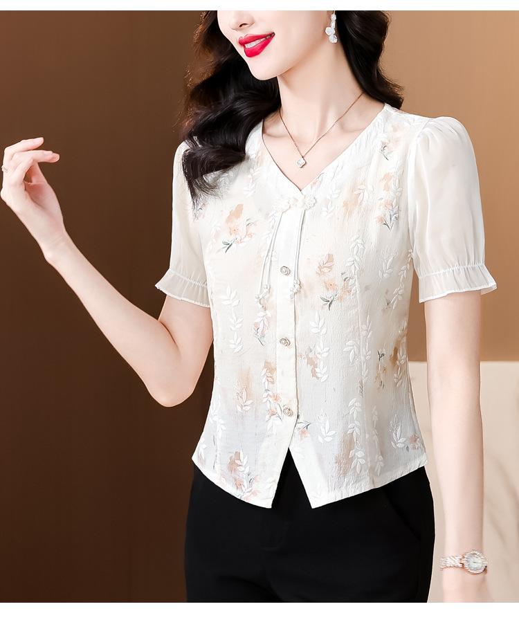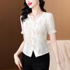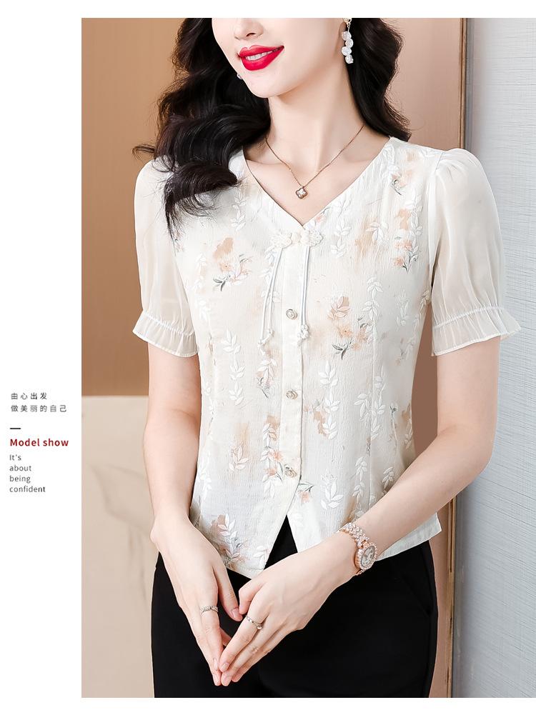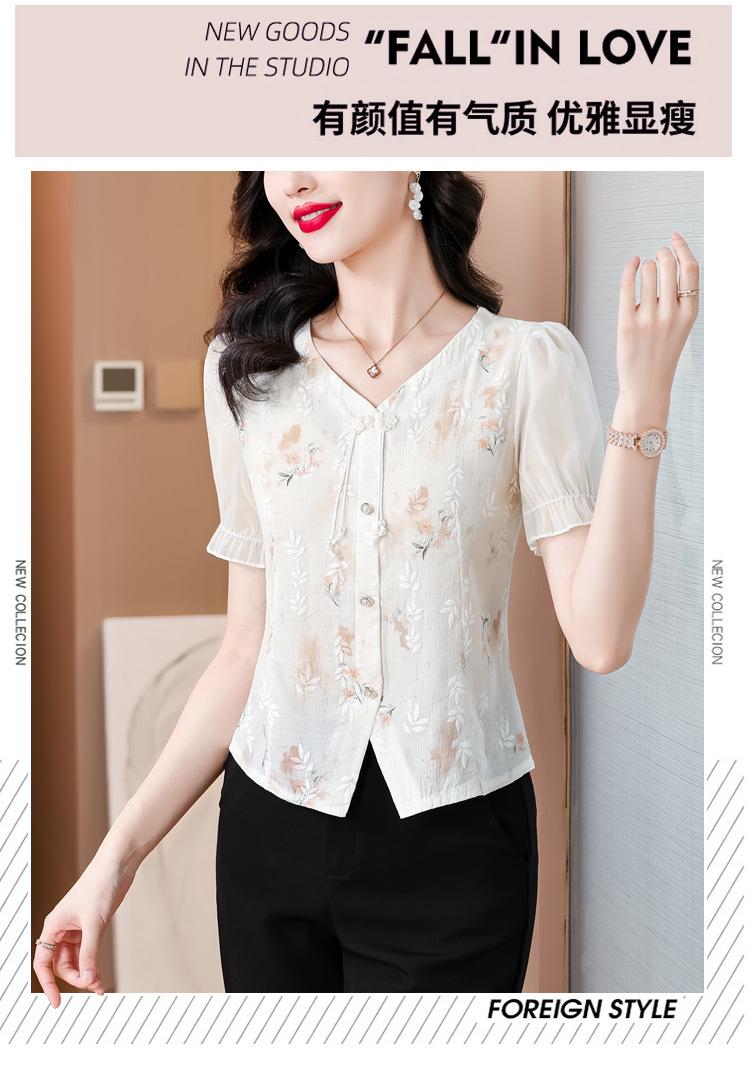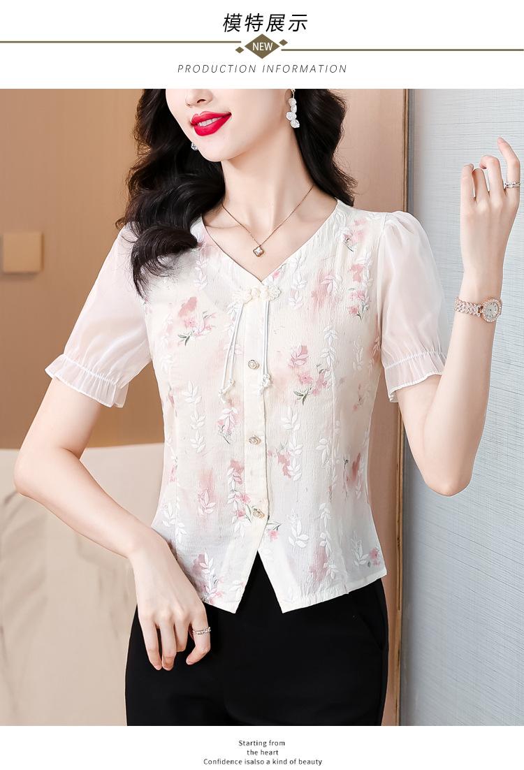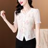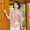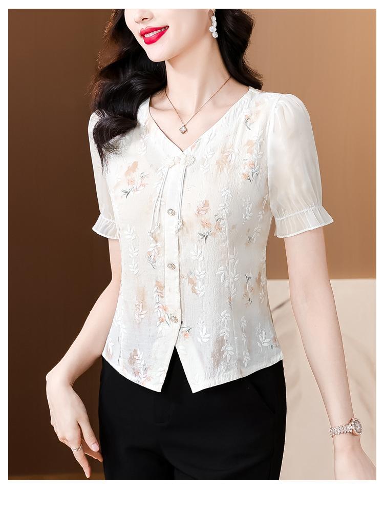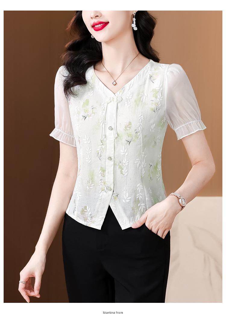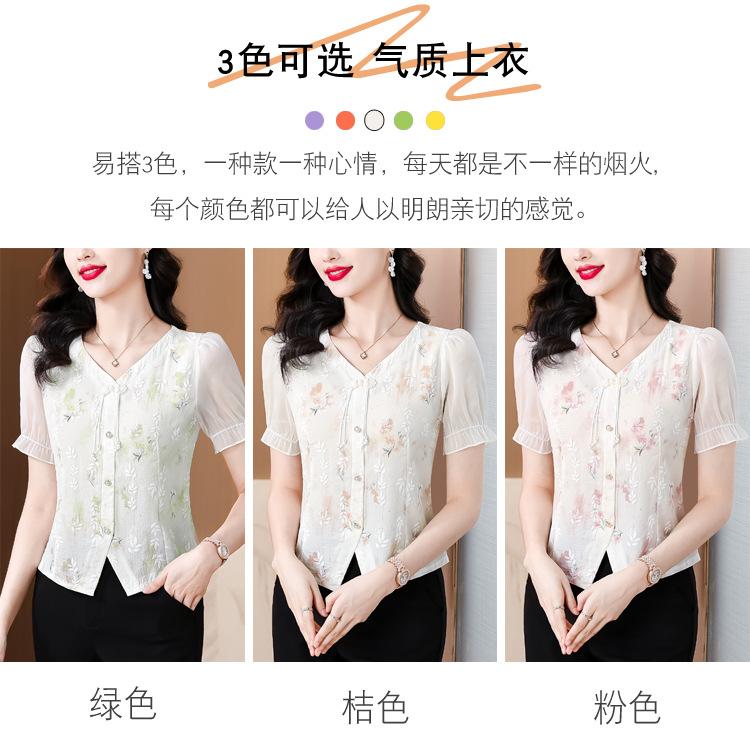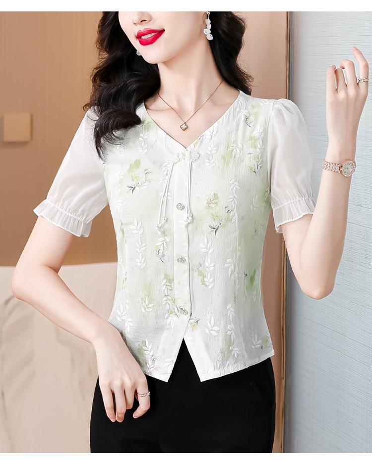 Camisa de gasa con botones Guofeng para mujer, prenda de verano 2025, nueva blusa adelgazante con cuello en V y estampado para madres.
