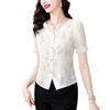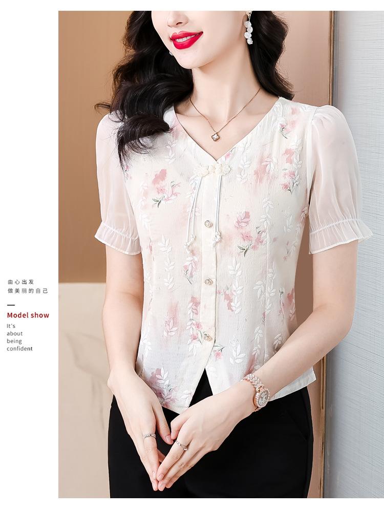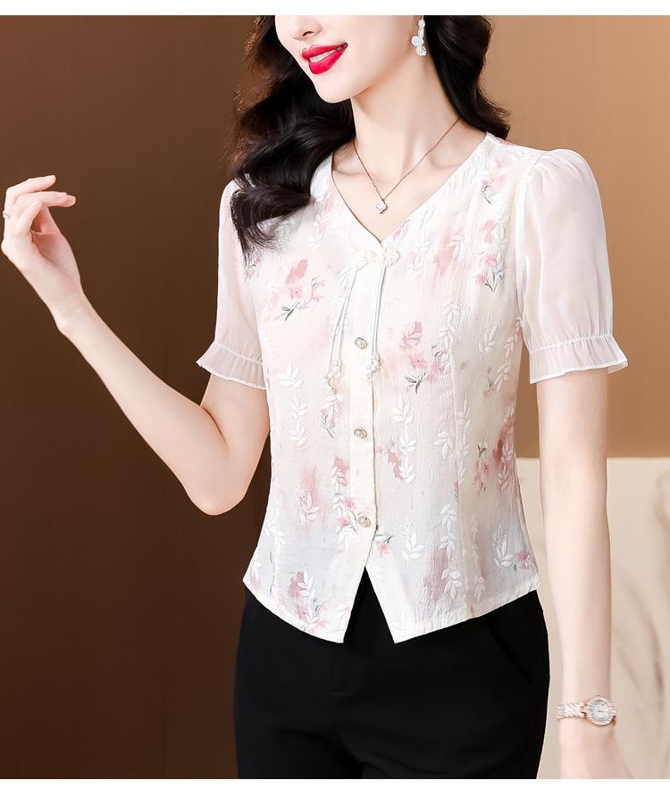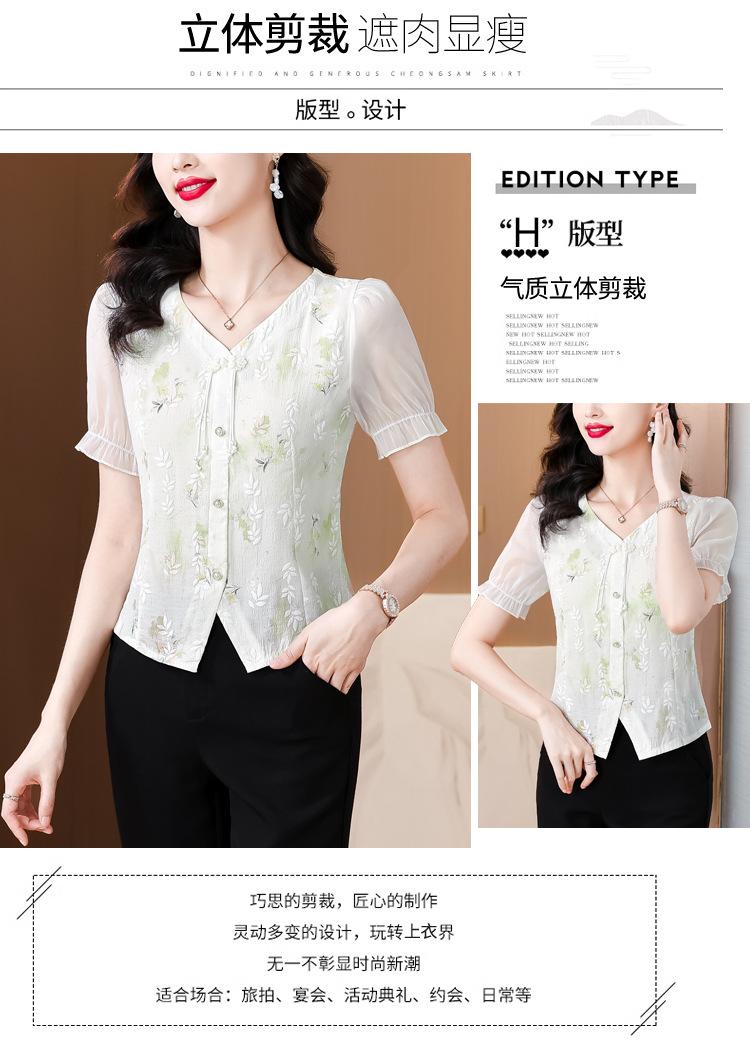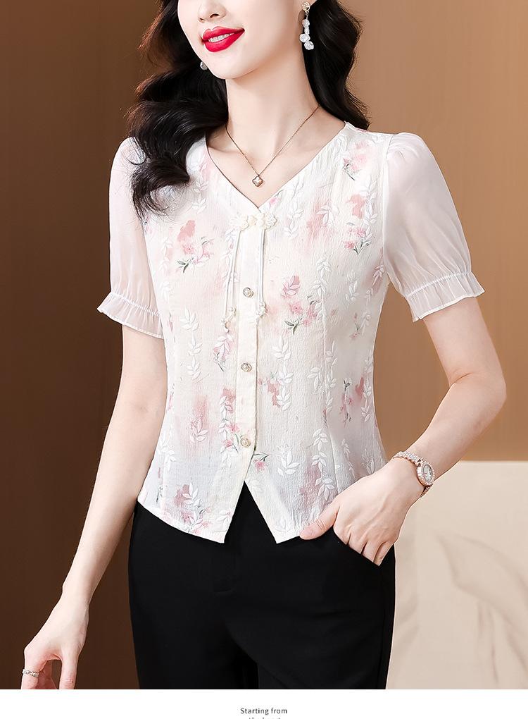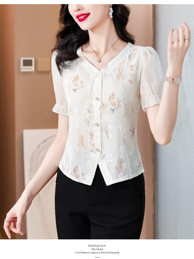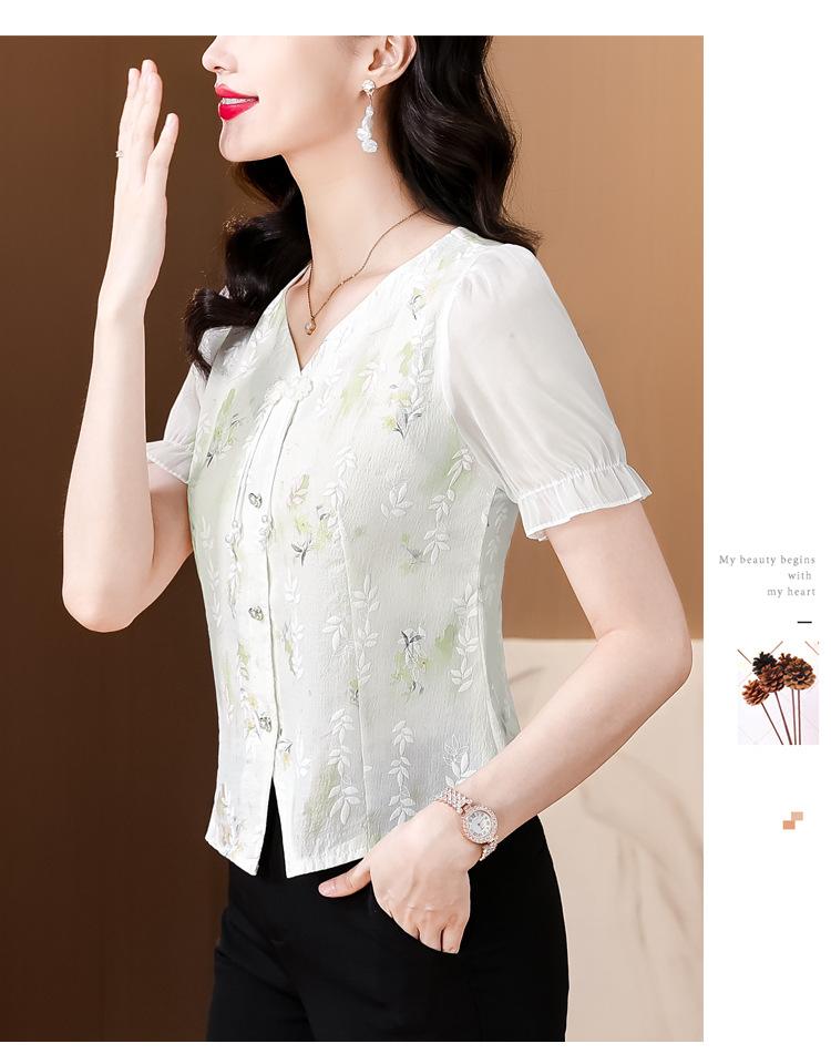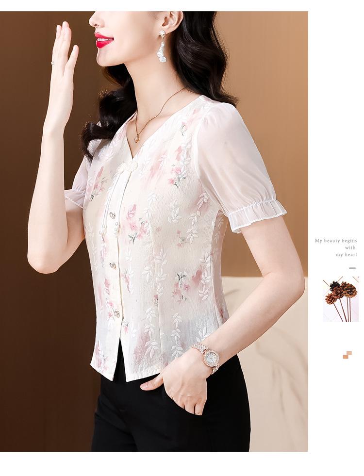 Camisa de gasa con botones Guofeng para mujer, prenda de verano 2025, nueva blusa adelgazante con cuello en V y estampado para madres.