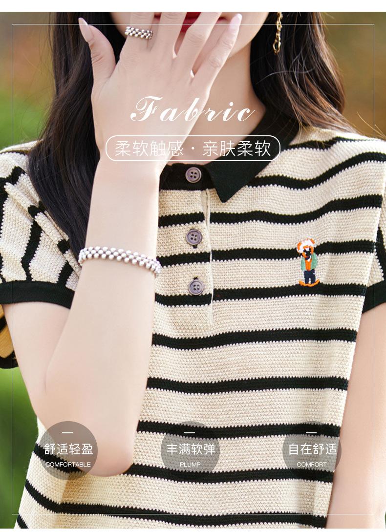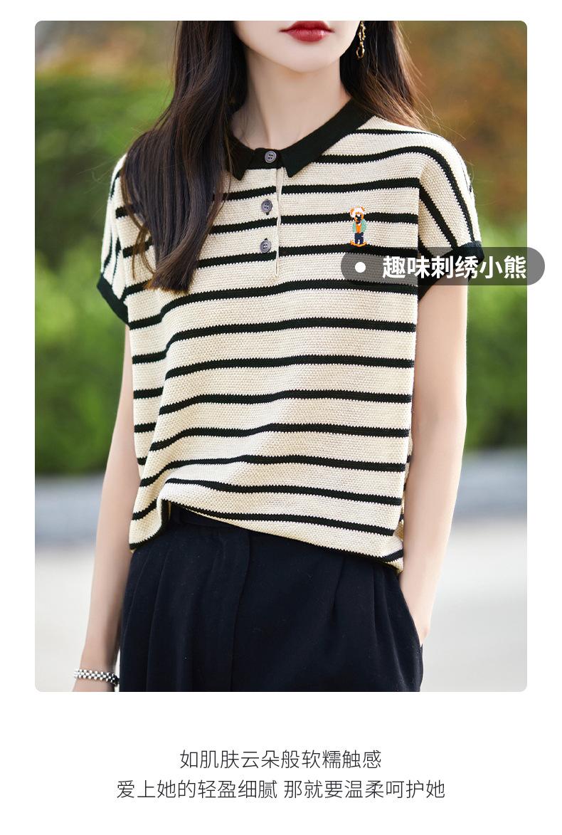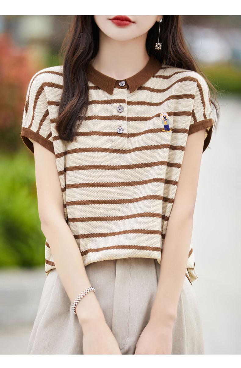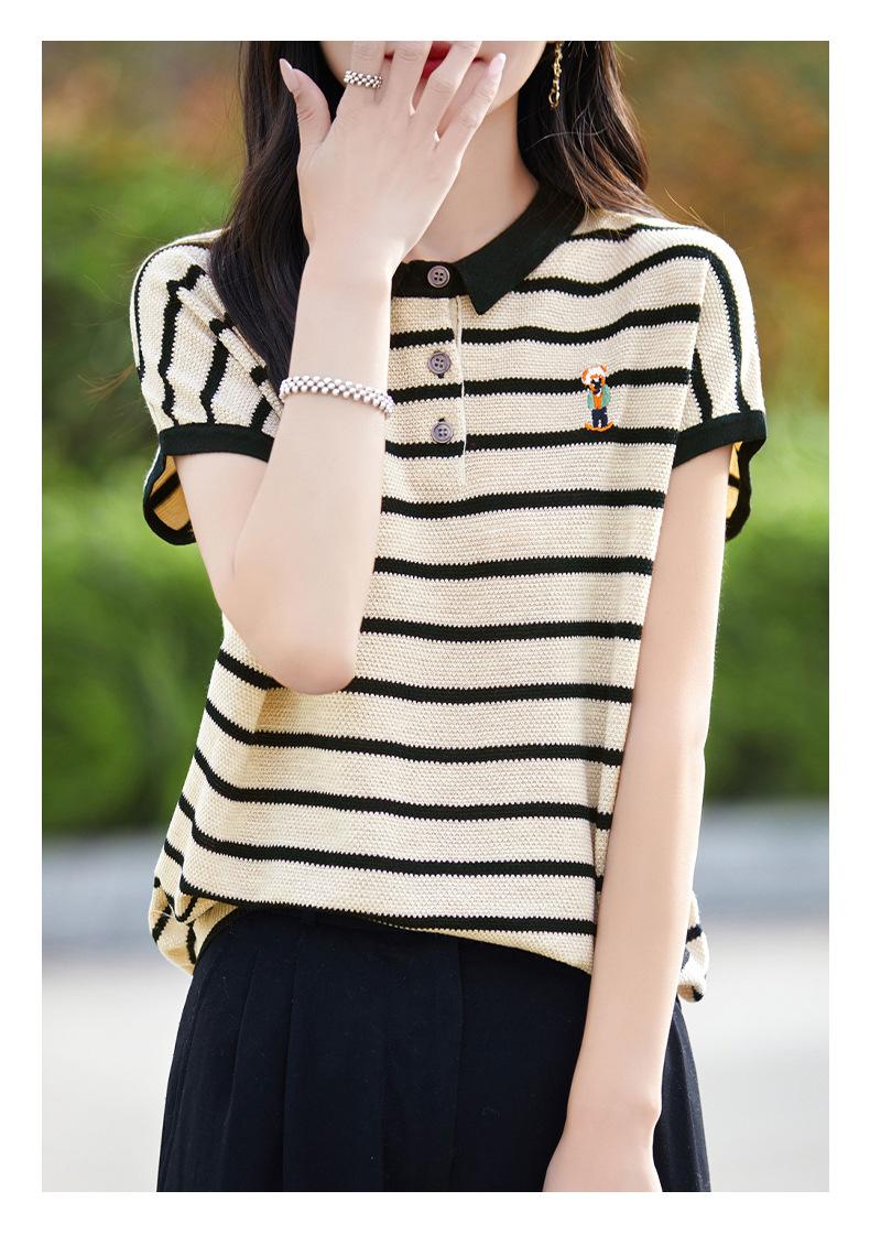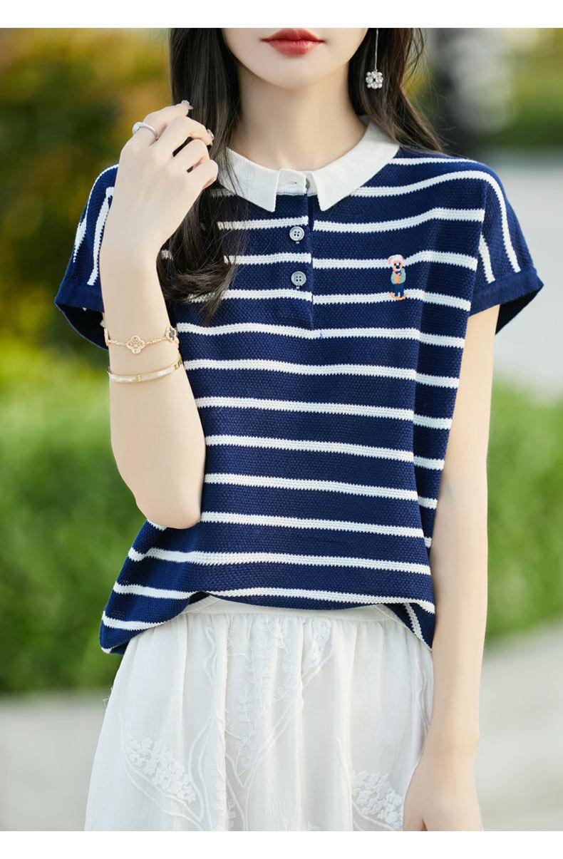 Camisa de punto de lana peinada con cuello tipo polo y rayas en contraste para mujer, estilo elegante y antiedad, bordada, novedad de verano de 2025