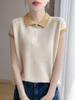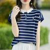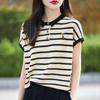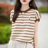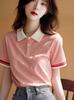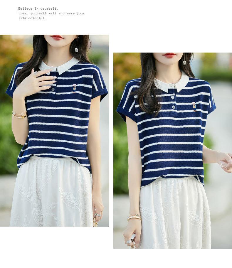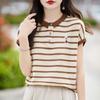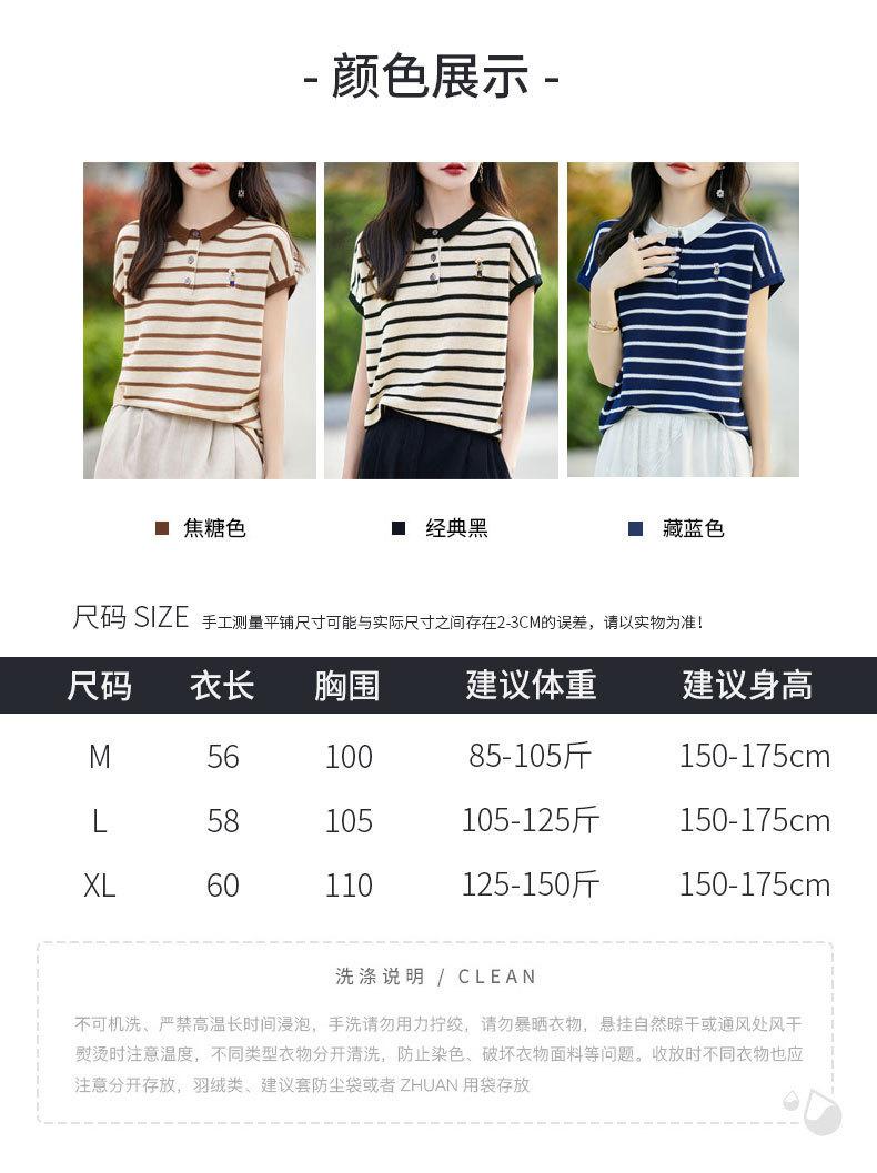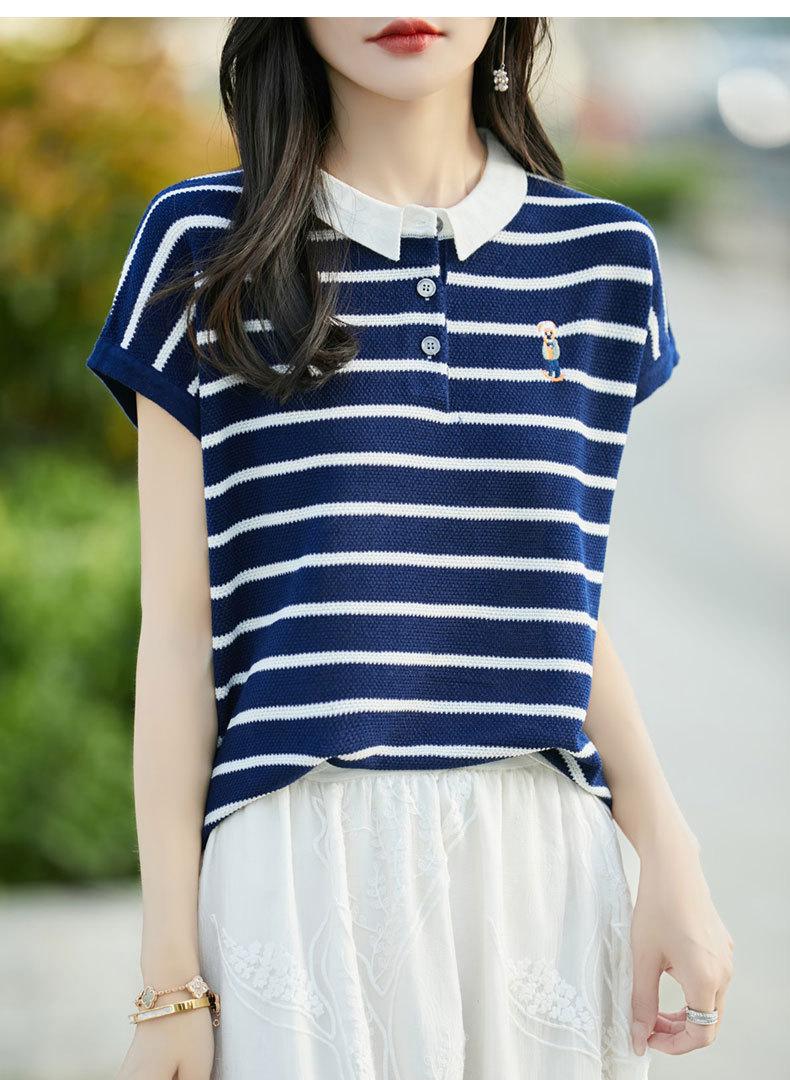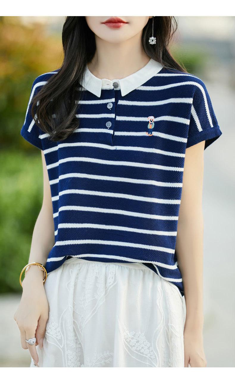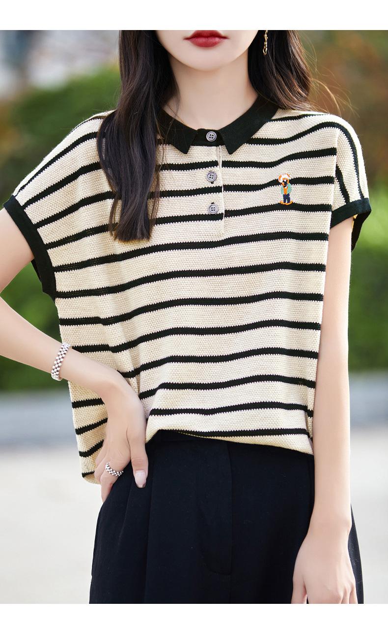 Camisa de punto de lana peinada con cuello tipo polo y rayas en contraste para mujer, estilo elegante y antiedad, bordada, novedad de verano de 2025