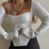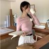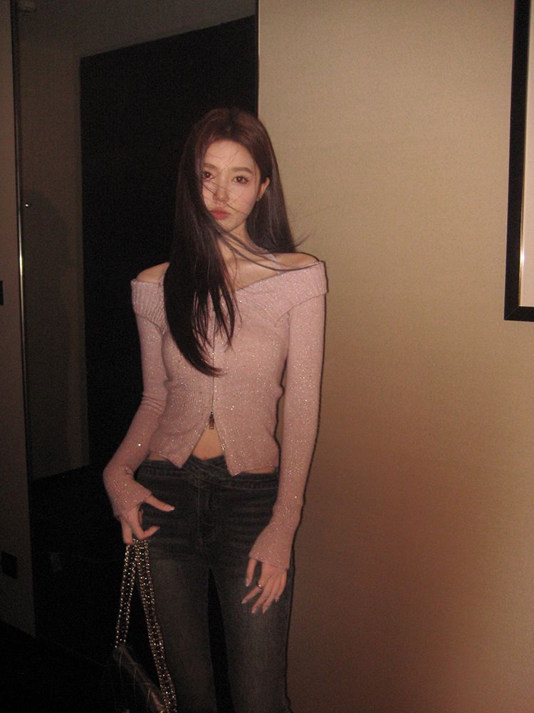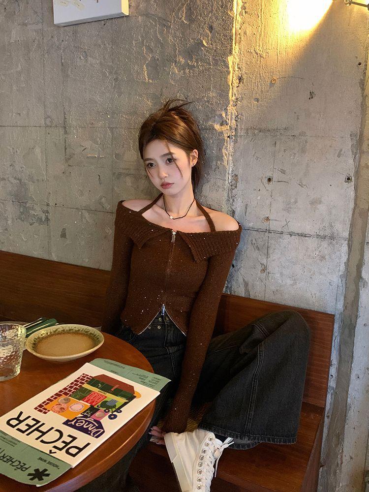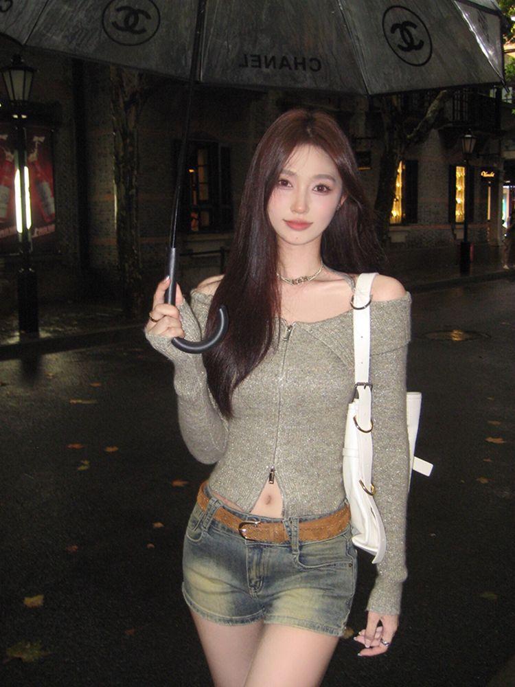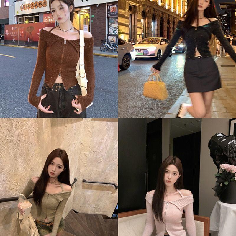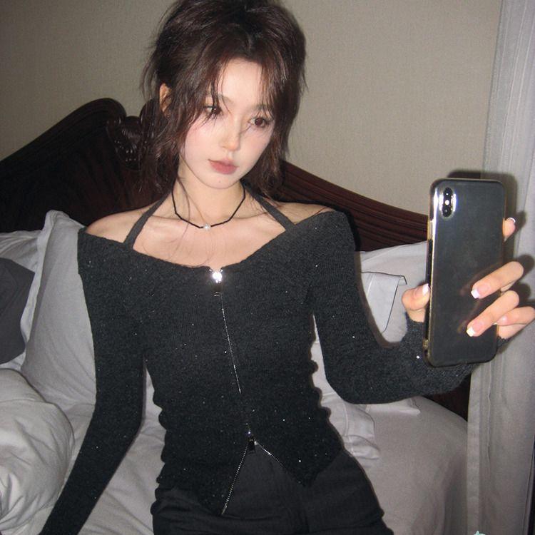 2024 Invierno Hombro Descubierto Cremallera Tejido de Punto Manga Larga Camiseta Ajustada Diseño Adelgazante Sentido Nicho Cuello Hombro Descubierto Suéter