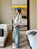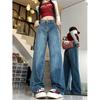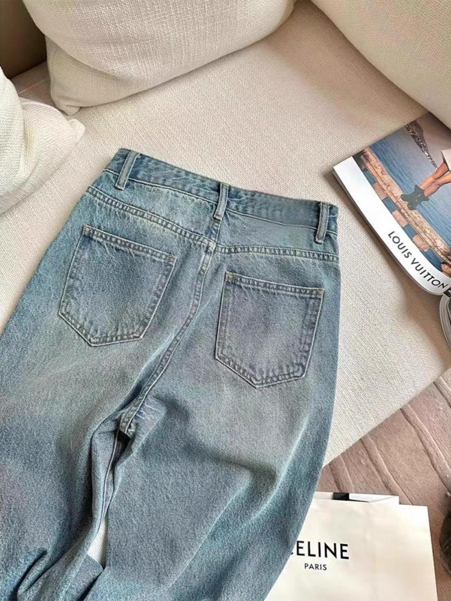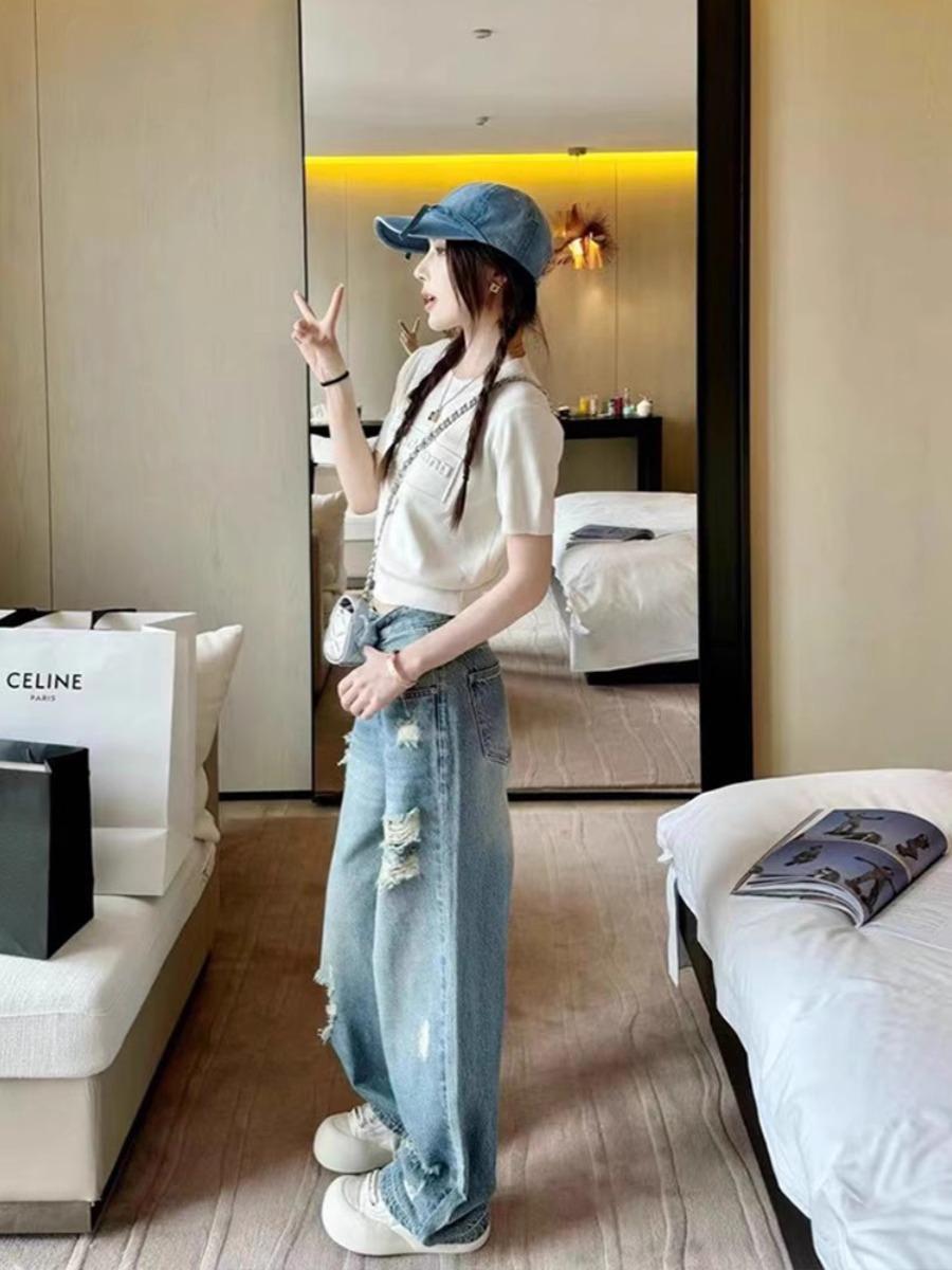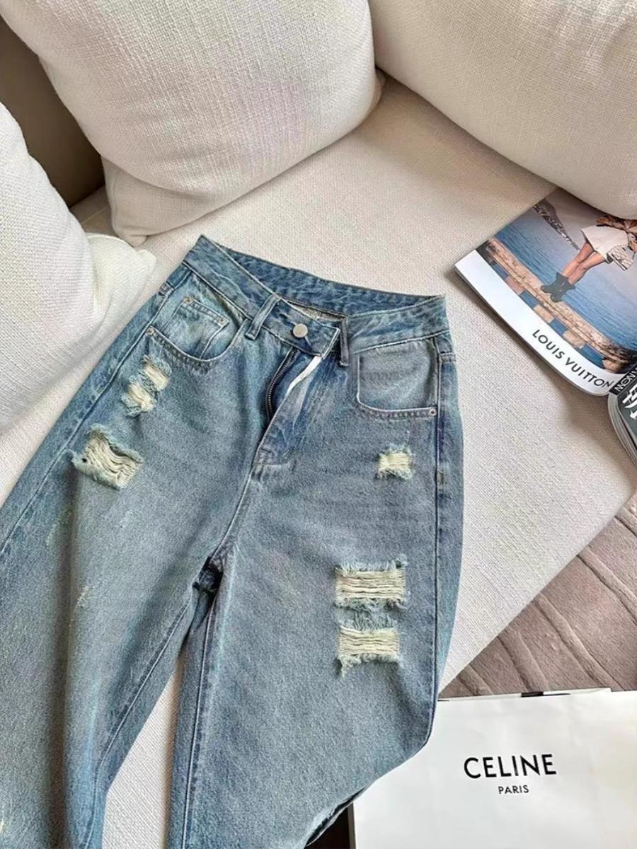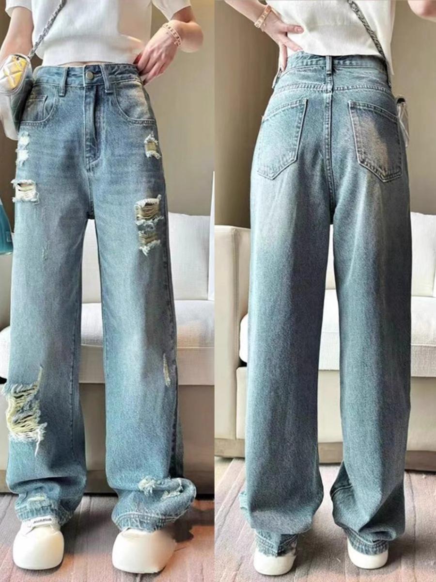 Azul claro Cintura Alta Corte Slim Jeans Rotos Pantalones de Verano Holgados Rectos de Pierna Ancha para Mujer