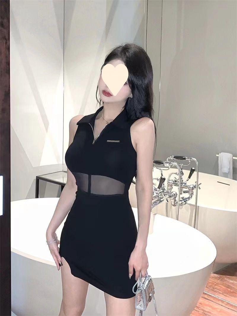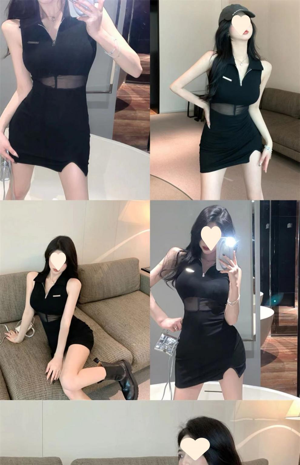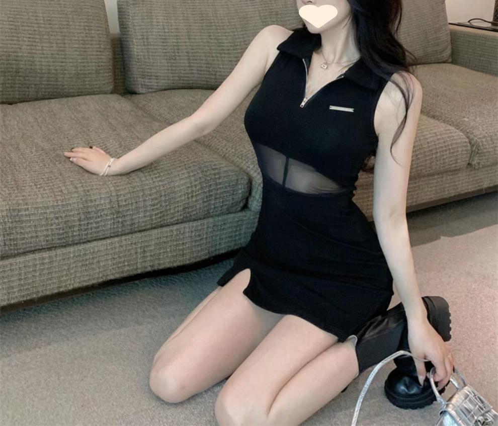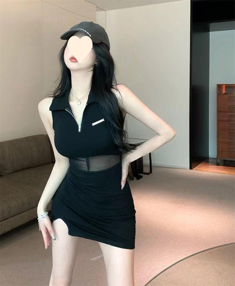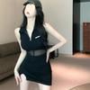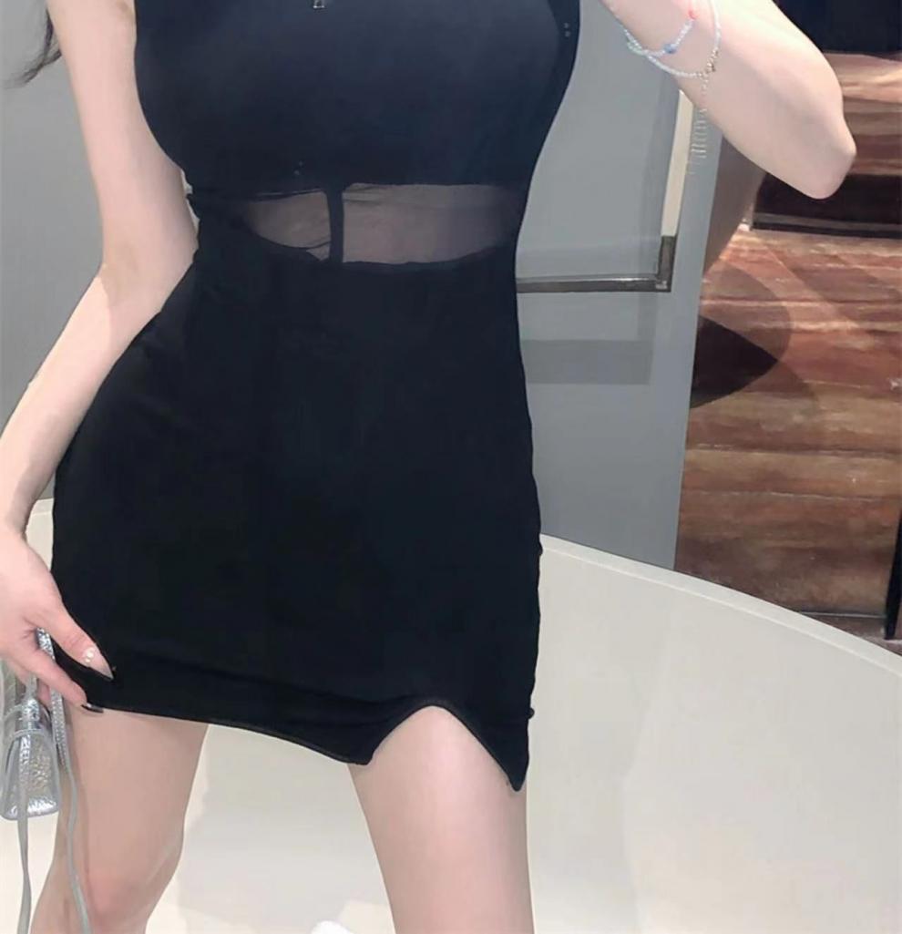 Vestido tipo chaleco sin mangas negro con solapa y costuras de malla de Spice Girl para mujer, falda sexy de cintura dividida en la cadera de verano