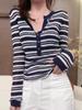 Camiseta de manga larga a rayas de colores contrastantes con cuello en V sexy para chicas calientes, para mujer, de principios de otoño, nueva, ajustada, adelgazante, que combina con todo.