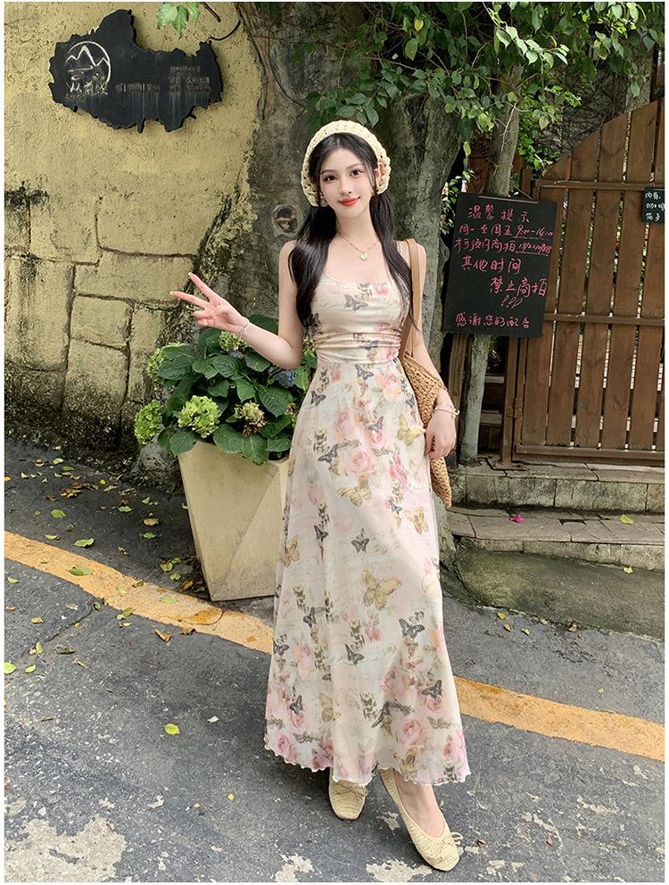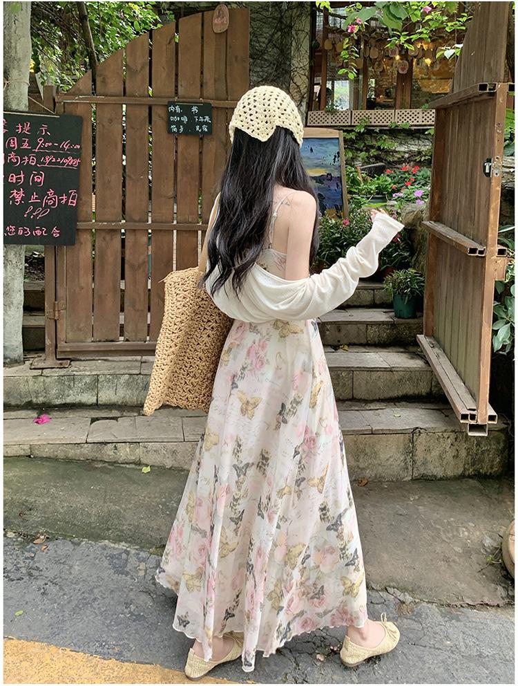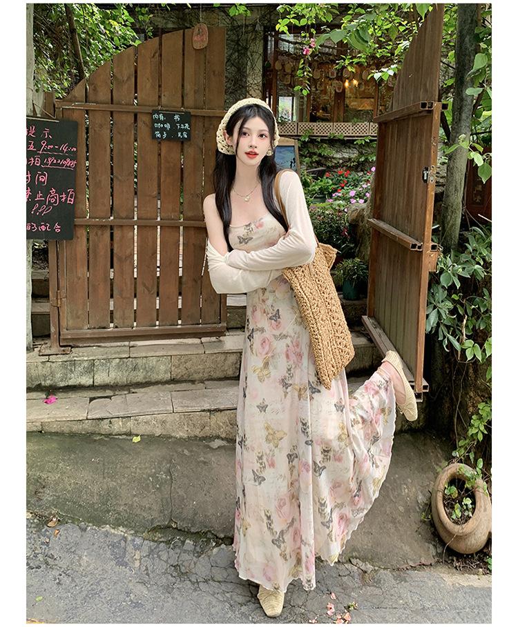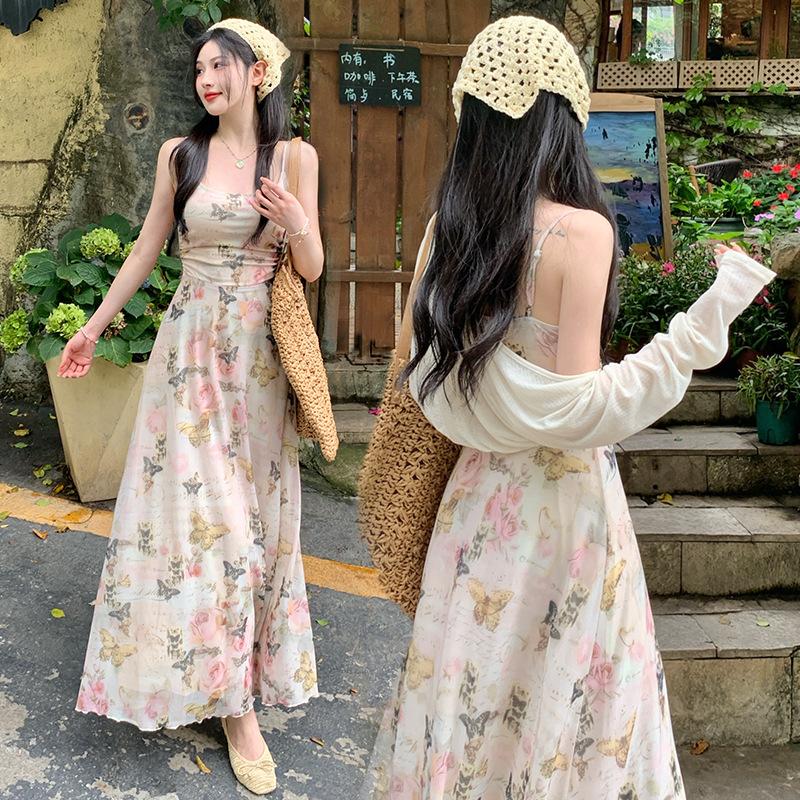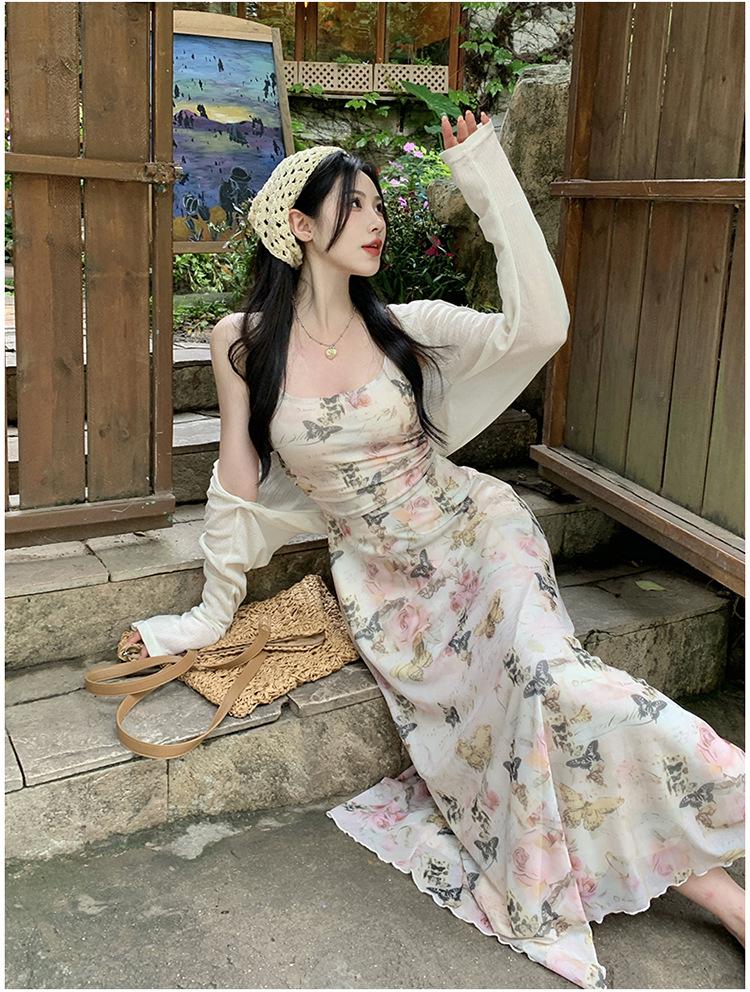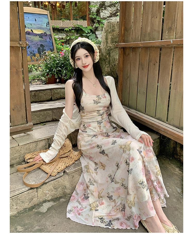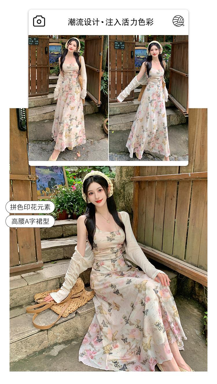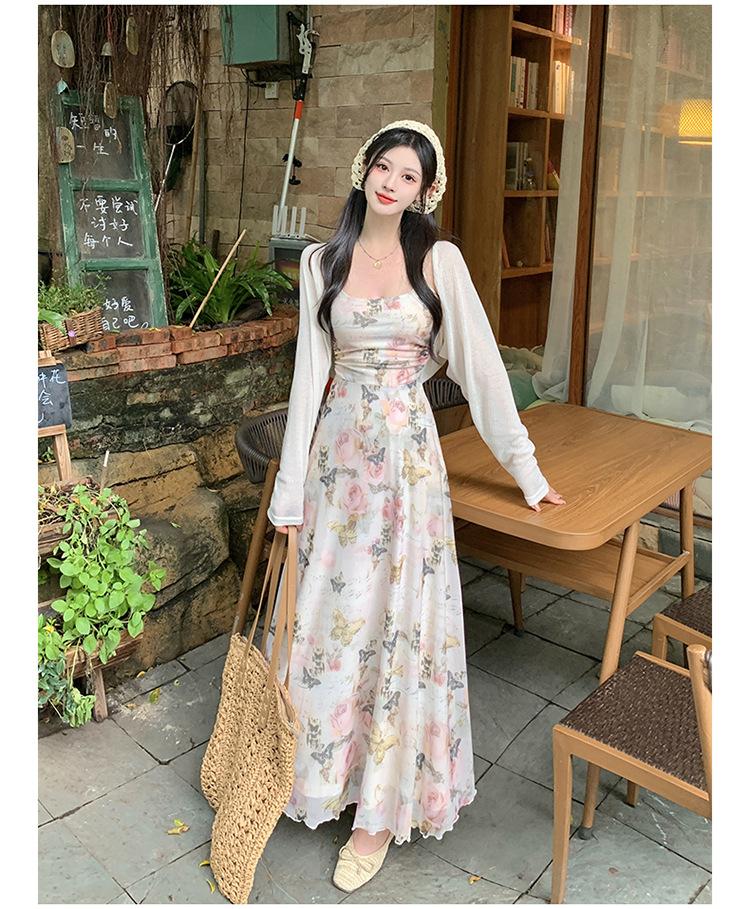Vestido tipo cárdigan de talla grande para mujer, estilo francés, elegante, con cintura en forma de A, estampado floral, con protector solar, conjunto de dos piezas