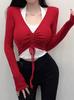 Camiseta de manga larga ajustada con cordón ajustable y cuello colgante con diseño de nicho para chica sexy a la moda, camiseta única con parte inferior