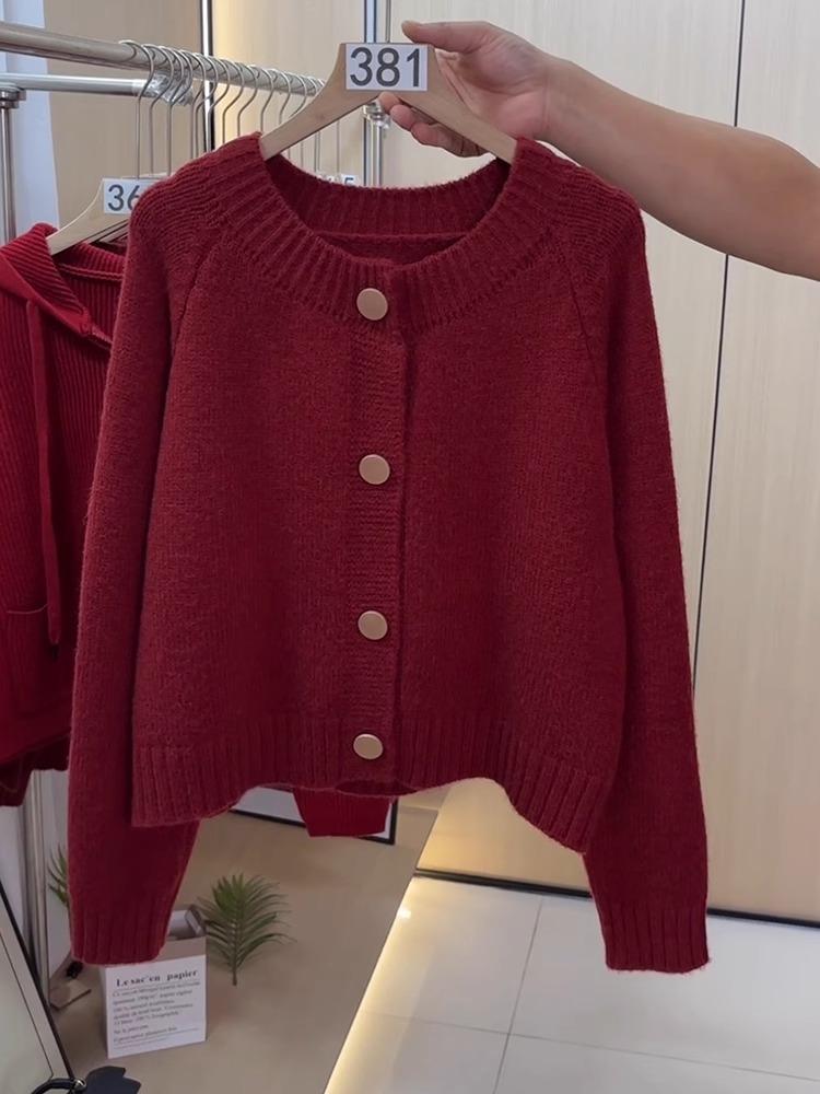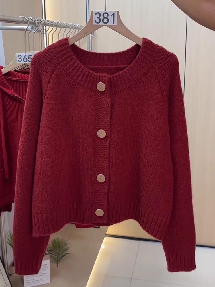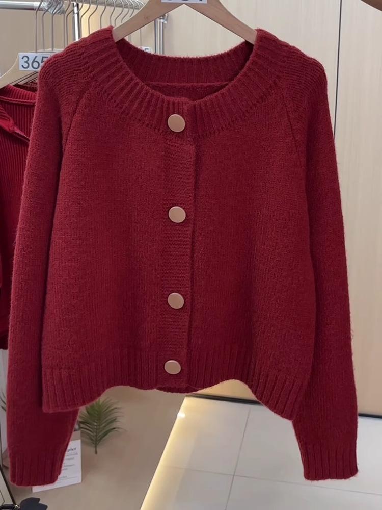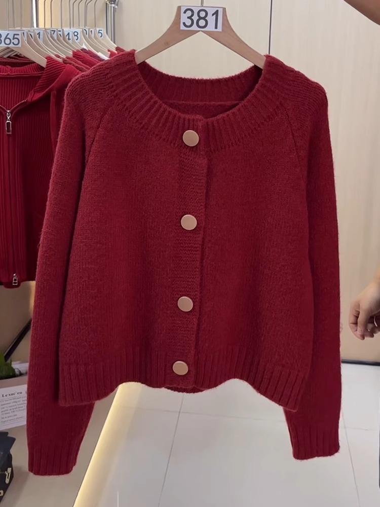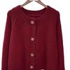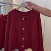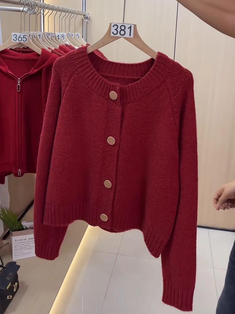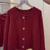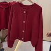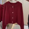 Suéter cárdigan de punto de manga larga con cuello redondo rojo de comercio exterior de la estación europea, chaqueta superior de mujer con cuello redondo nueva de primavera abierta