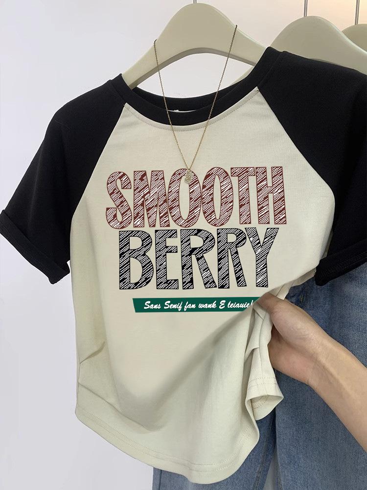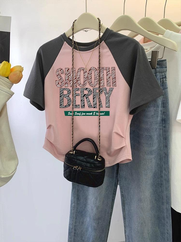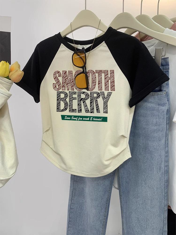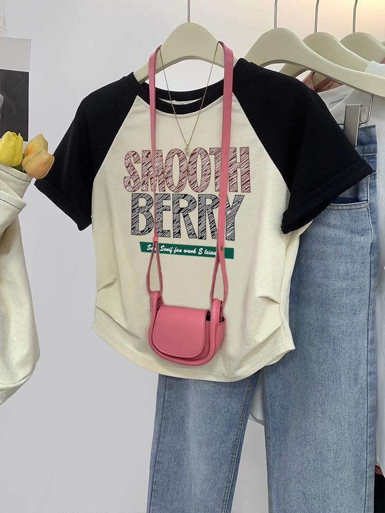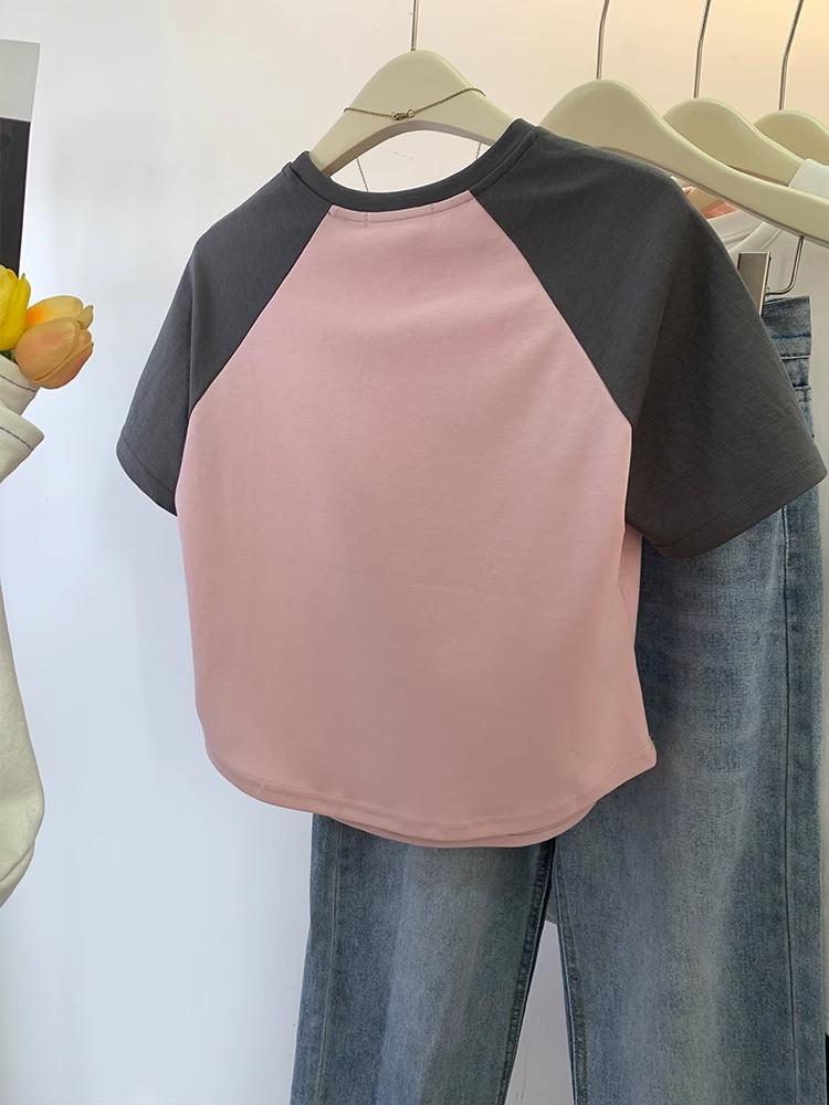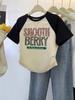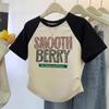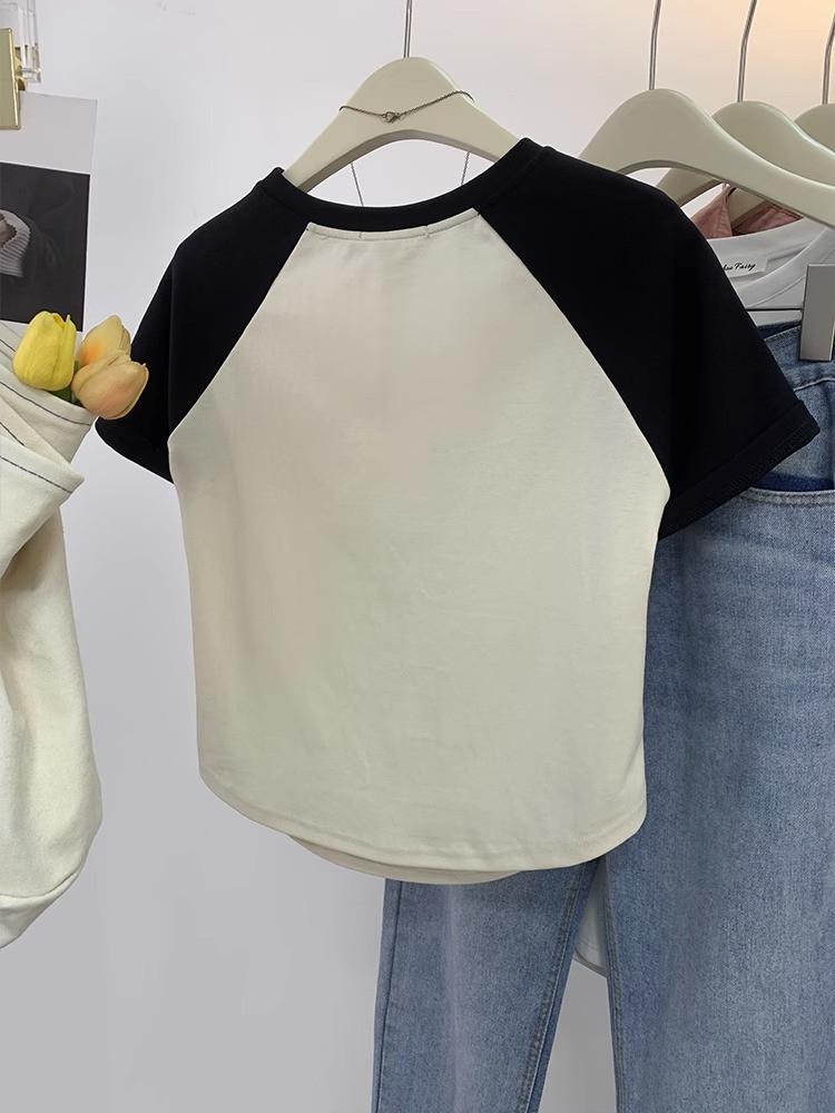 Camiseta de Manga Corta con Manga Raglán Diseñada para Mujer Verano 2025 Nueva Color Contrastante Estilo Nicho Hombro Derecho Top