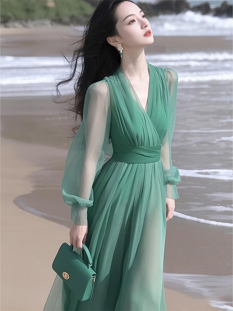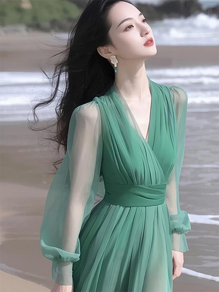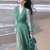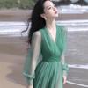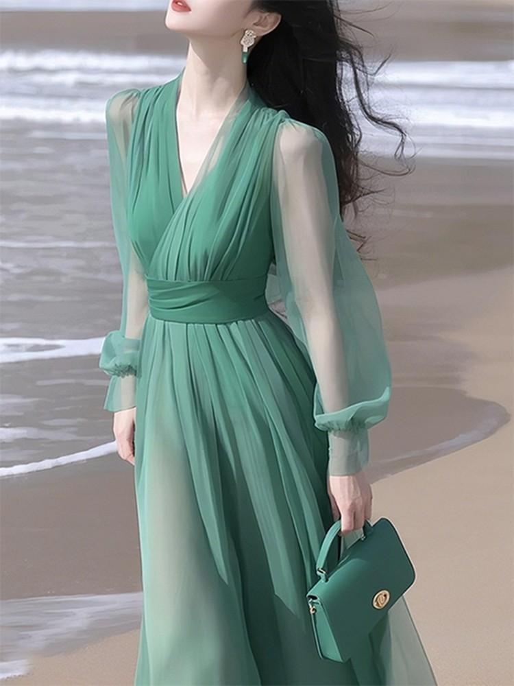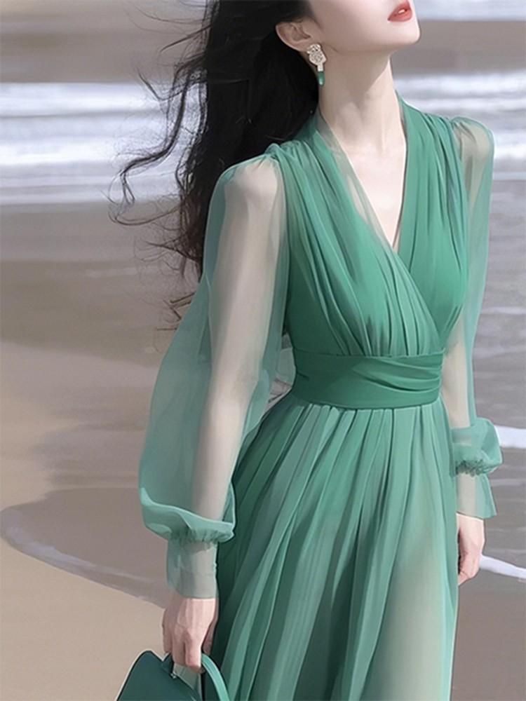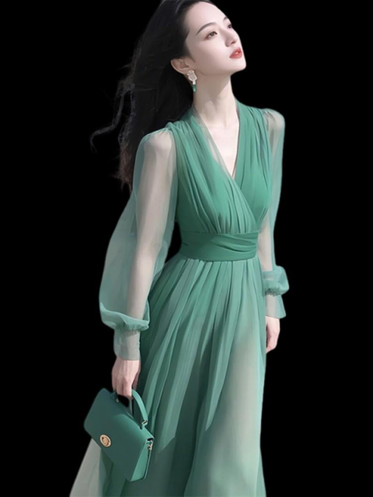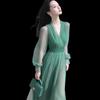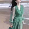Nuevo vestido de banquete de manga larga con escote en V profundo y malla de temperamento de hada súper adelgazante de comercio exterior de Amazon