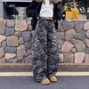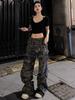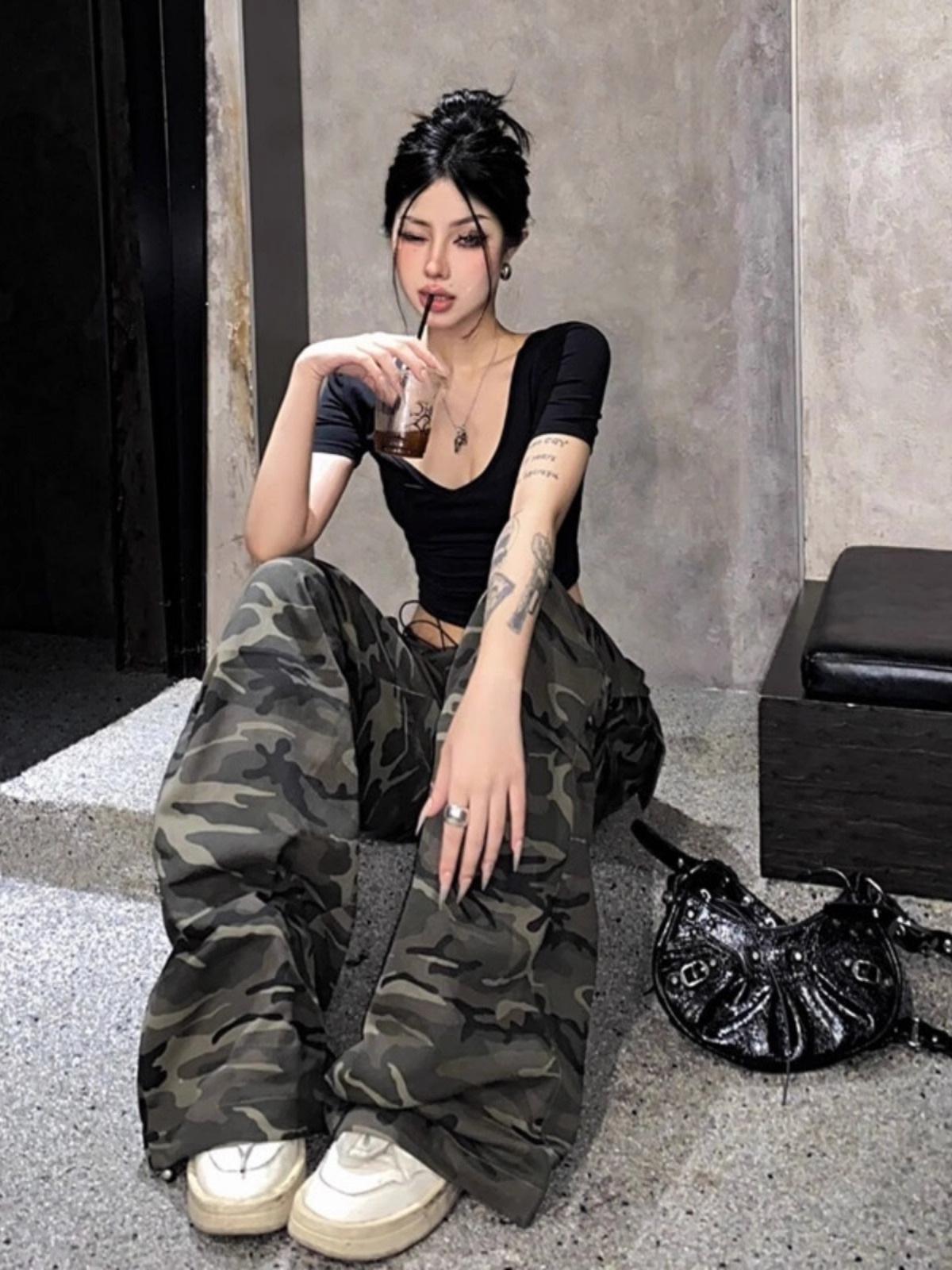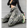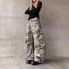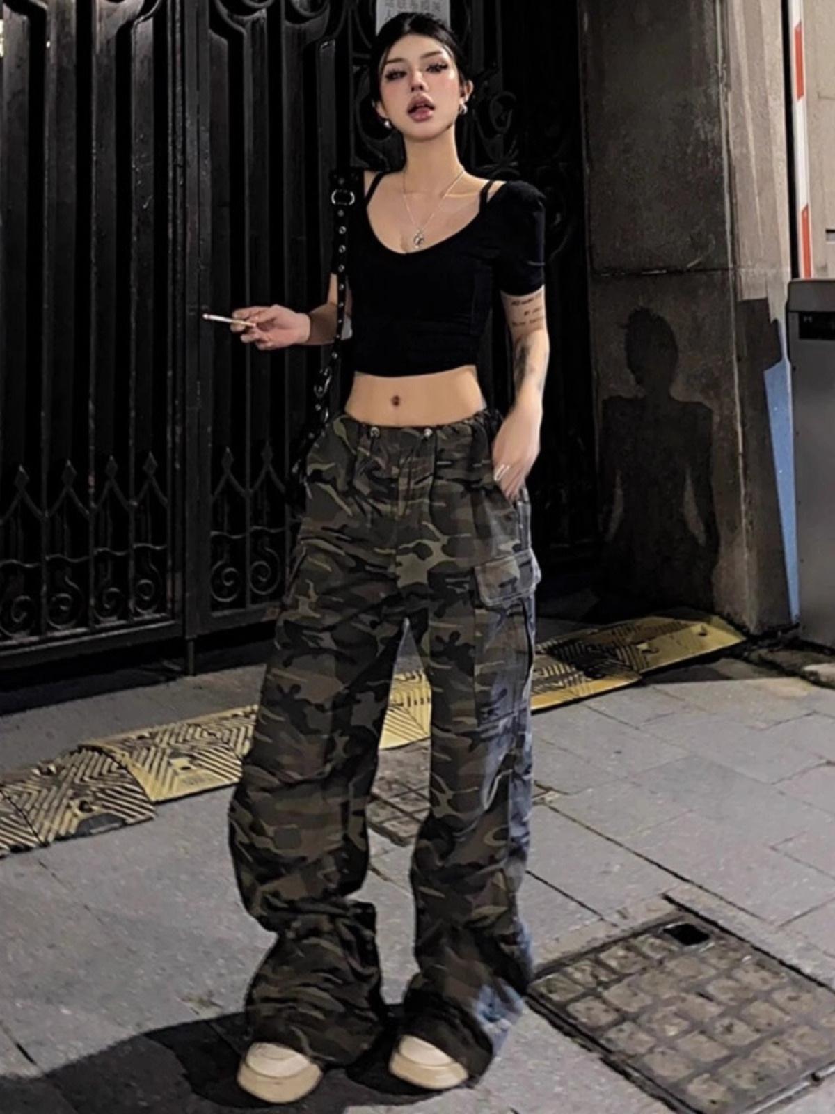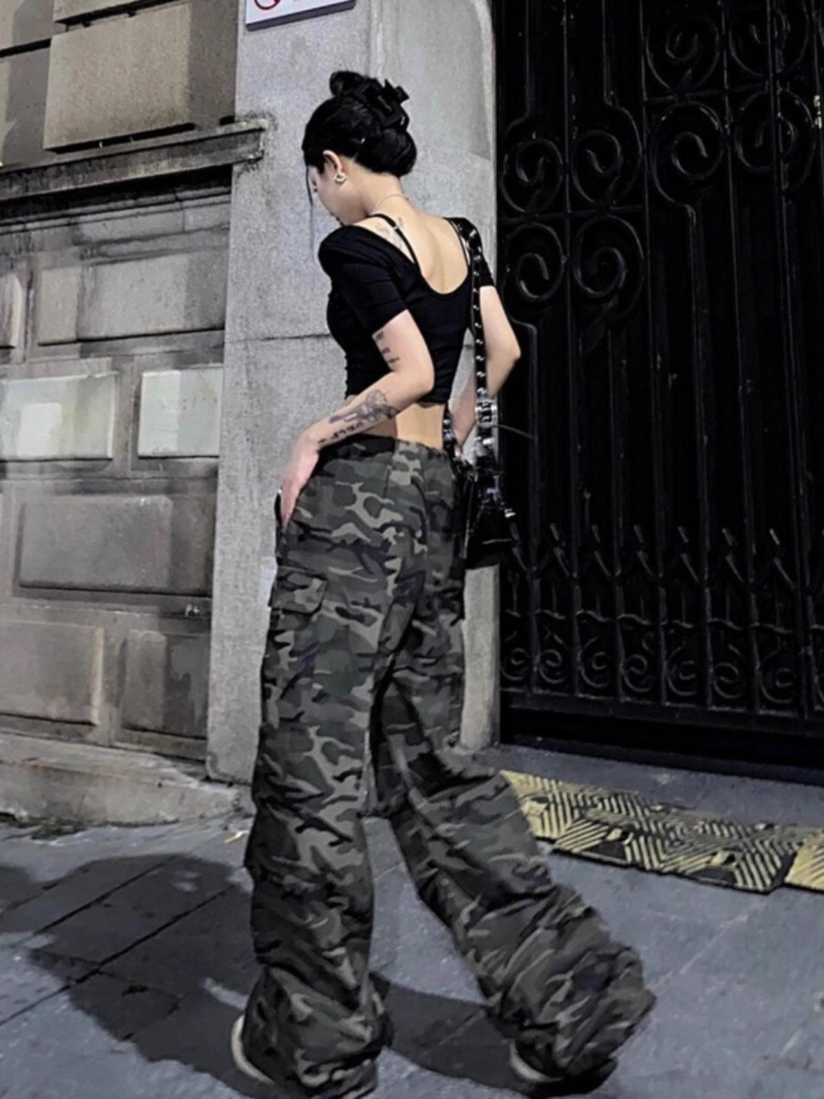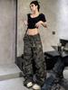 Pantalones casuales rectos de color verde militar vintage para mujer, estilo americano, holgados, de camuflaje, de cintura baja, adelgazantes