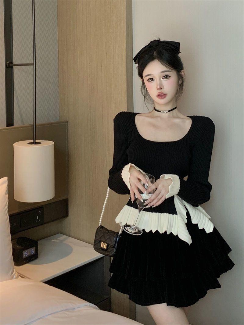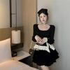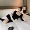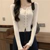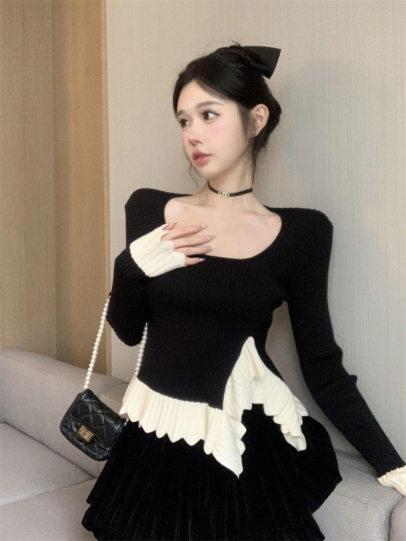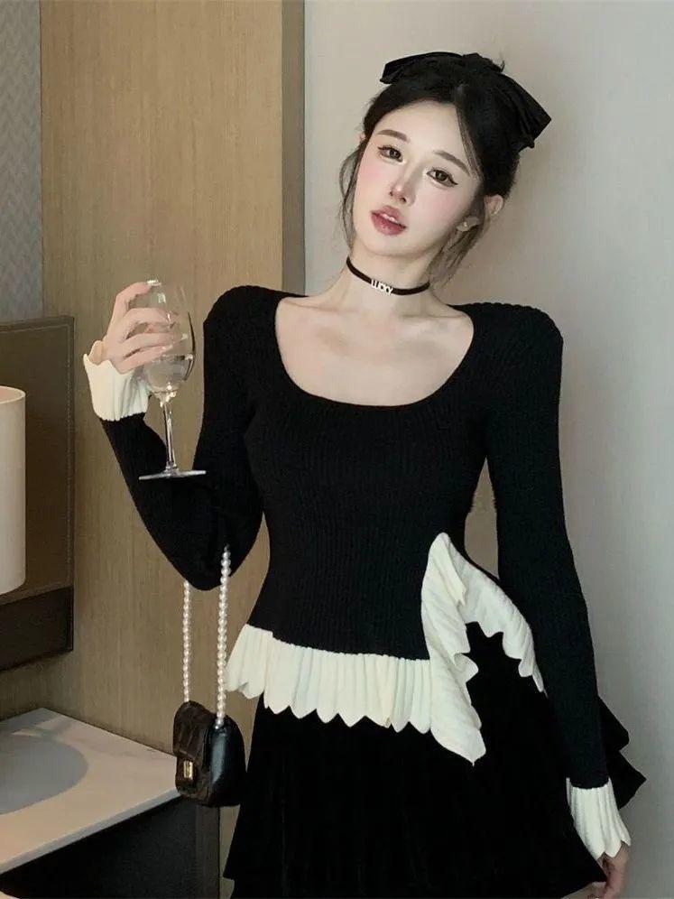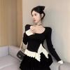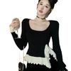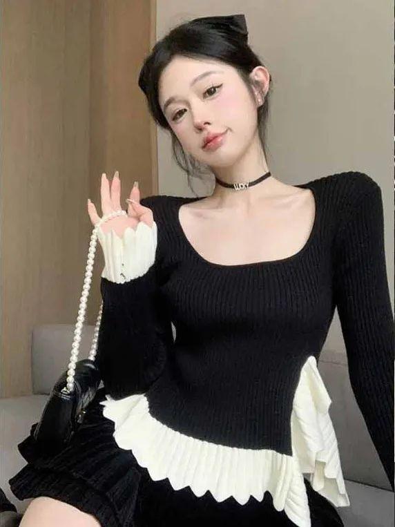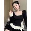 Camiseta Vintage Nicho Cuello Cuadrado Volantes Manga Larga Ajustada Diseño Adelgazante Sensación Deseo Puro Chica Hot Top Sexy Ins