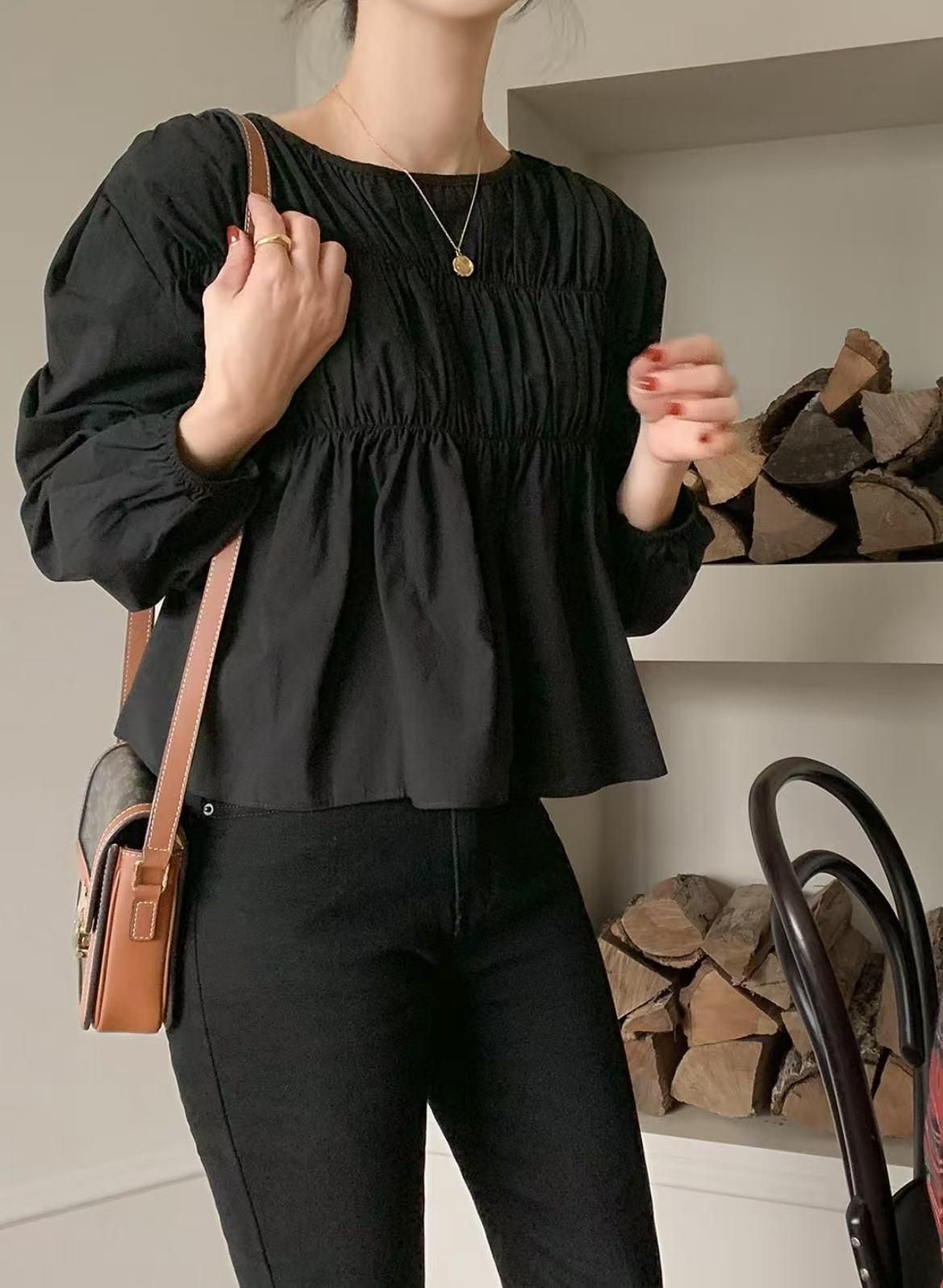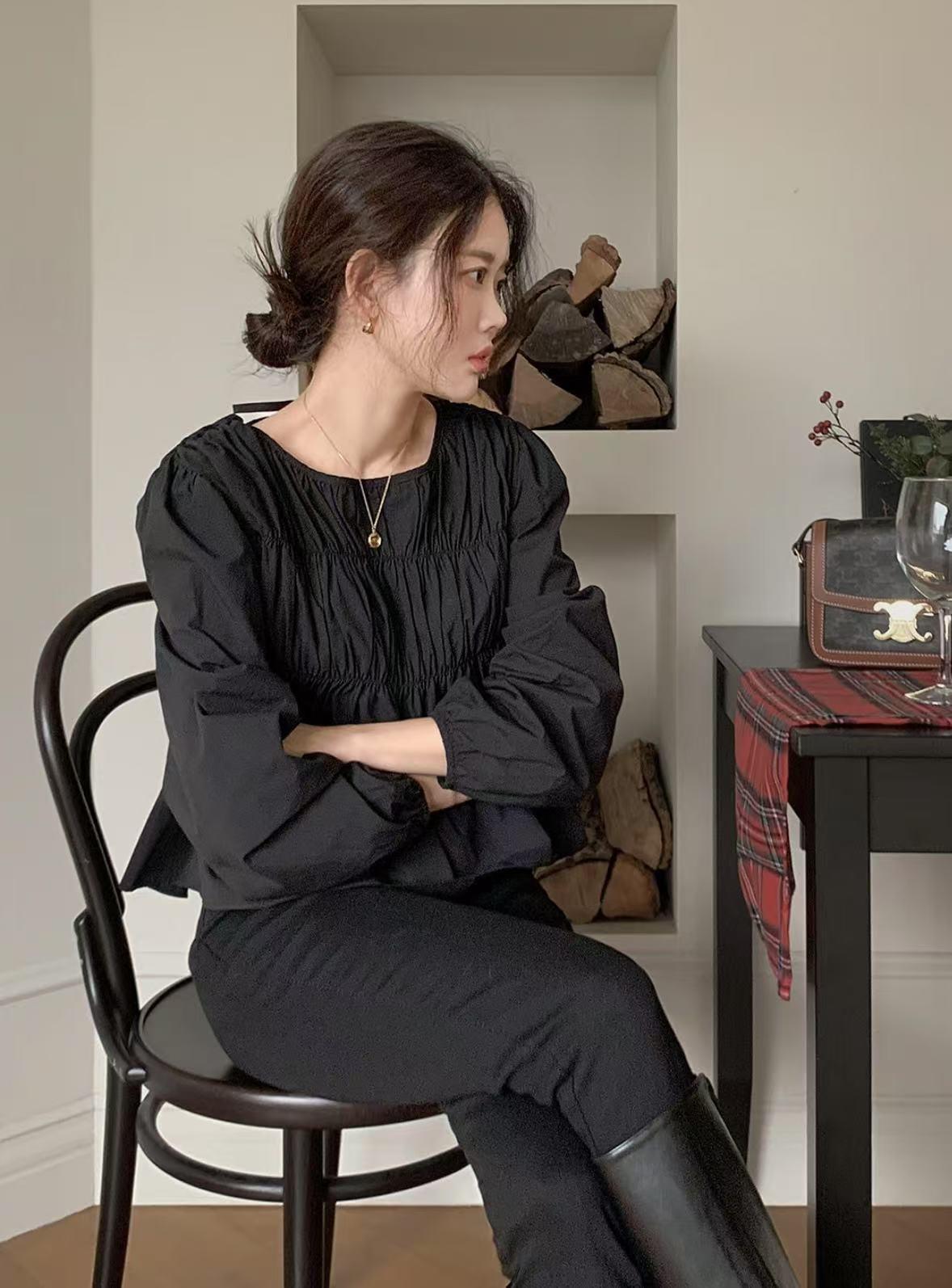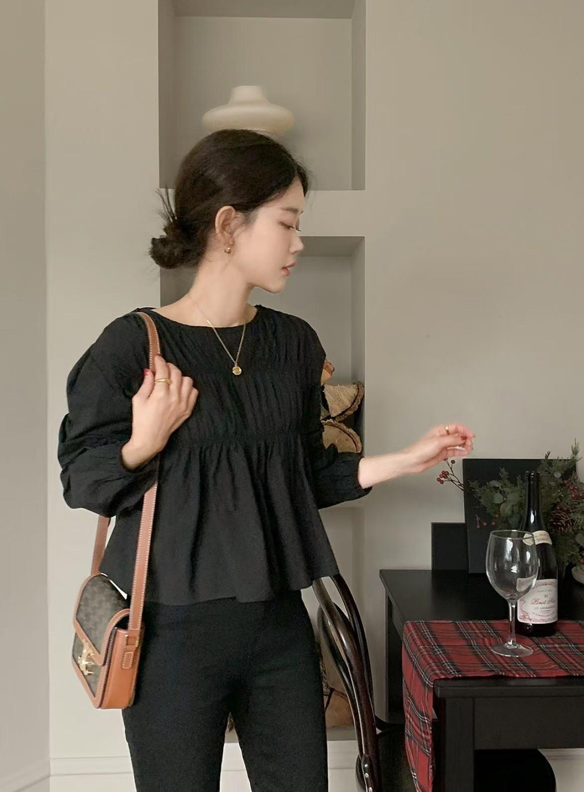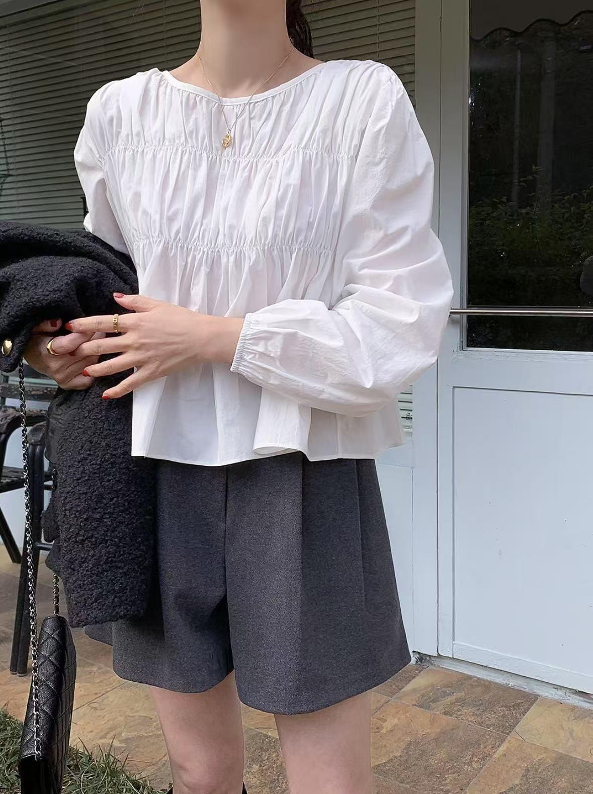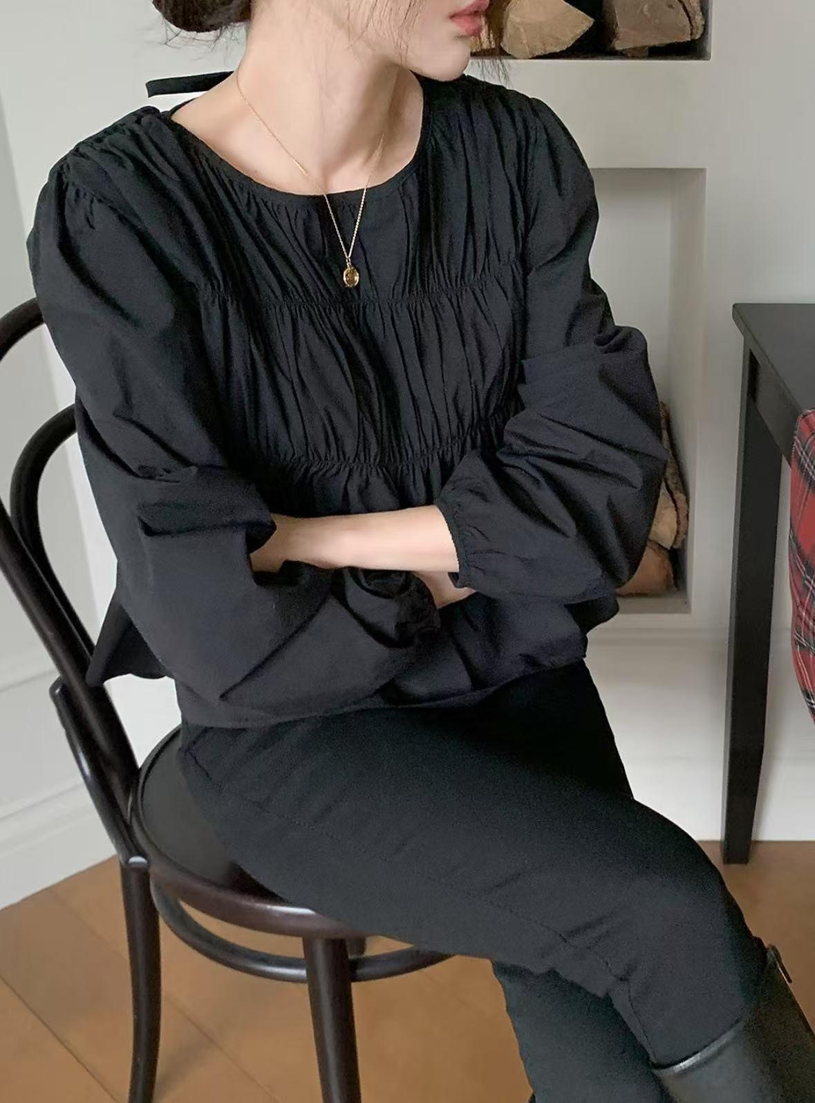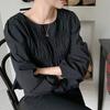 Camisa Chic de Cuello Redondo Plisada Holgada de Manga Larga para Mujer de Corea del Sur