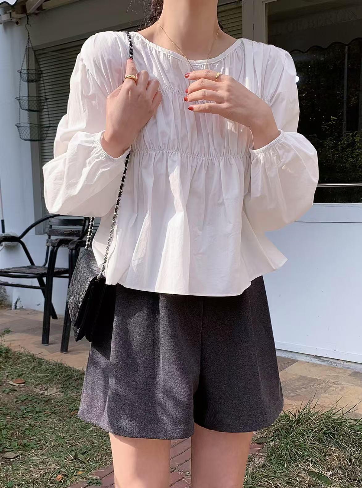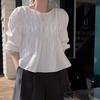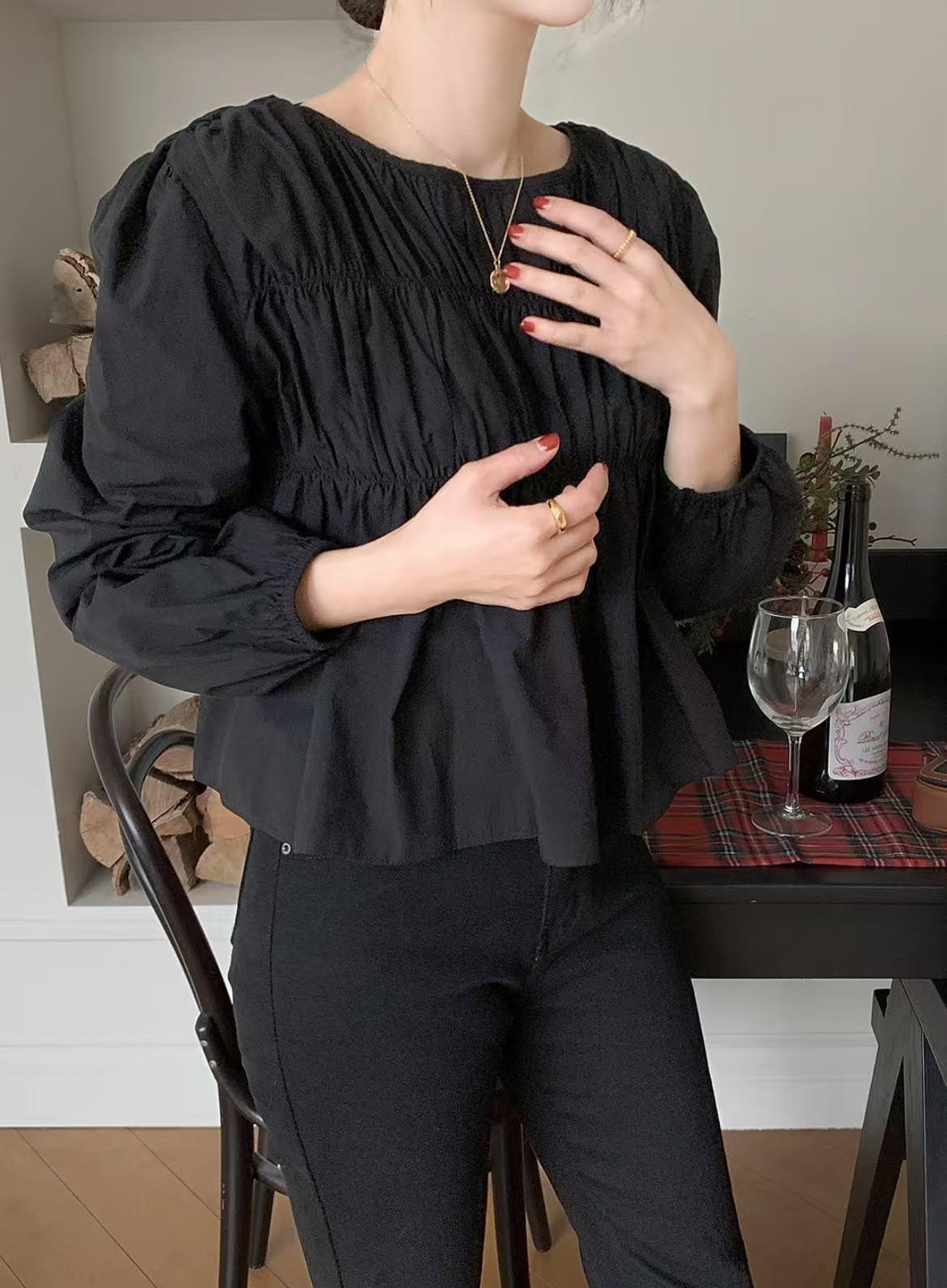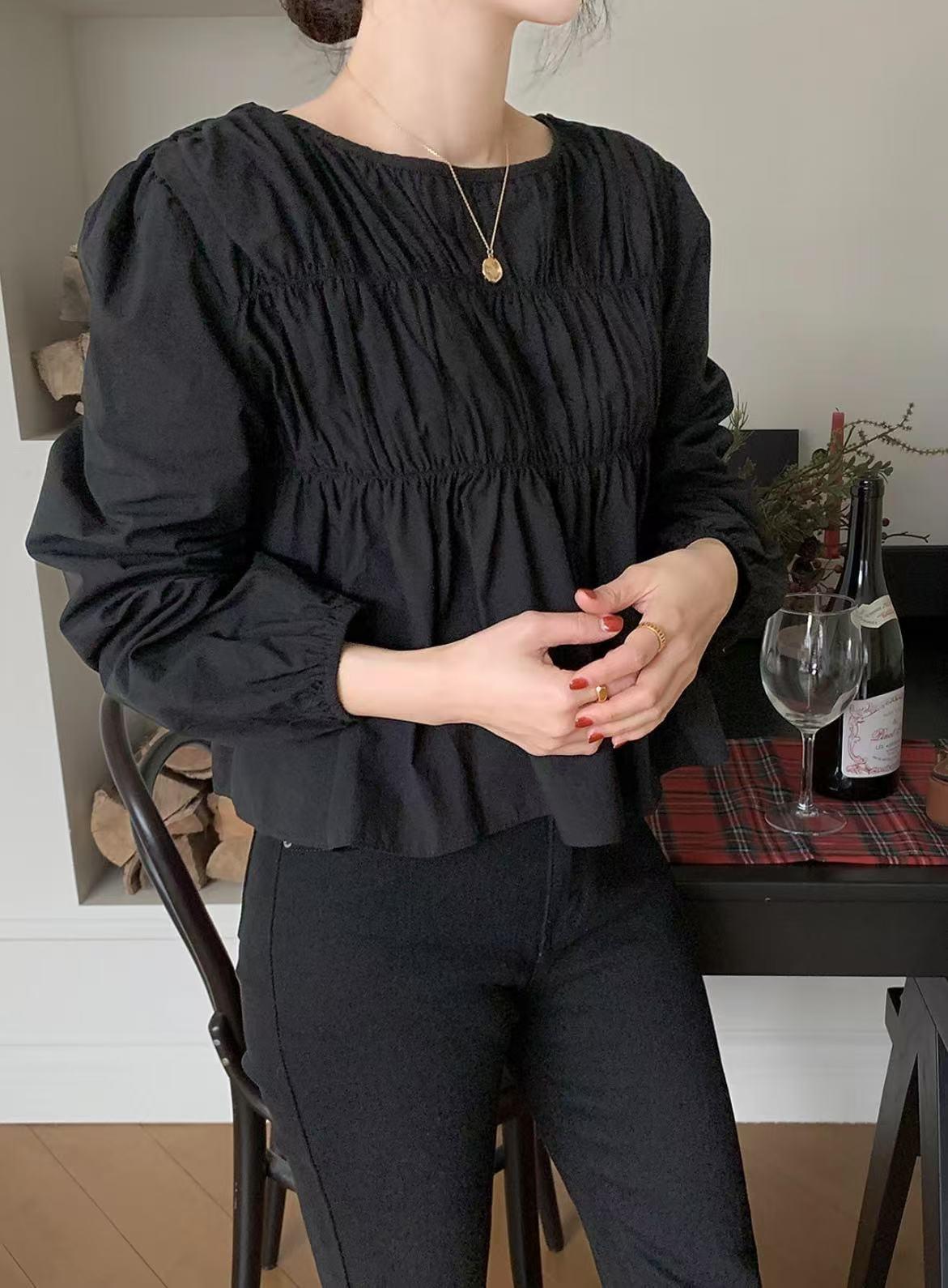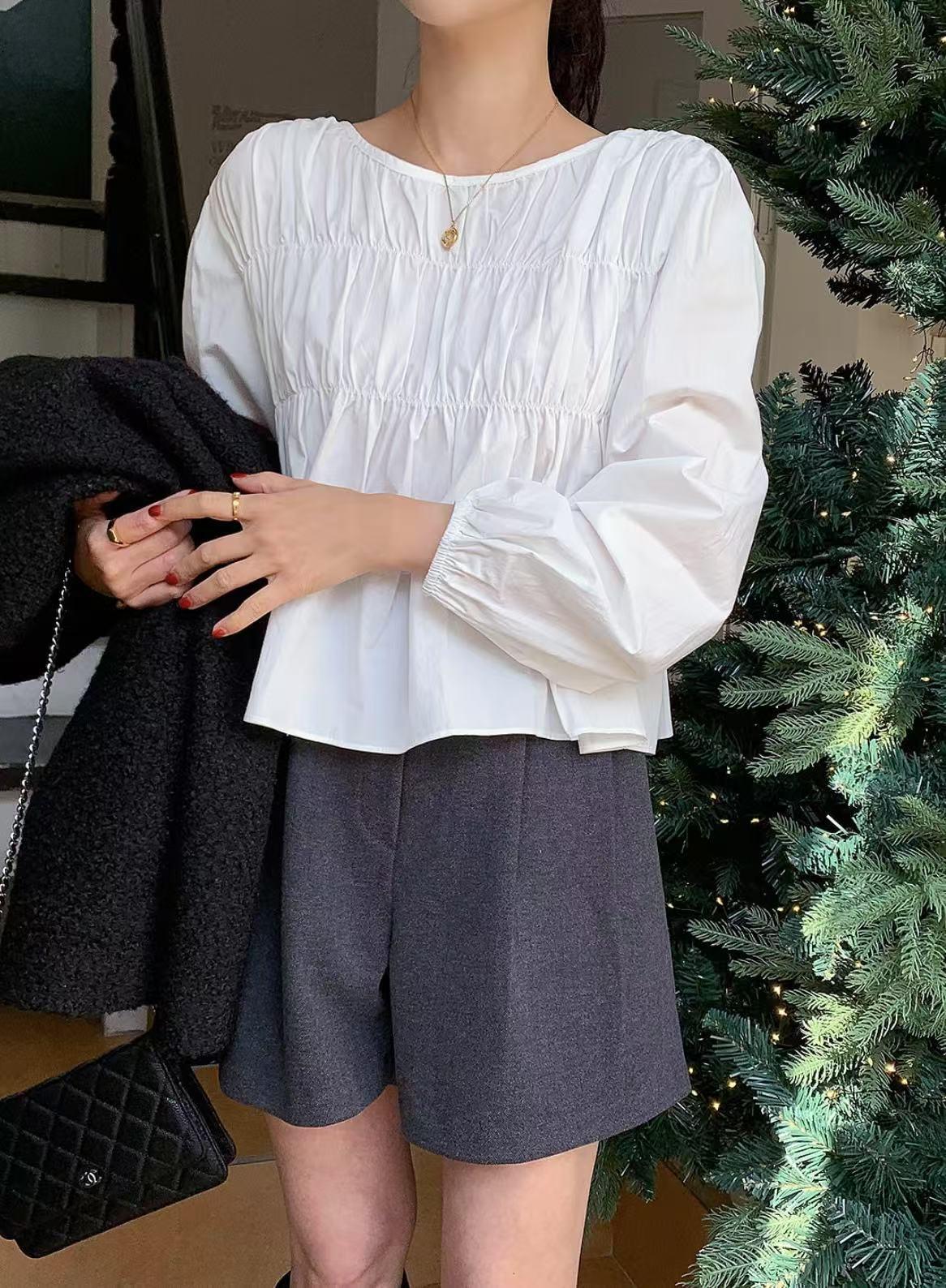 Camisa Chic de Cuello Redondo Plisada Holgada de Manga Larga para Mujer de Corea del Sur