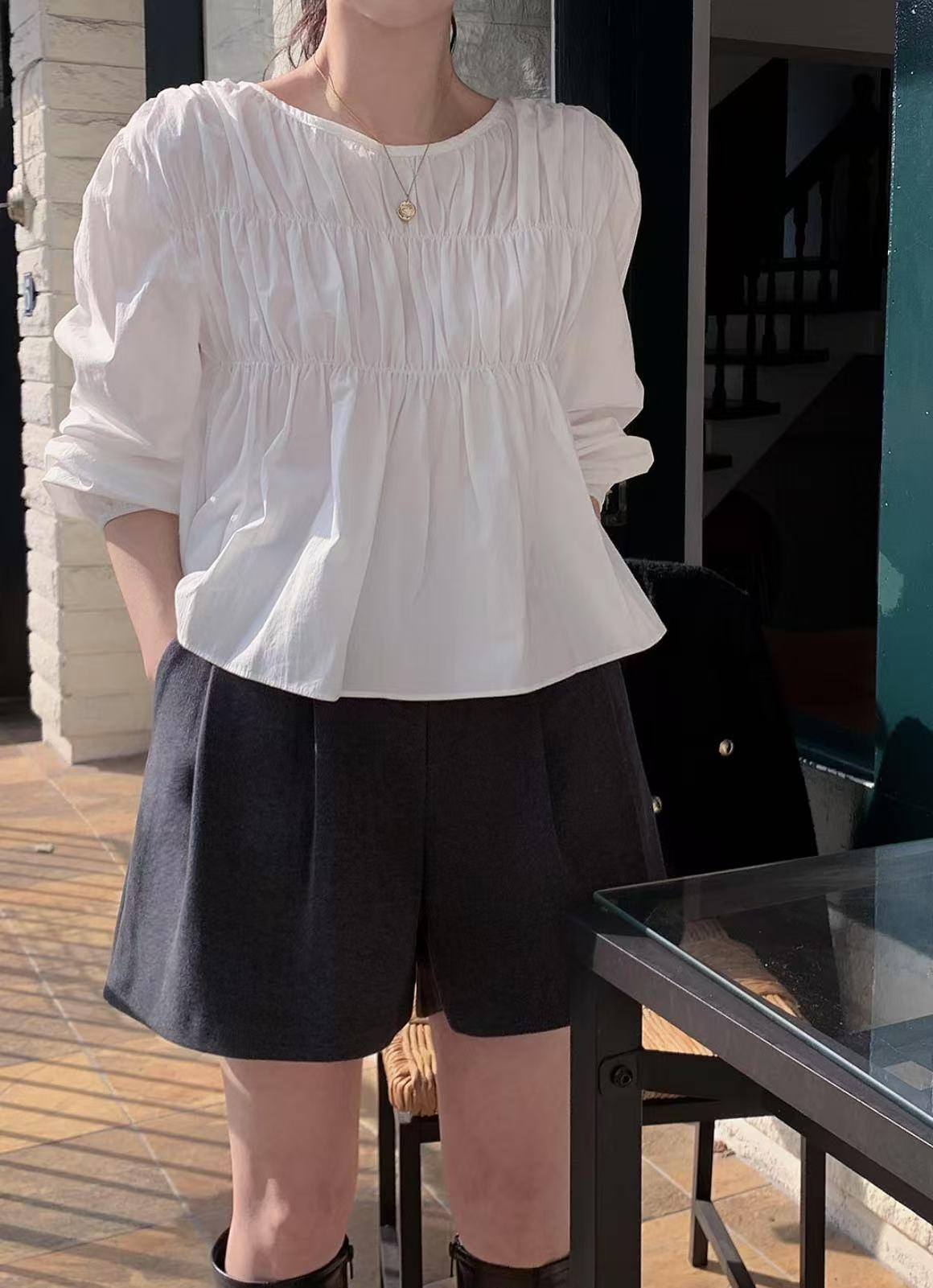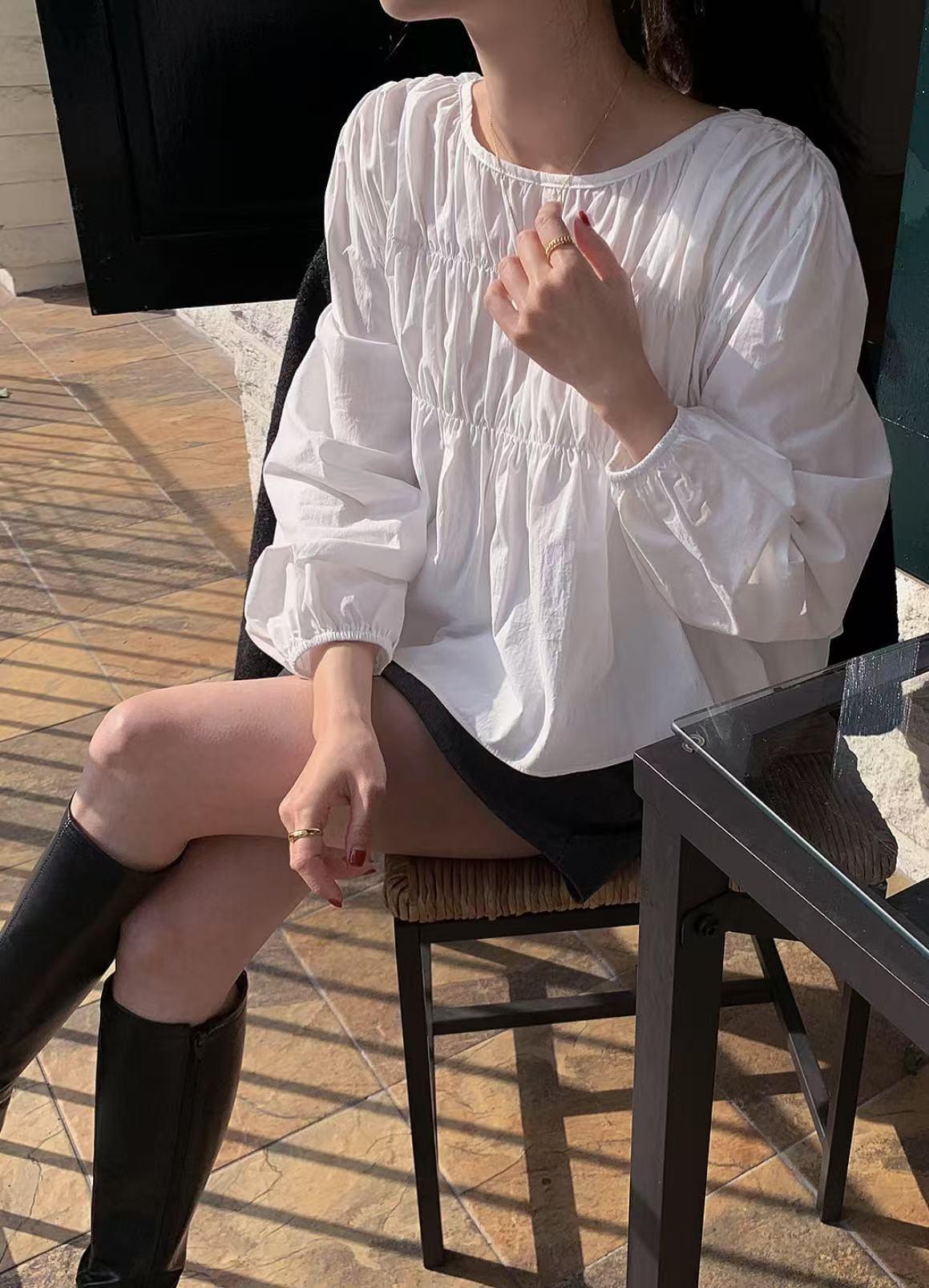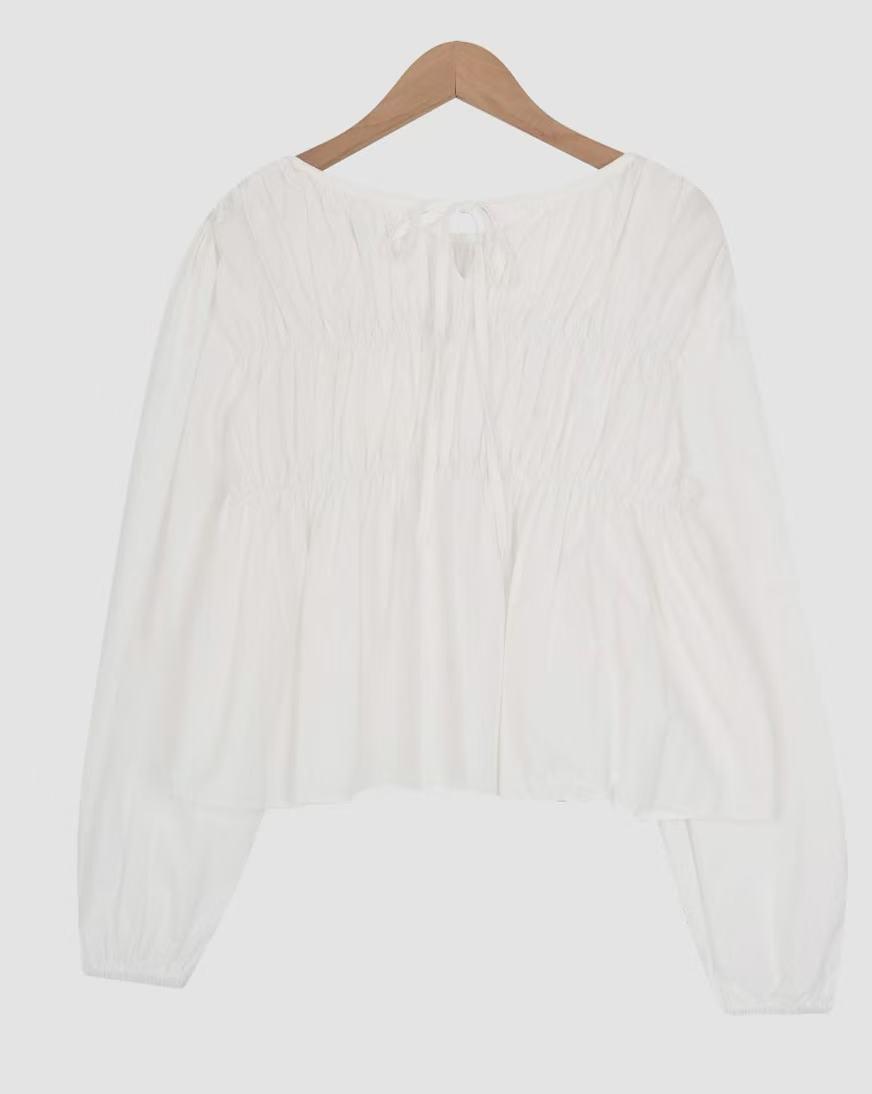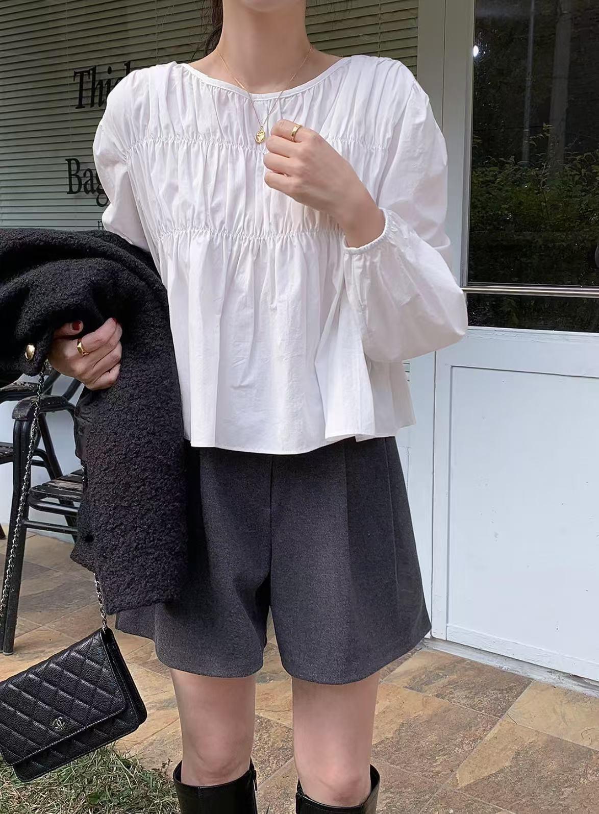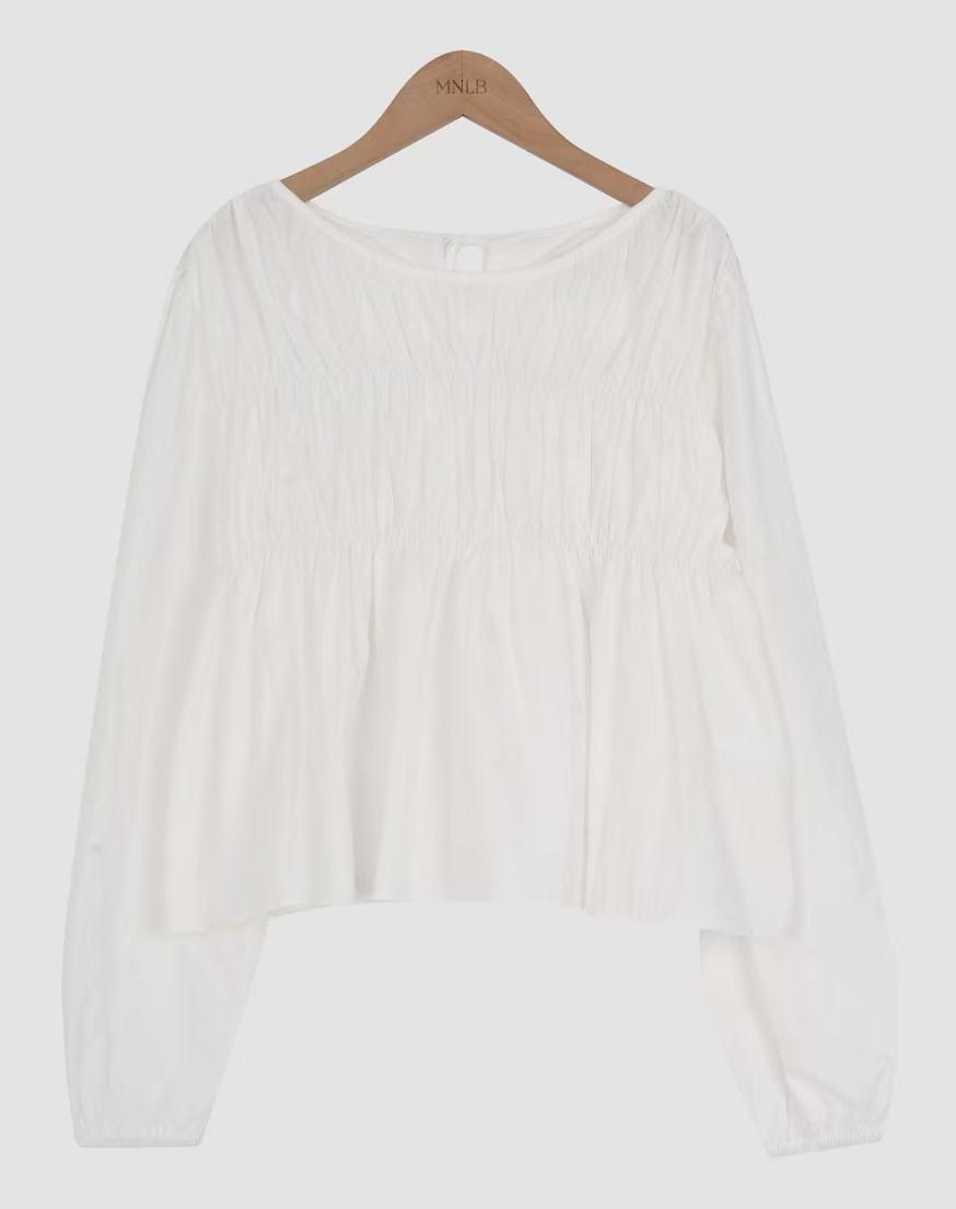 Camisa Chic de Cuello Redondo Plisada Holgada de Manga Larga para Mujer de Corea del Sur